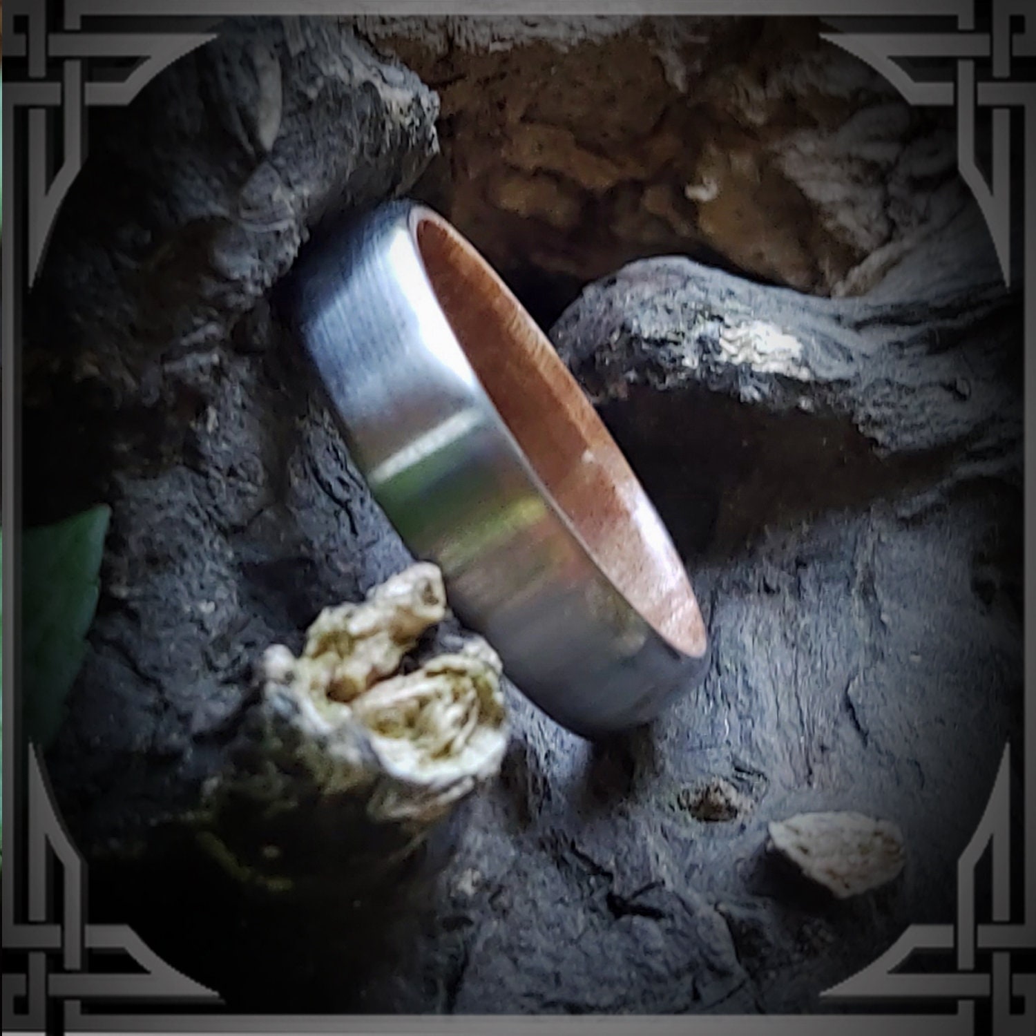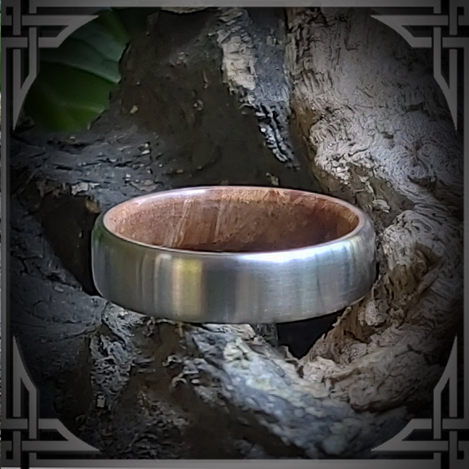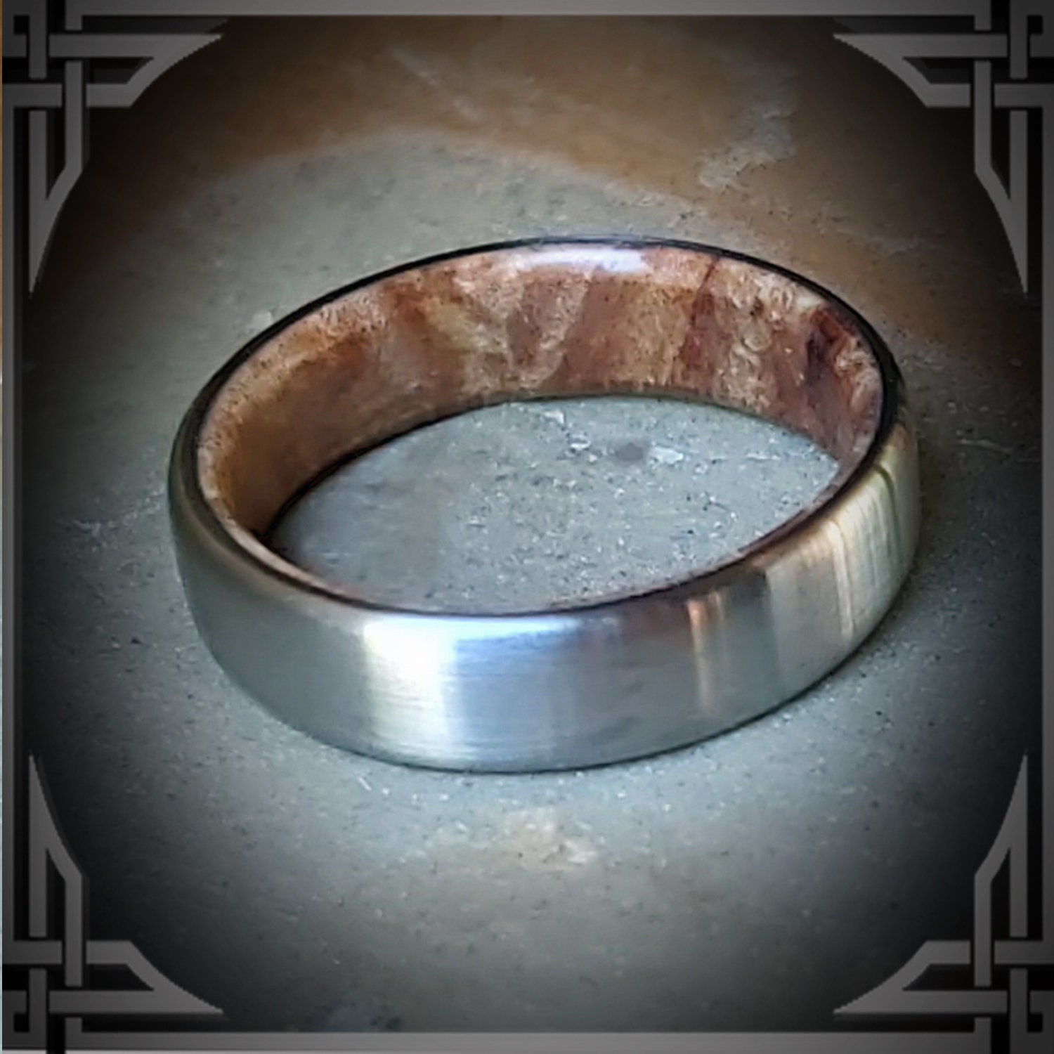 This ring is made from Hand Brushed Titanium with a Maple Burl Wood Core.
