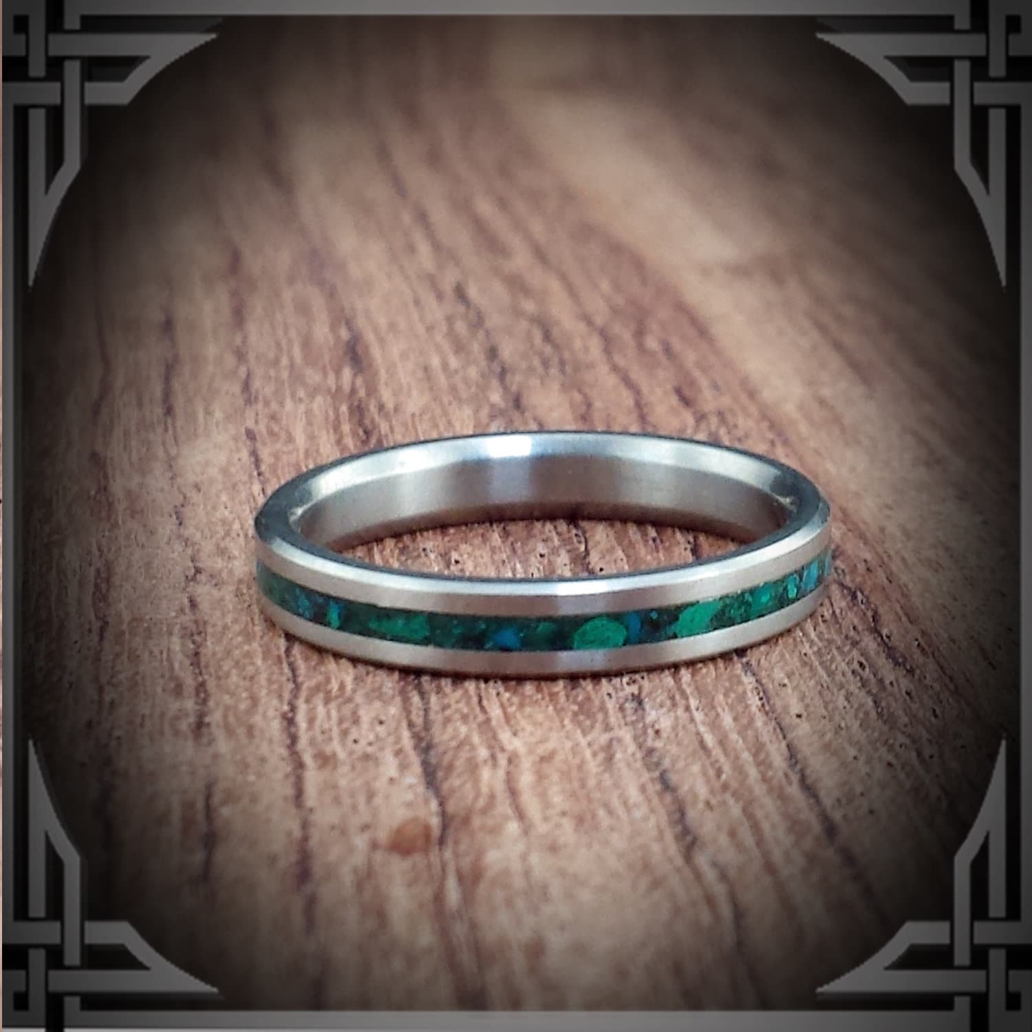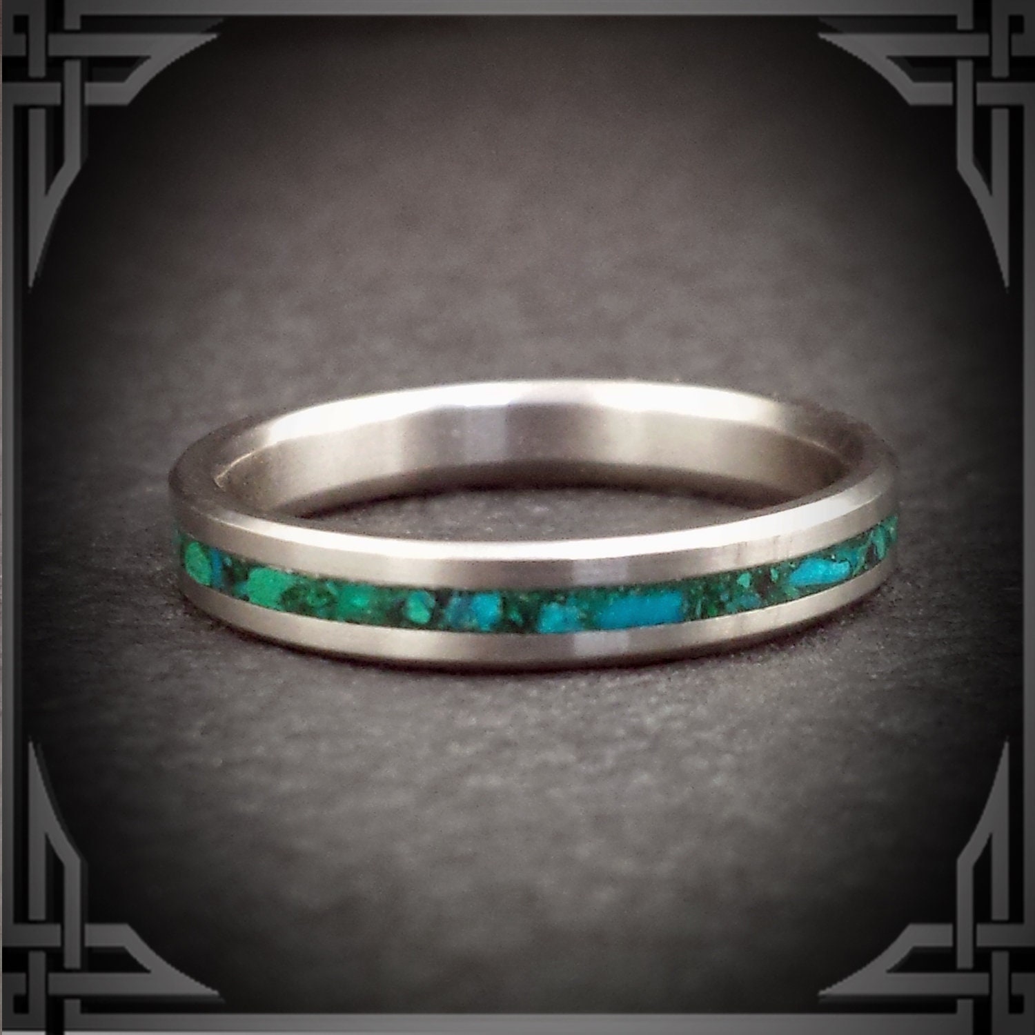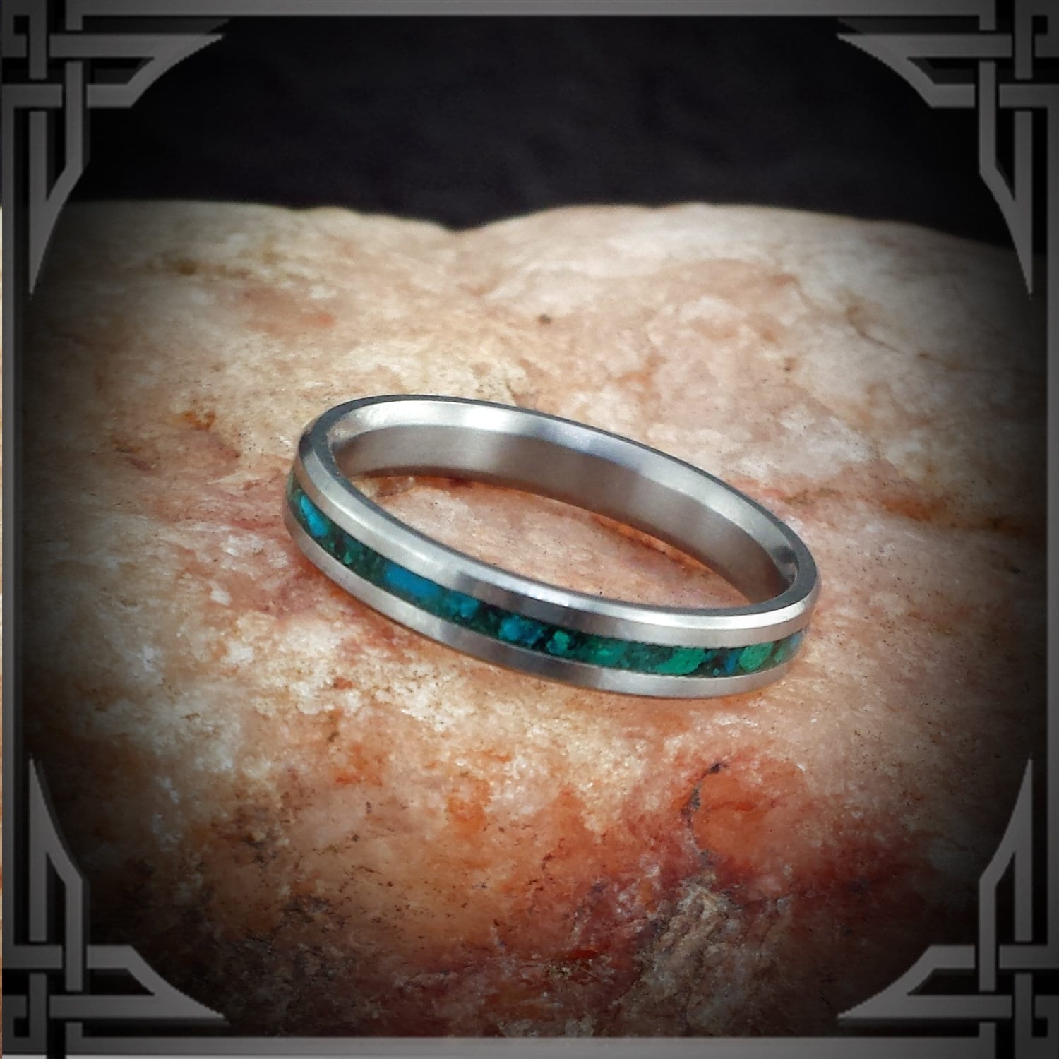 This ring is Made in Canada from Titanium with a Chrysocolla Stone Inlay.