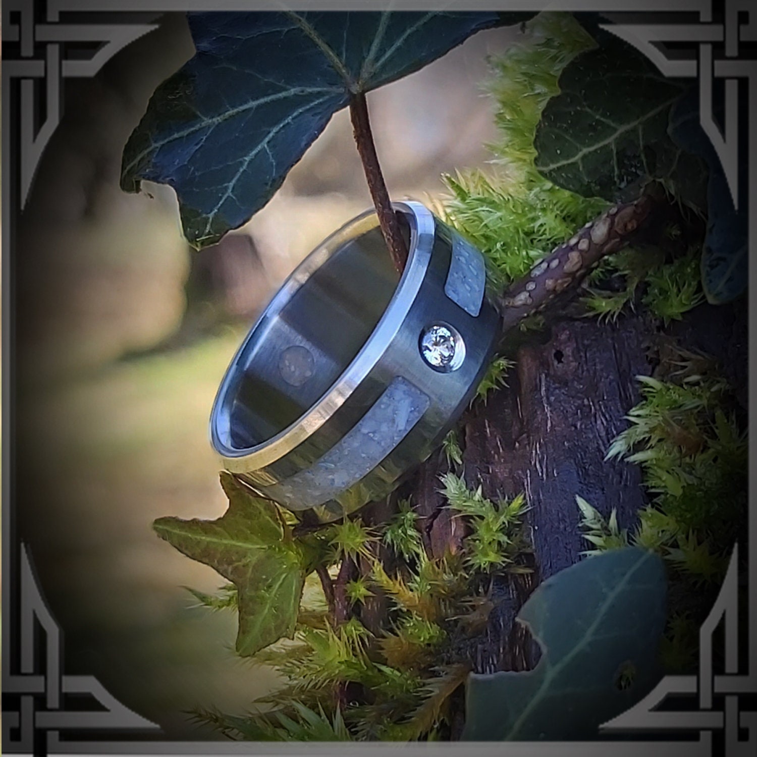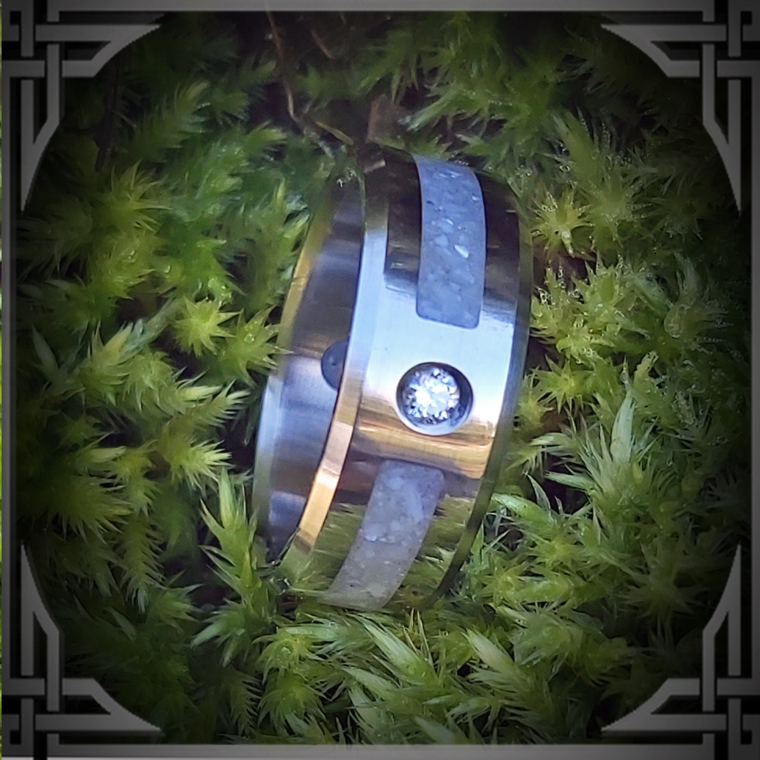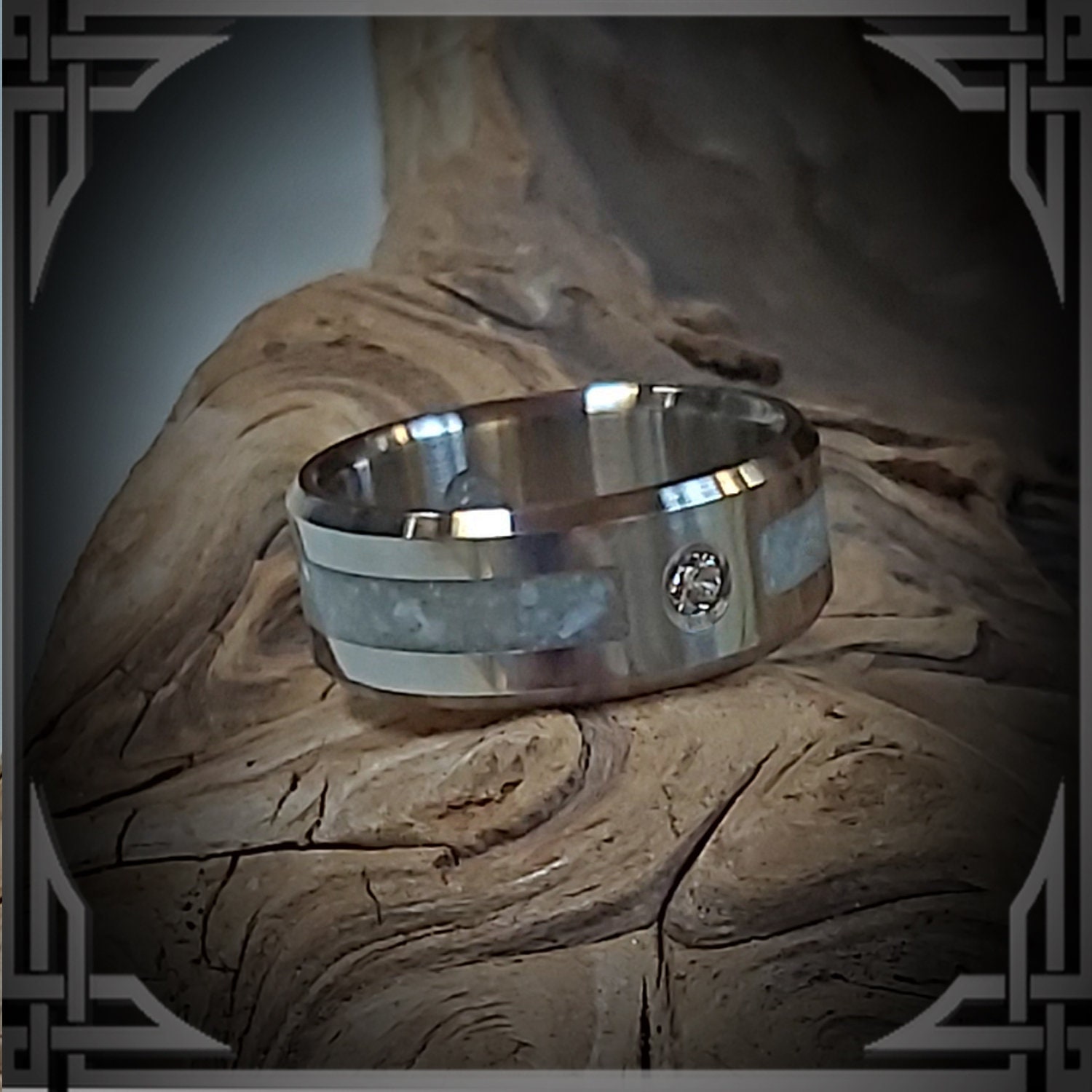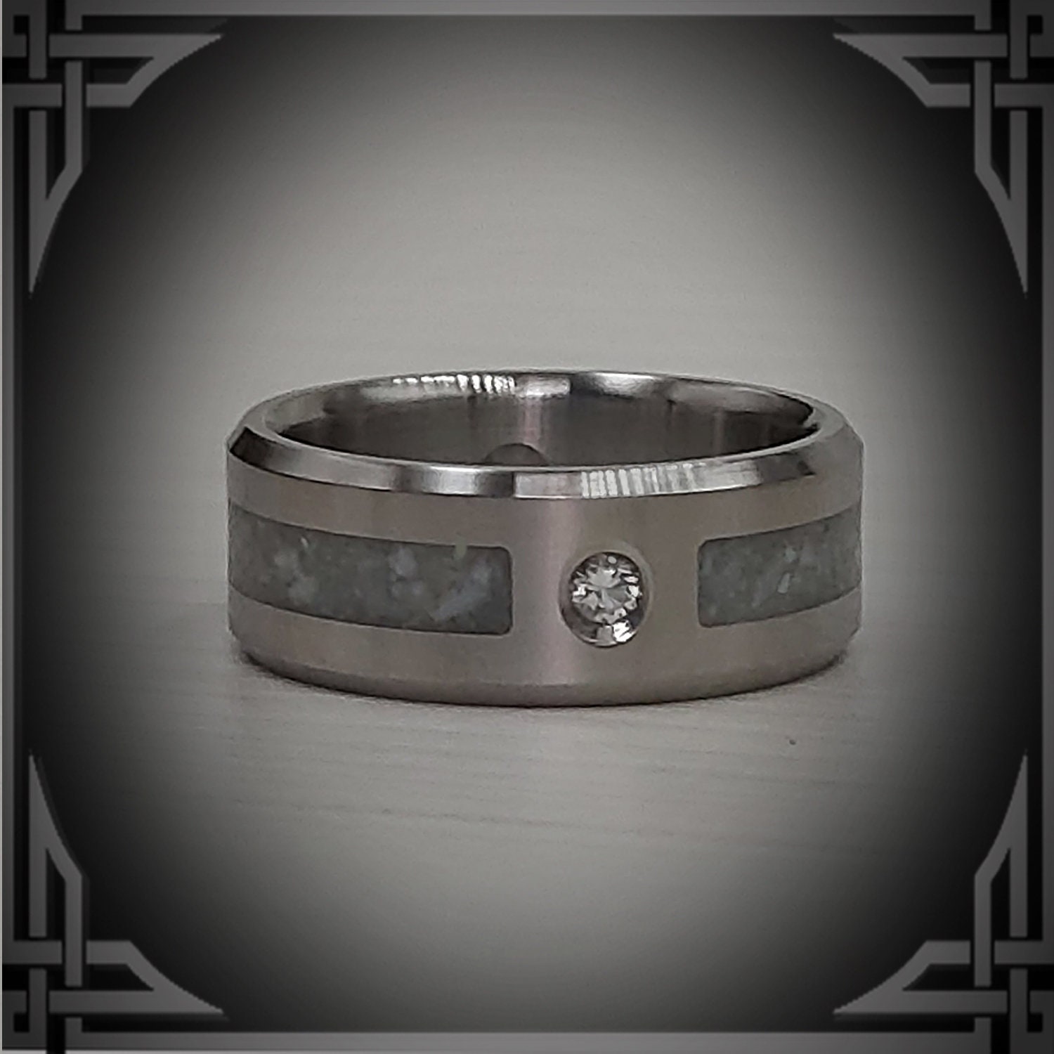 This ring is handmade from Titanium with a 2mm Diamond & Wide Groove Pearl Inlay.
