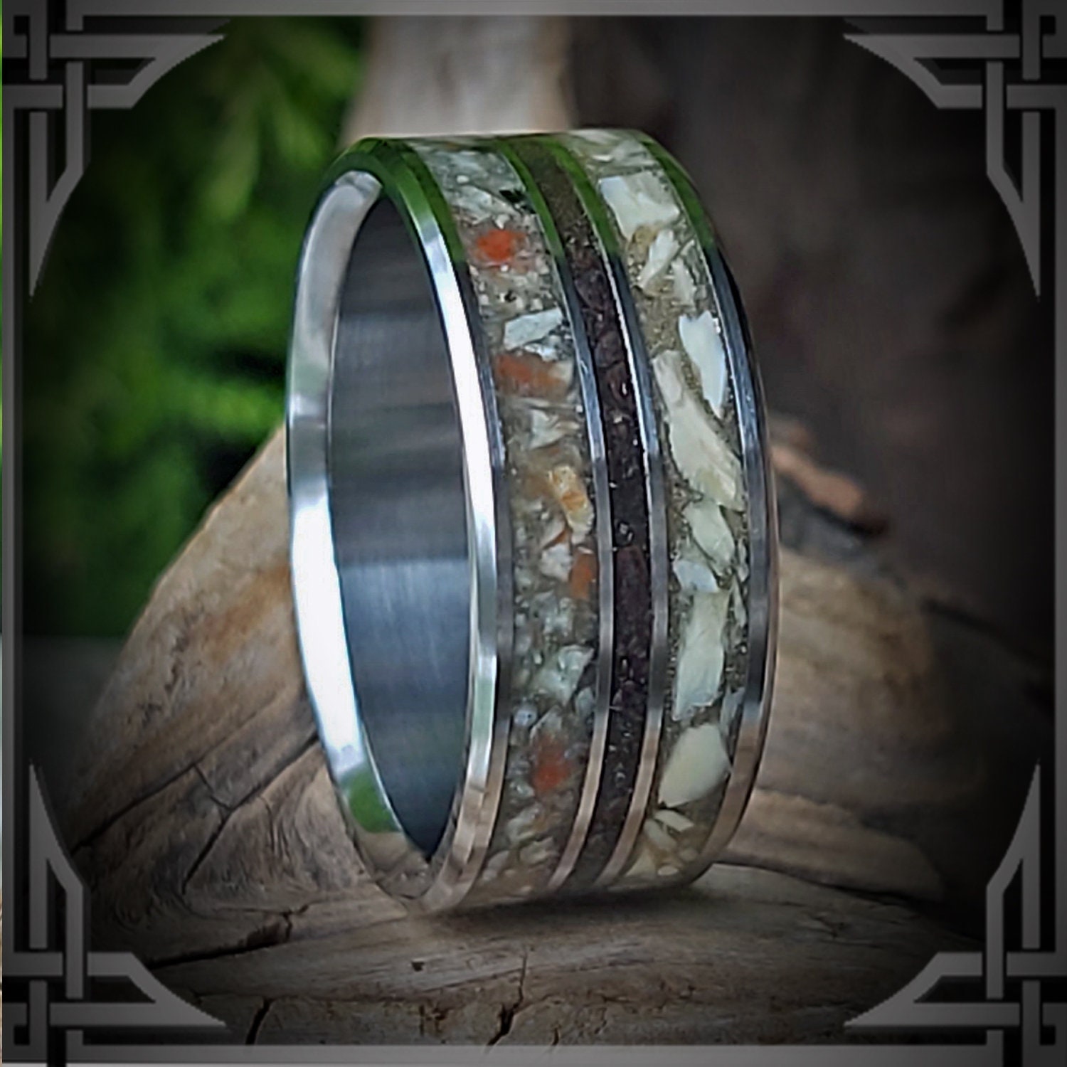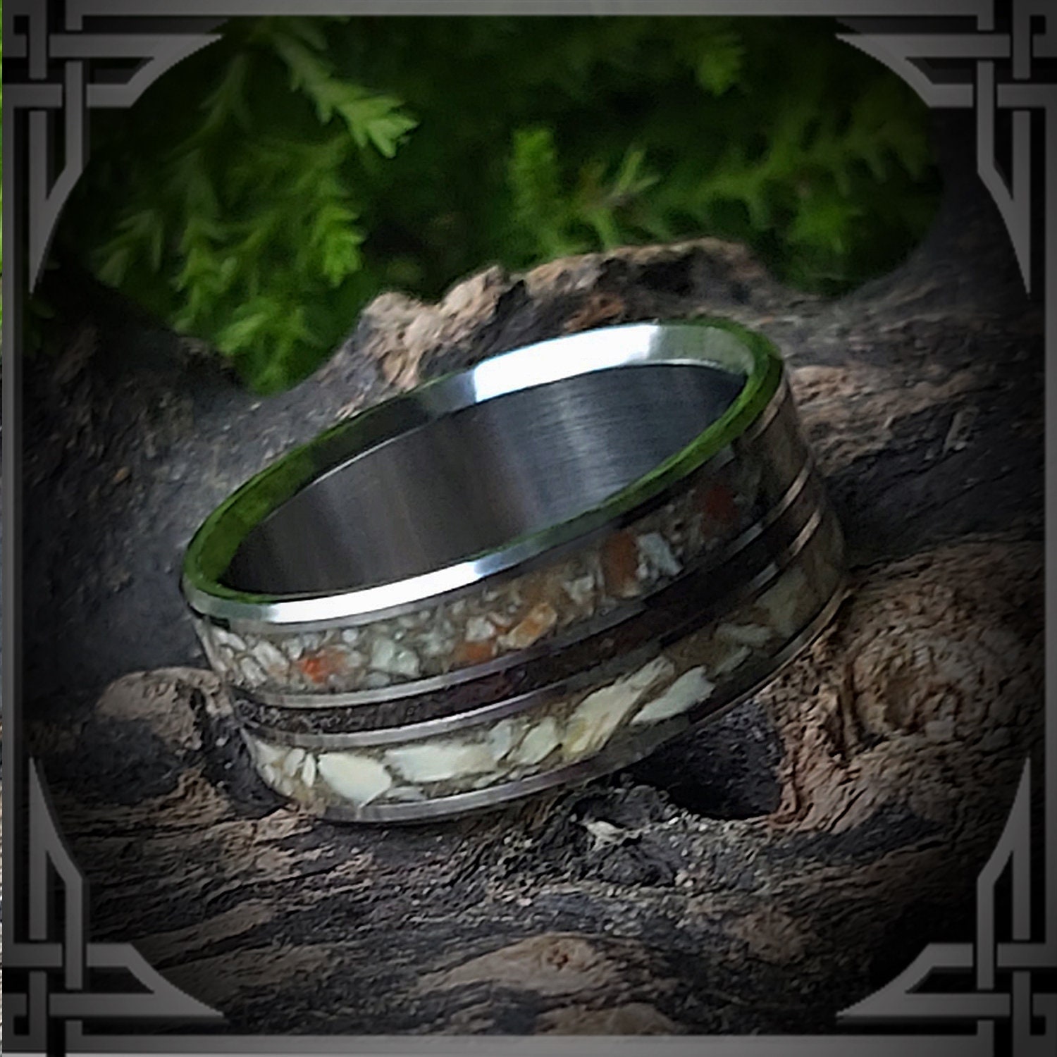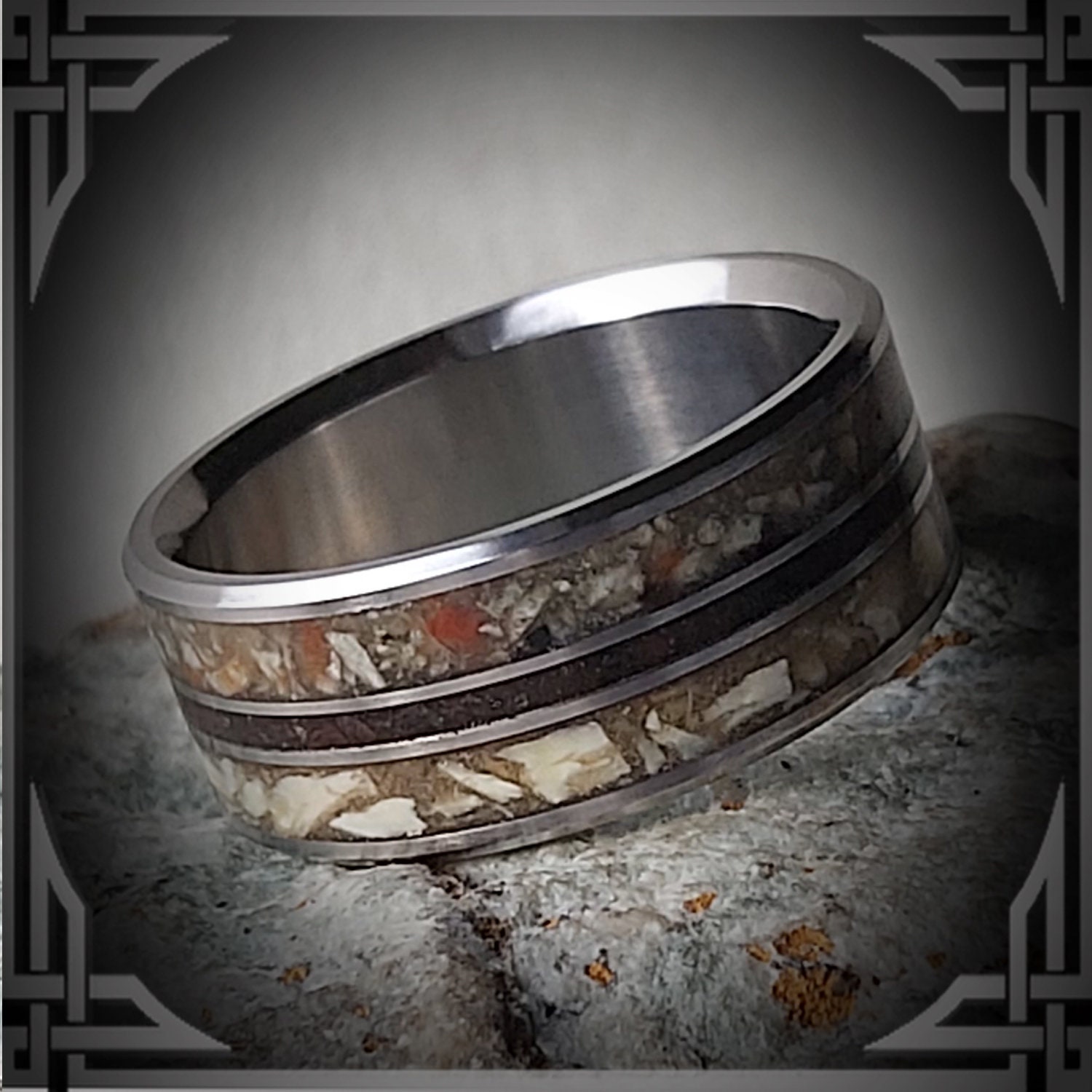 This ring is handmade in Canada from Titanium with Rear ; Coprolite (fossilized dino poo), Meteorite & Dinosaur Bone Inlay.