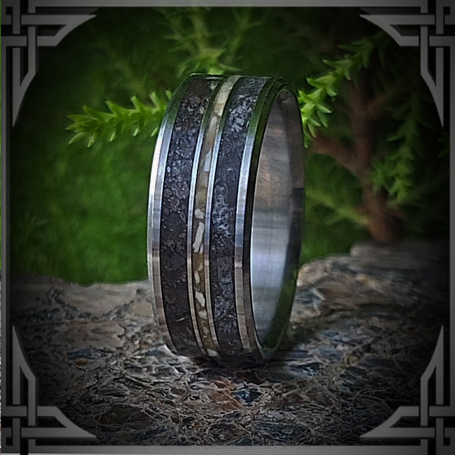 This ring is handmade in Canada from Titanium with Rear ; Fossilized Dinosaur Bone, Dinosaur Bone and Meteorite Inlay.