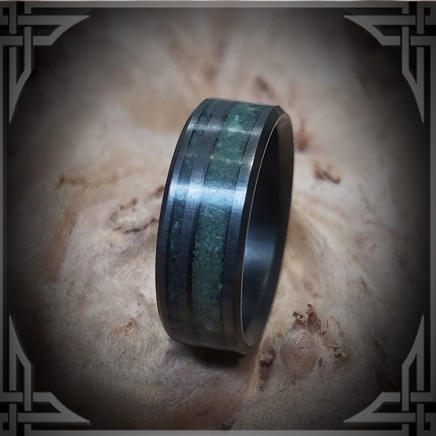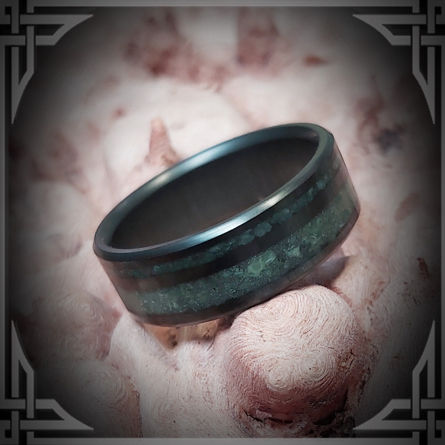 This Ring is made of B.C. Green Jade Inlay into Solid Carbon Fiber.