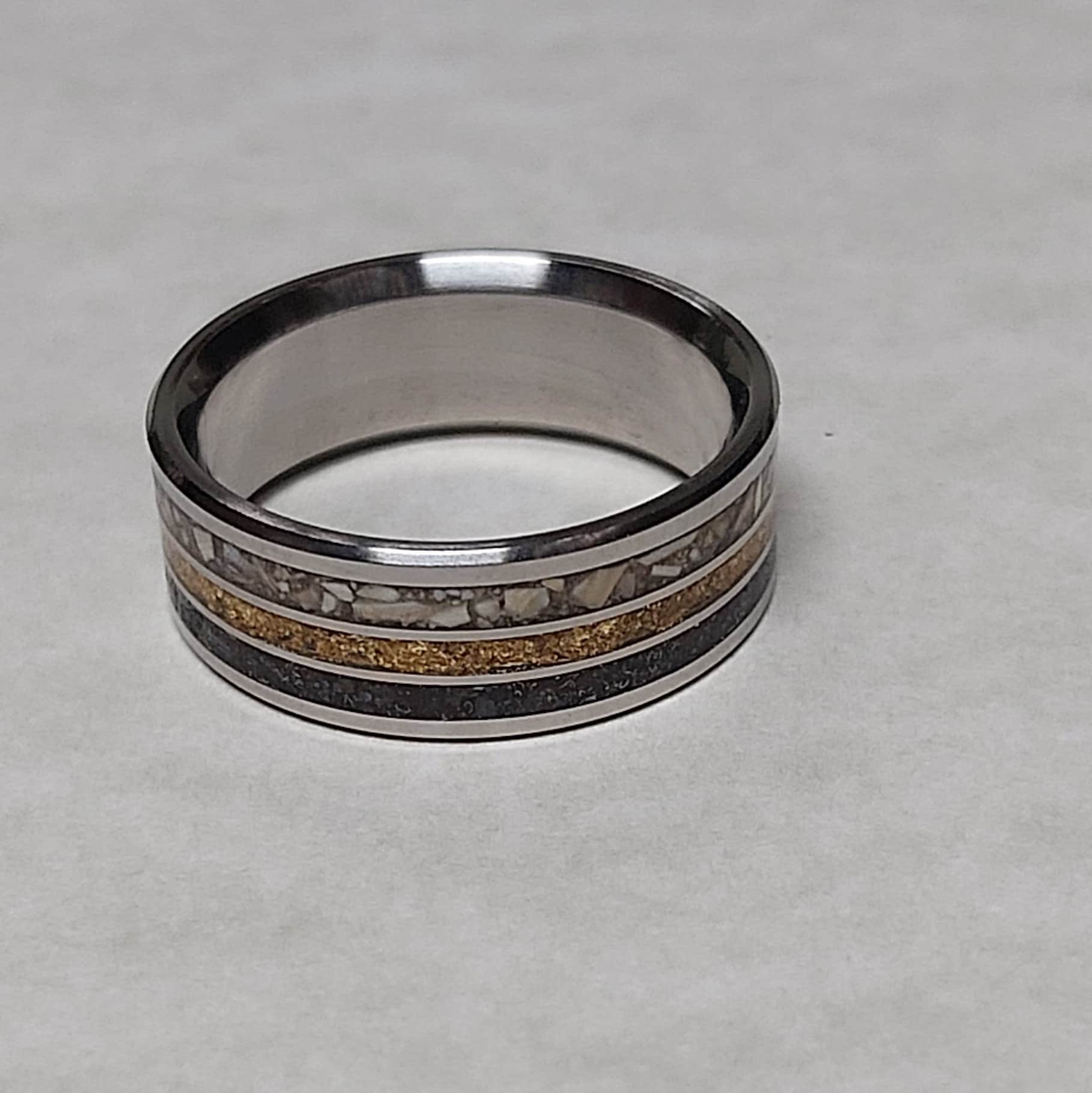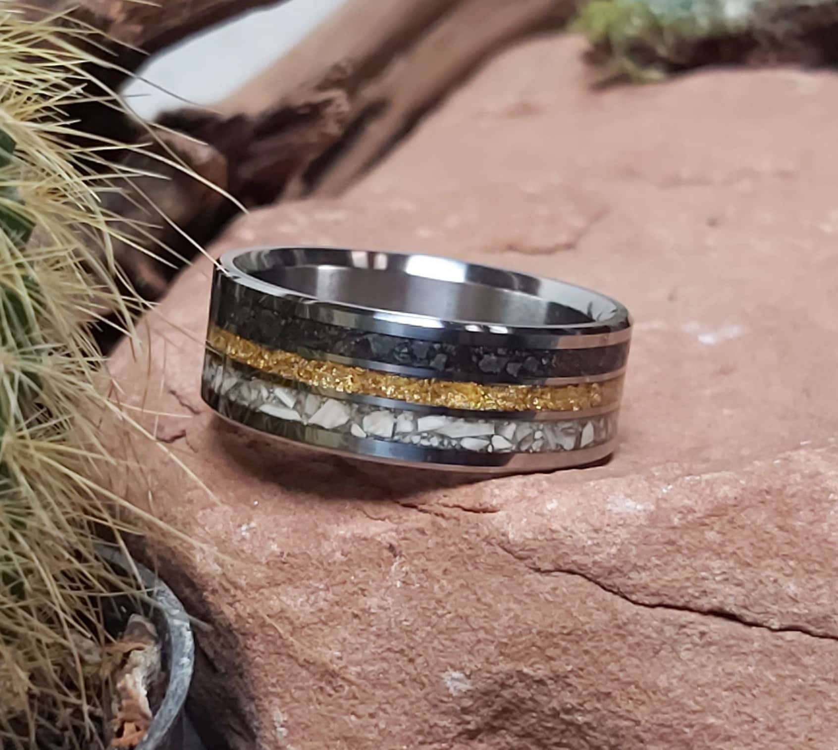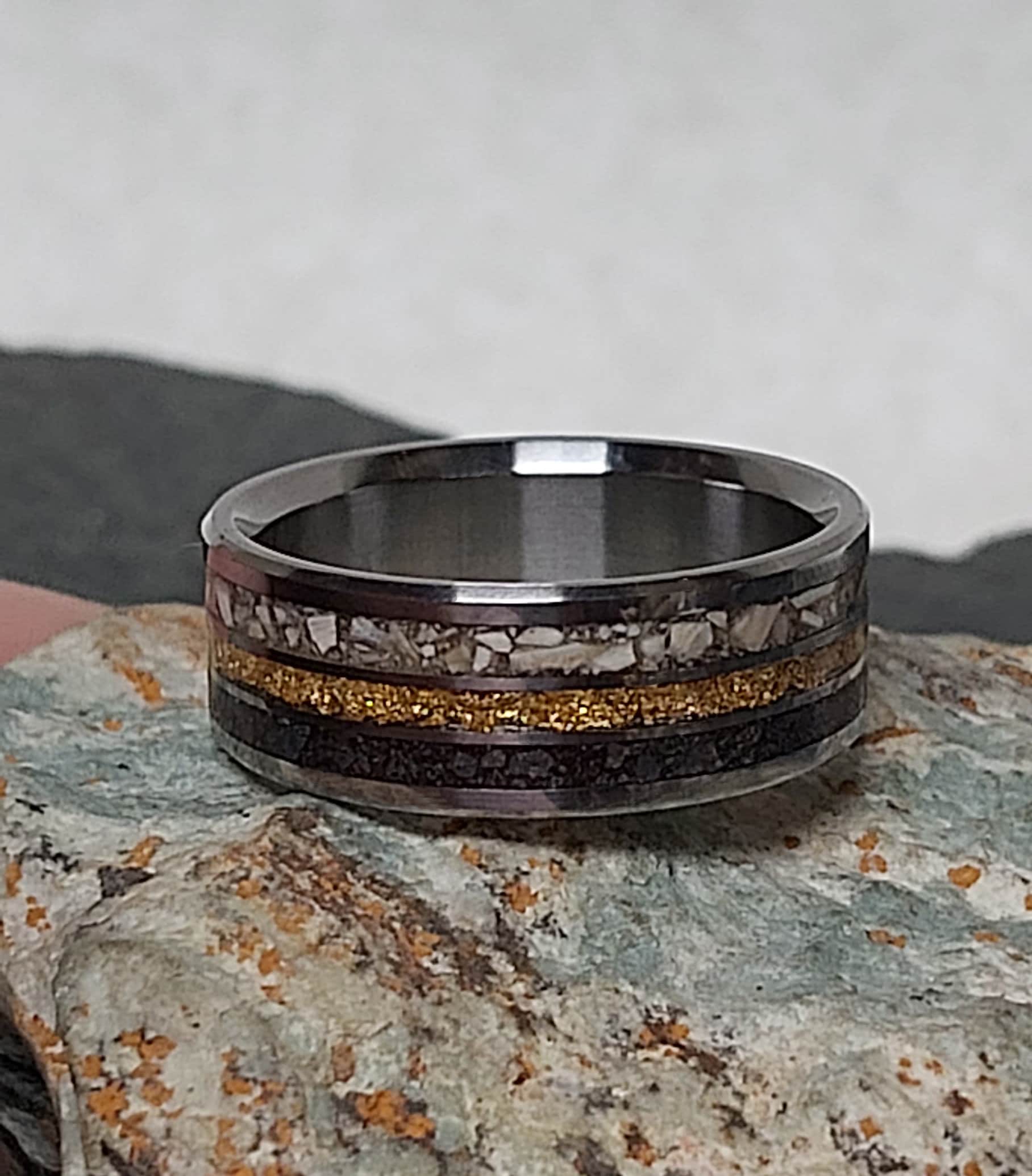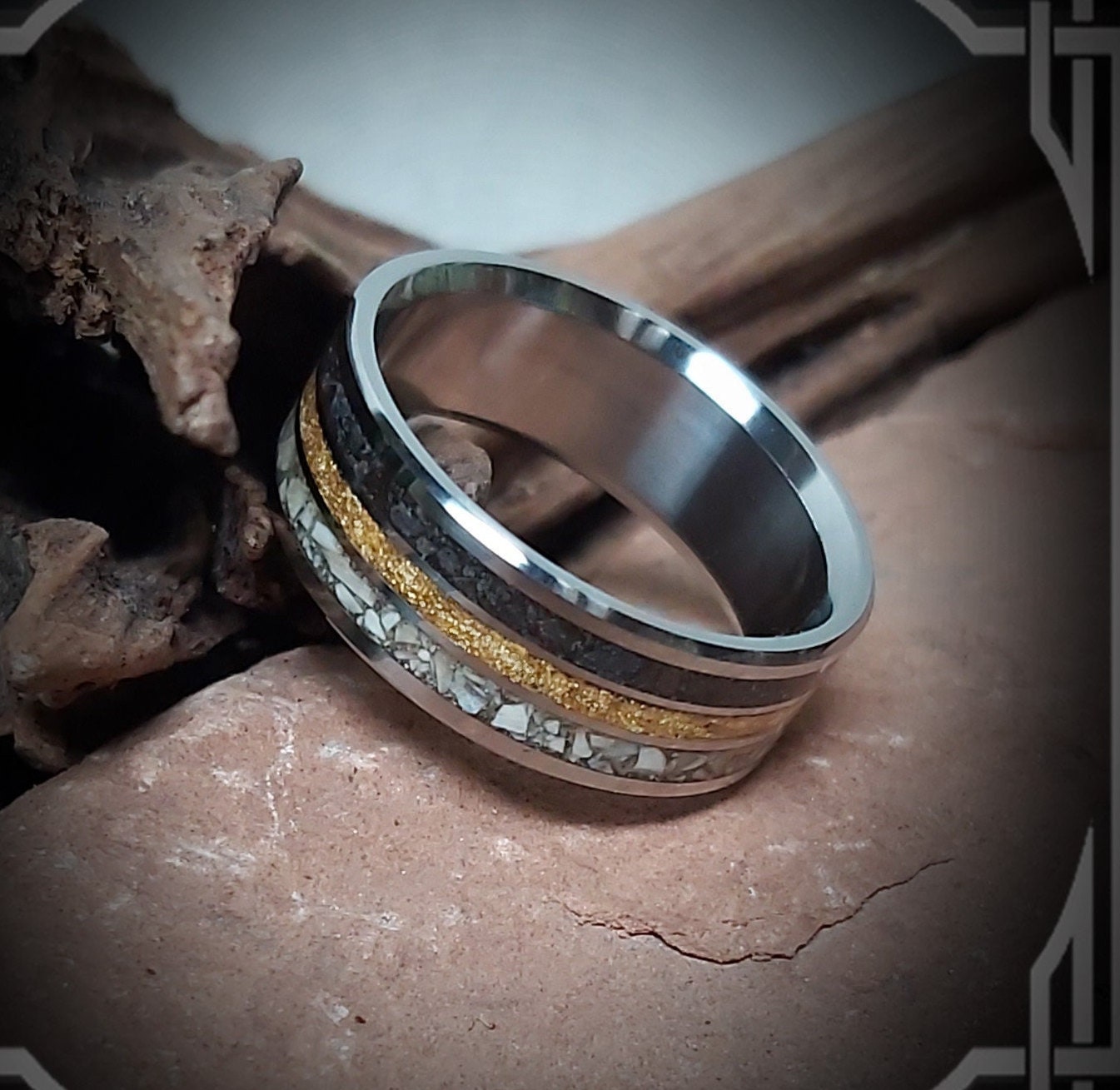 This ring is handmade in Canada from Titanium with a Mosasaurs Dino Tooth, 24 Karat Gold and Meteorite Inlay.