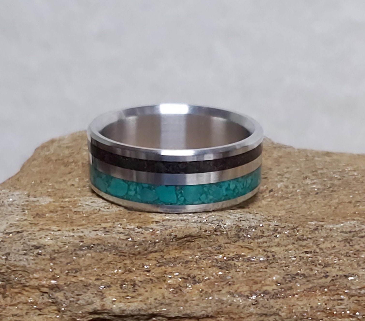This ring is handmade from 925 Sterling Silver, Hand Casted by us with ; Meteorite and Turquoise Inlay. Made in Canada