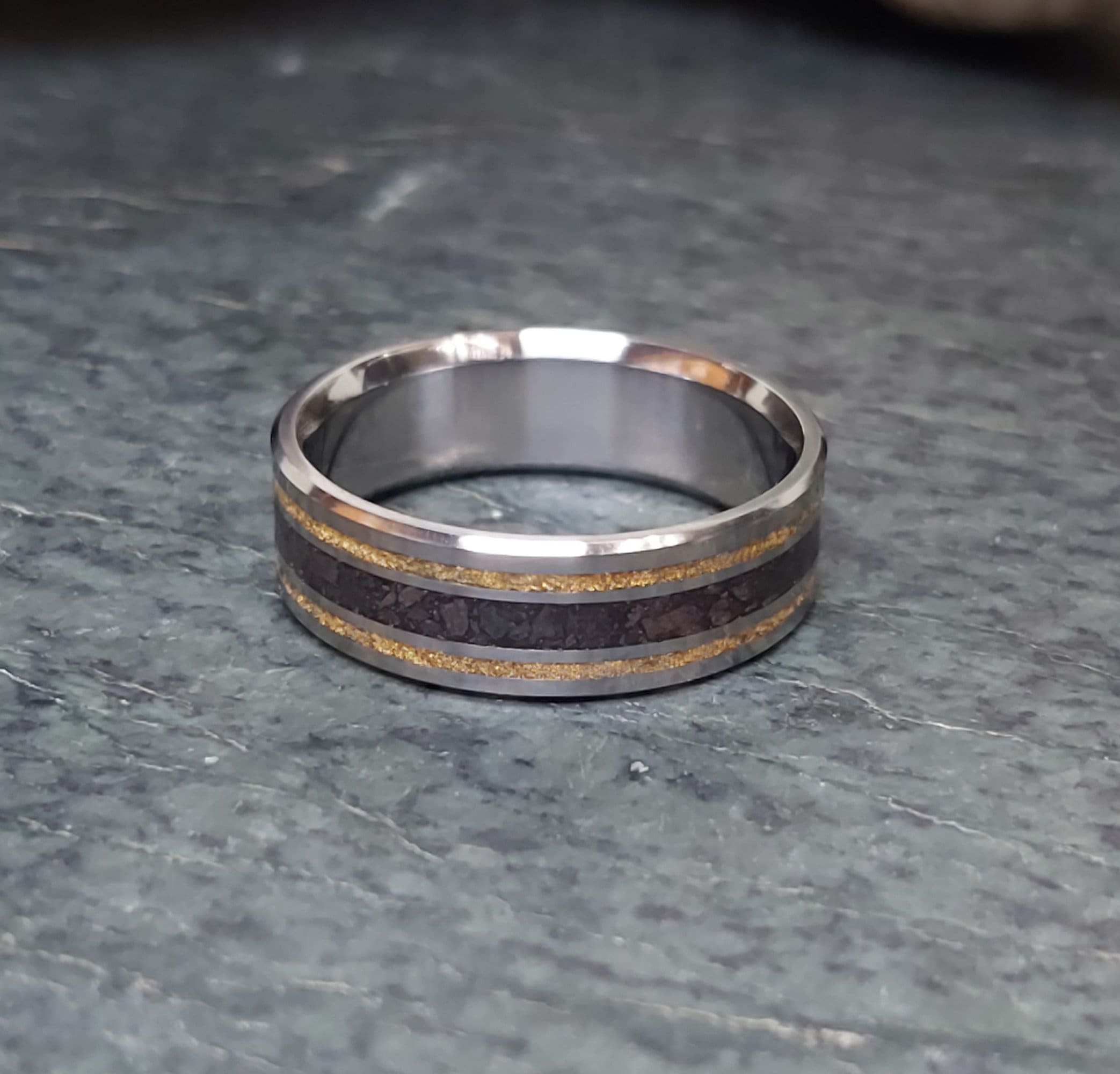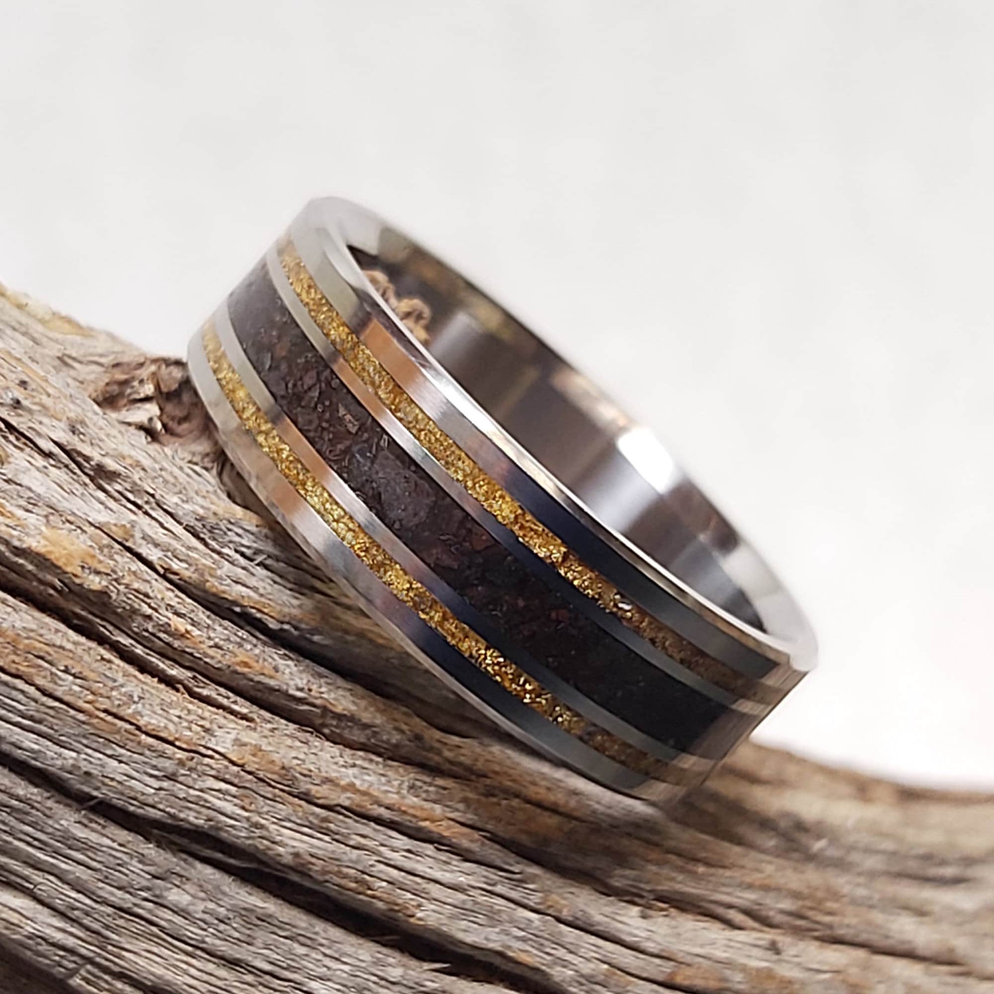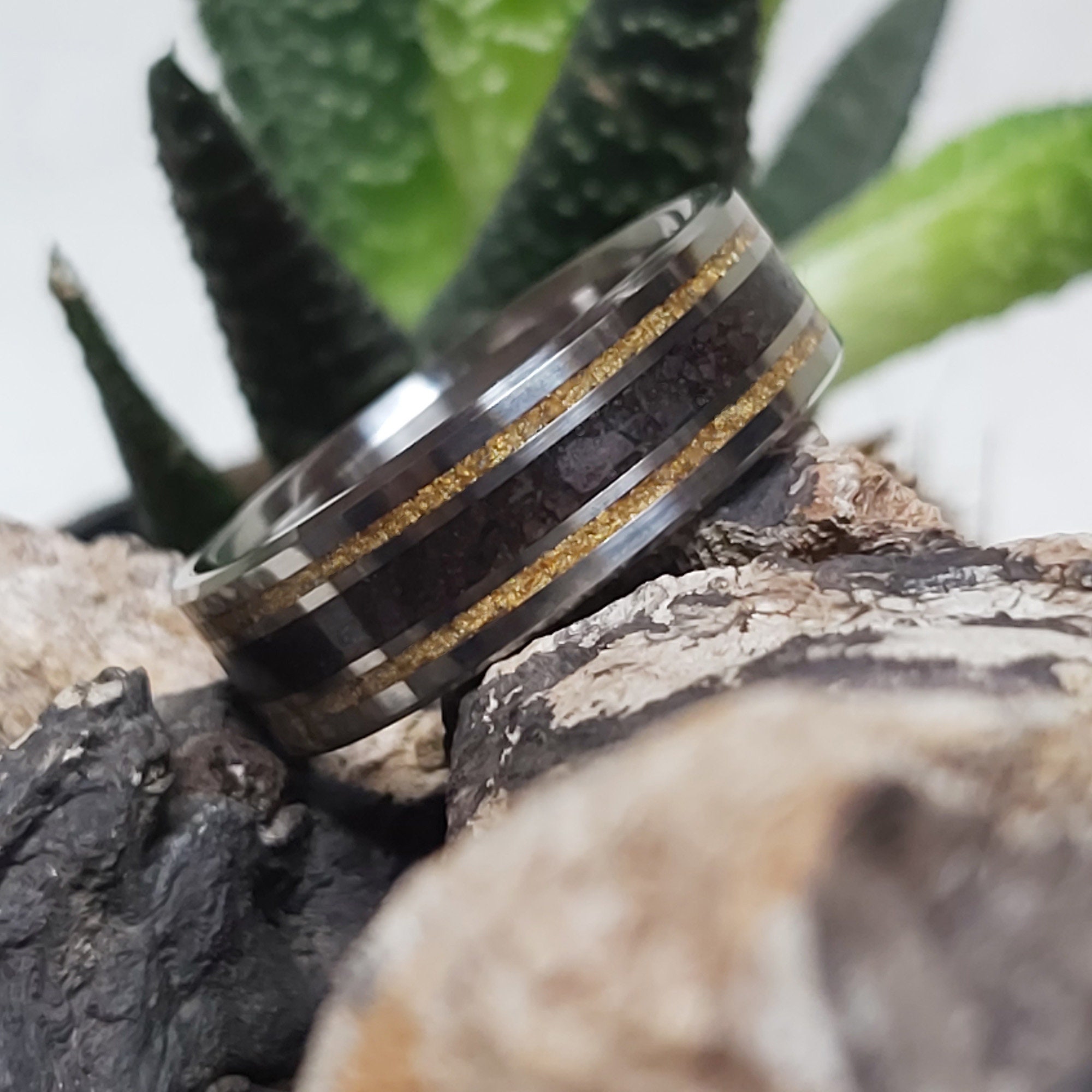 This ring is handmade from Titanium with a 24 Karat Gold and Meteorite Inlay.