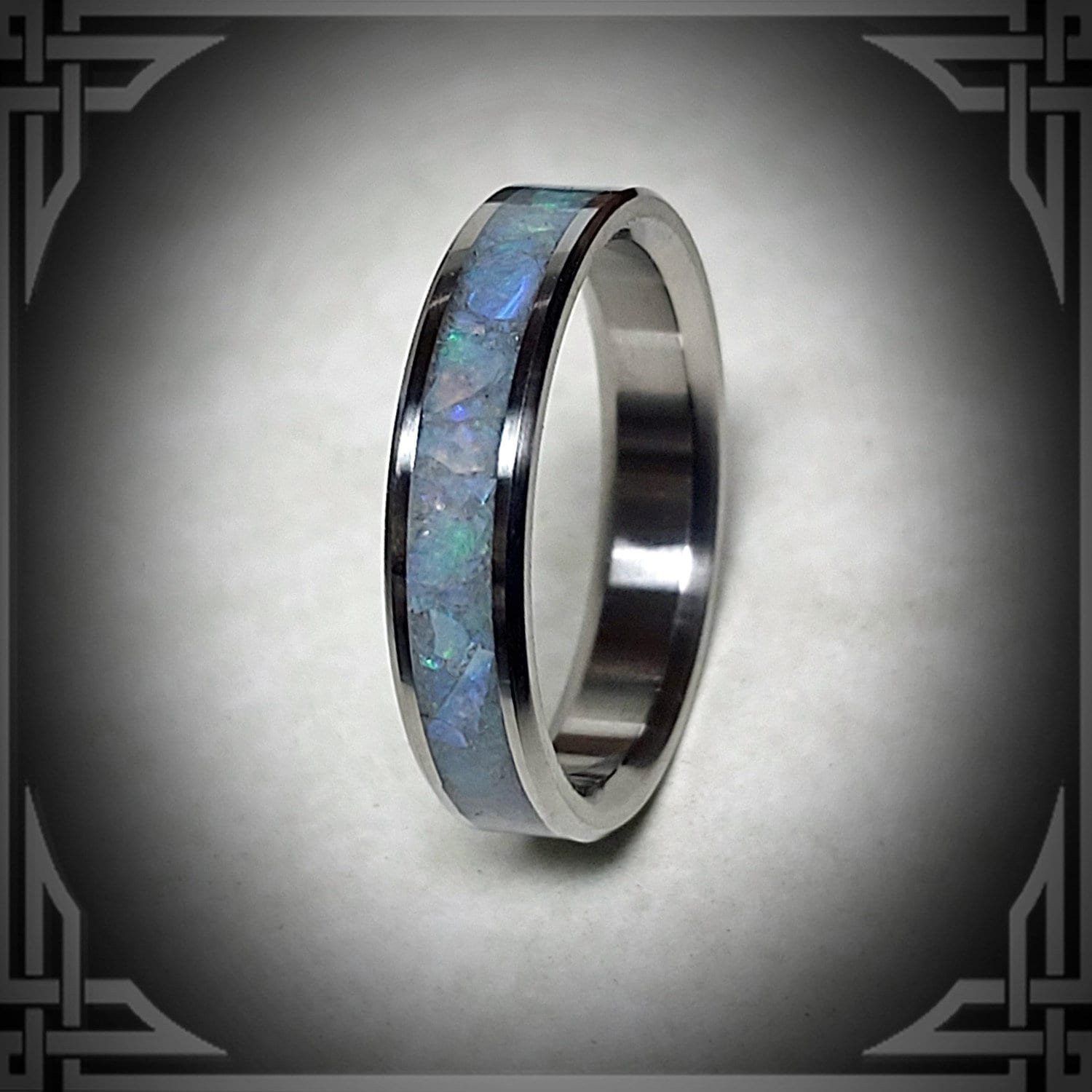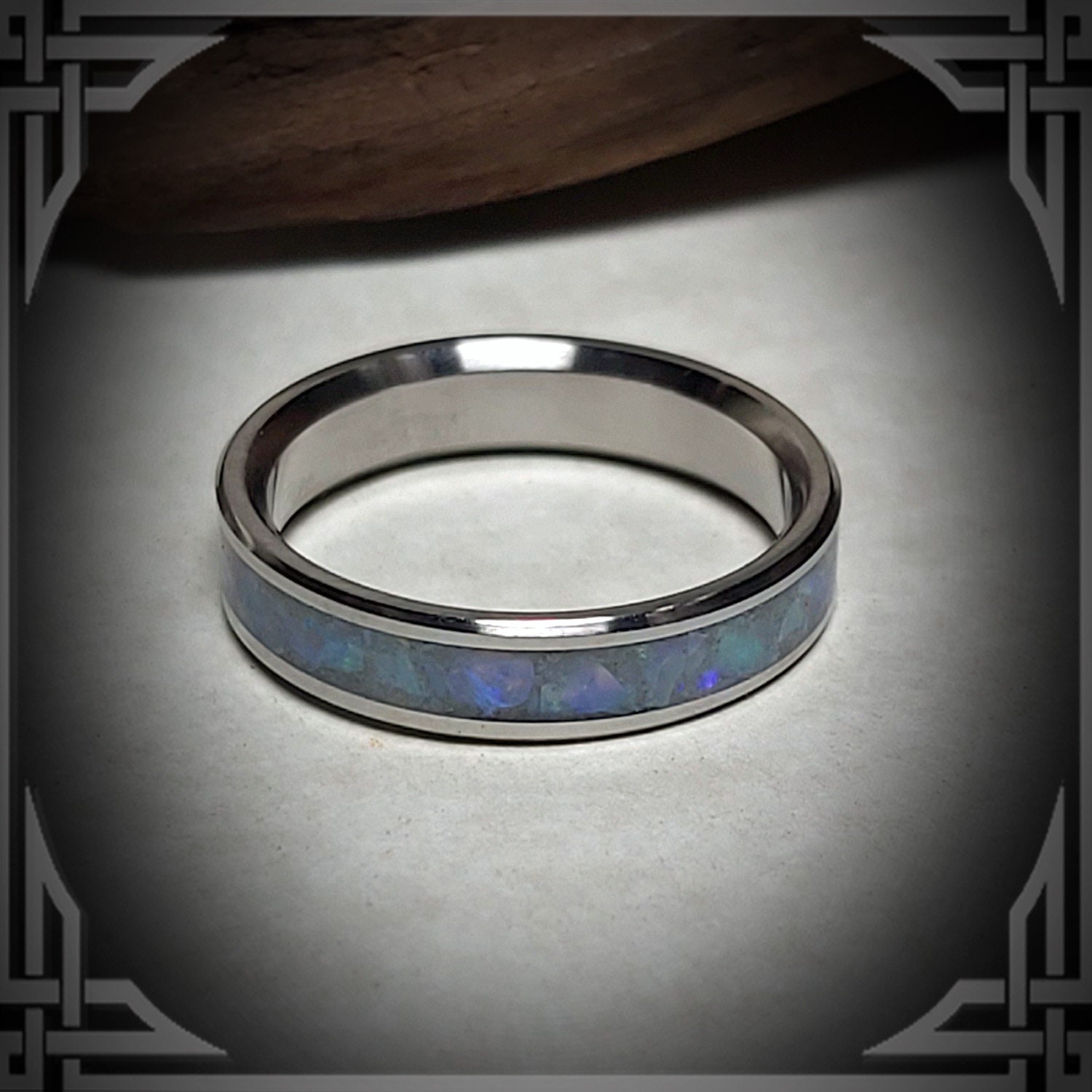 This Beautiful Ring is handmade in Canada from Titanium with an Australian Opal Stone Inlay. (wide grove)