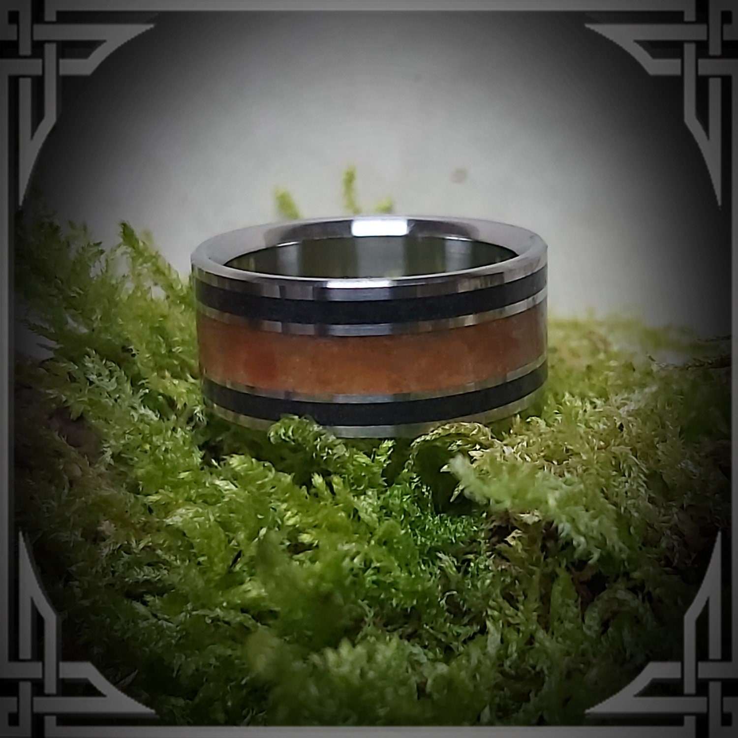 This ring is handmade in Canada from Titanium with Mexican Opal and Black Jade Inlays.