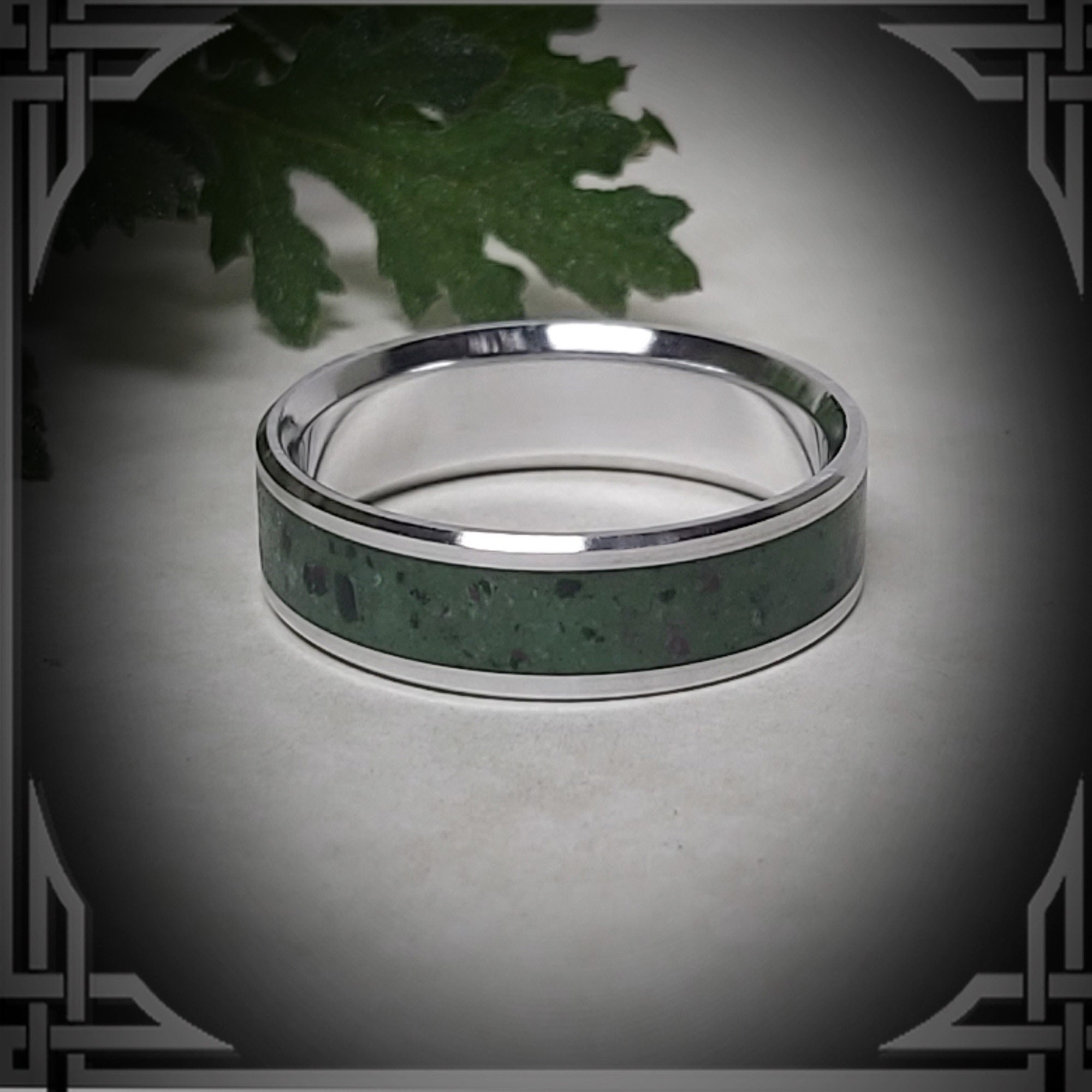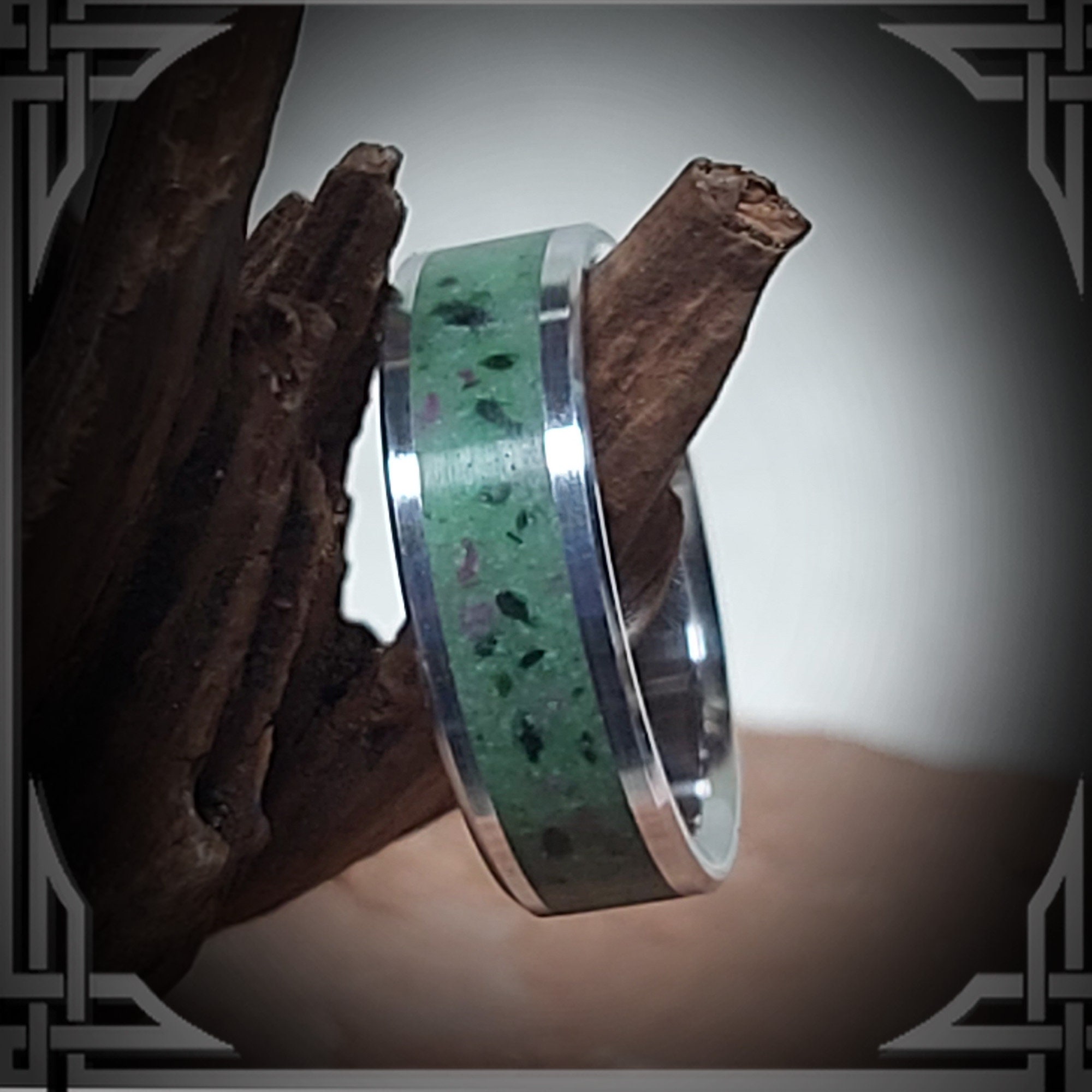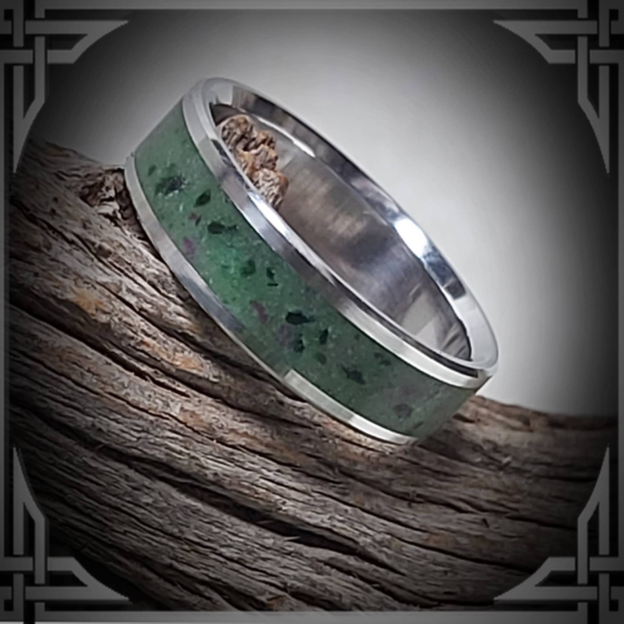 This ring is hand cast by us from 925 Sterling Silver with a Wide Groove Ruby in Zoisite Stone Inlay.