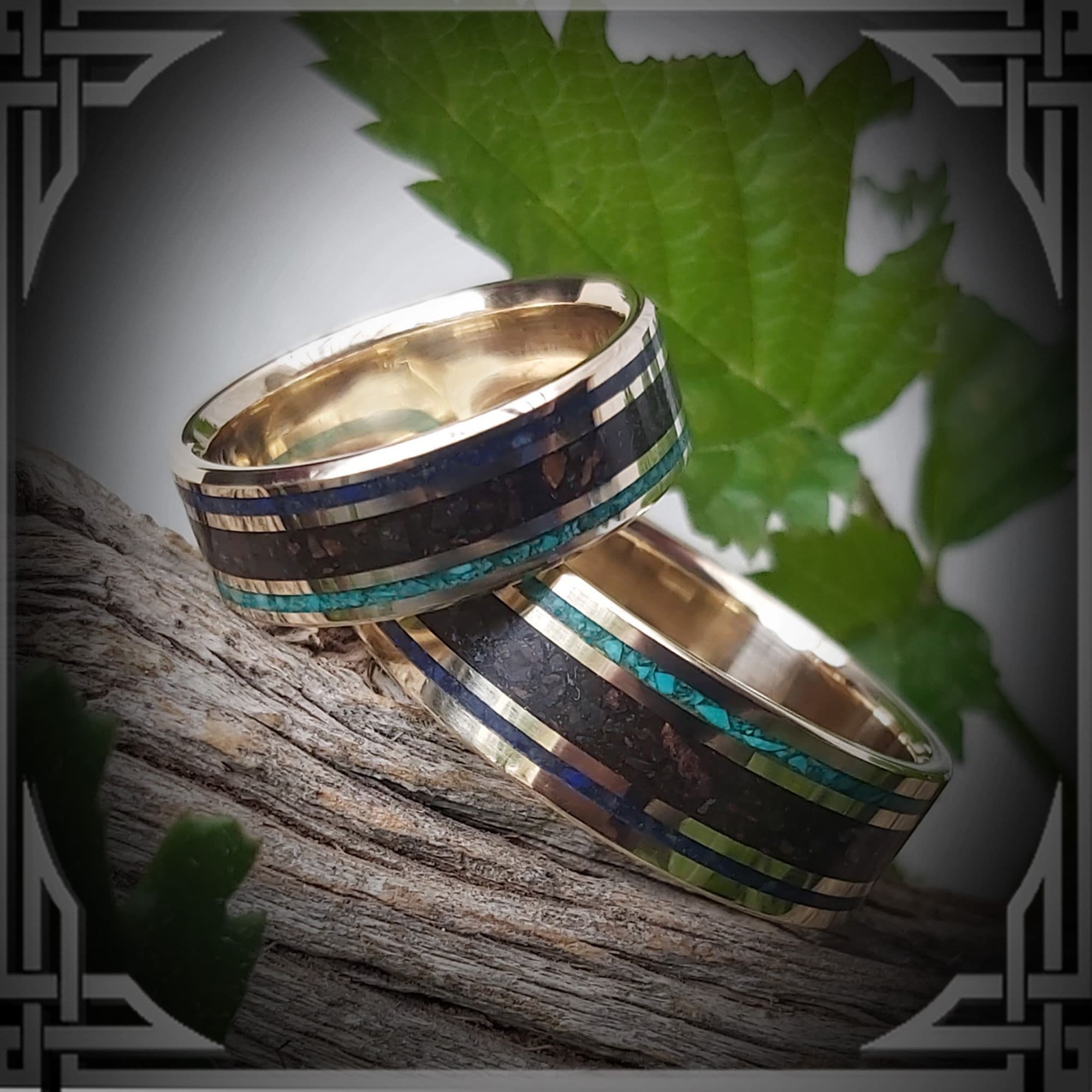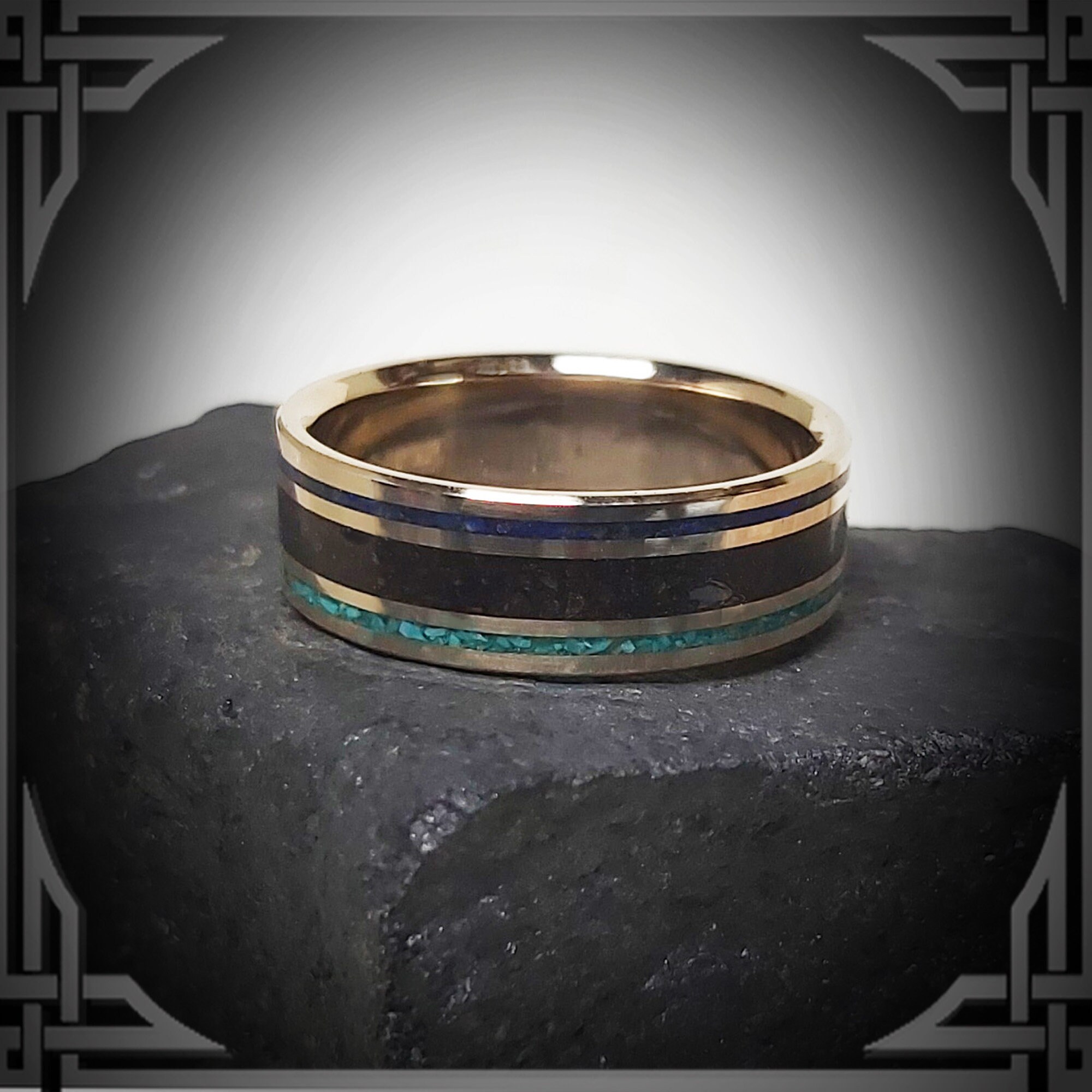 This ring is hand cast by us from 14 Karat Yellow Gold with Turquoise, Meteorite & Lapis Lazuli inlay.
