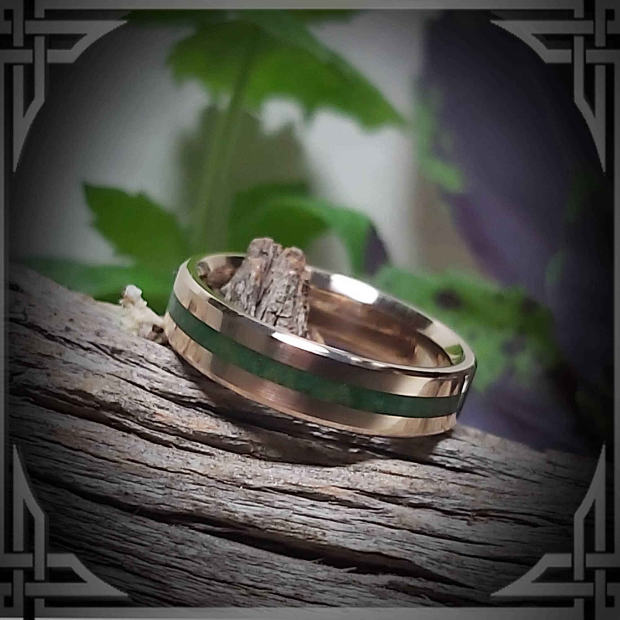 This ring is hand cast by us from 14 Karat Yellow Gold with a Narrow Malaysian Green Jade Inlay.