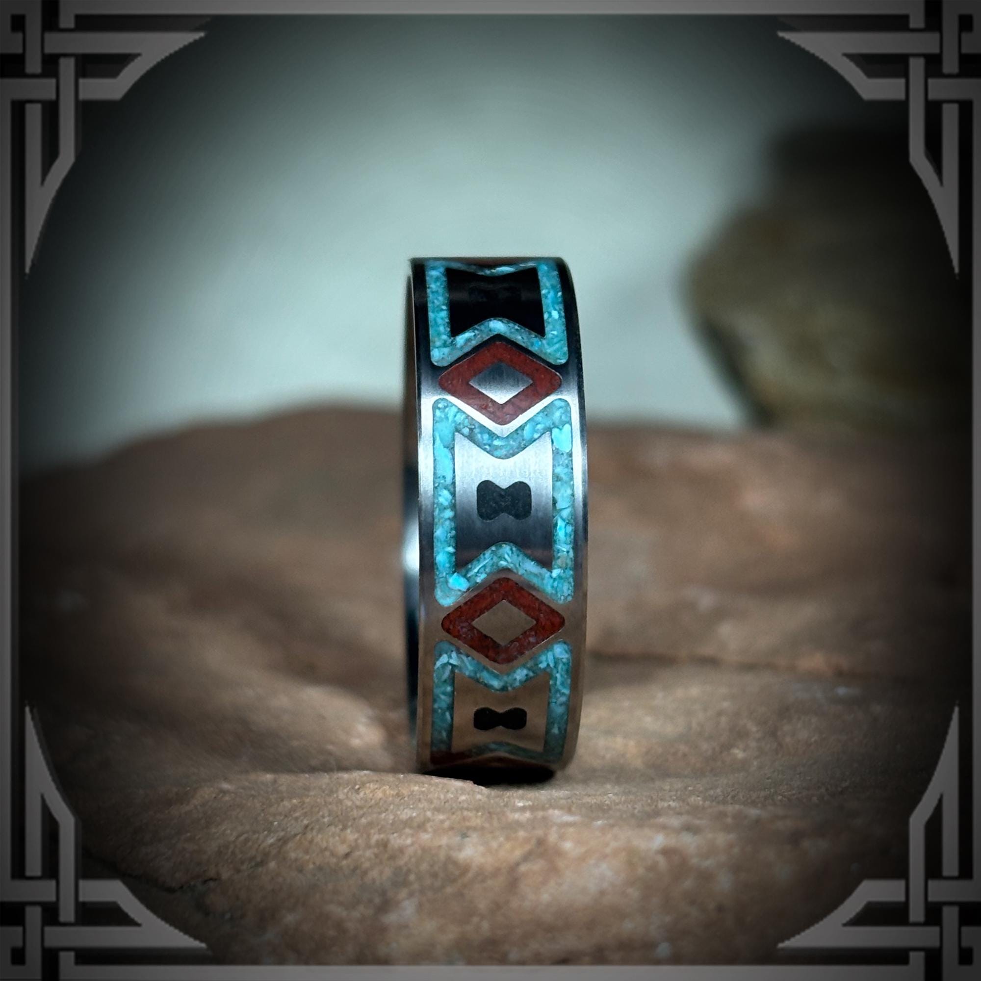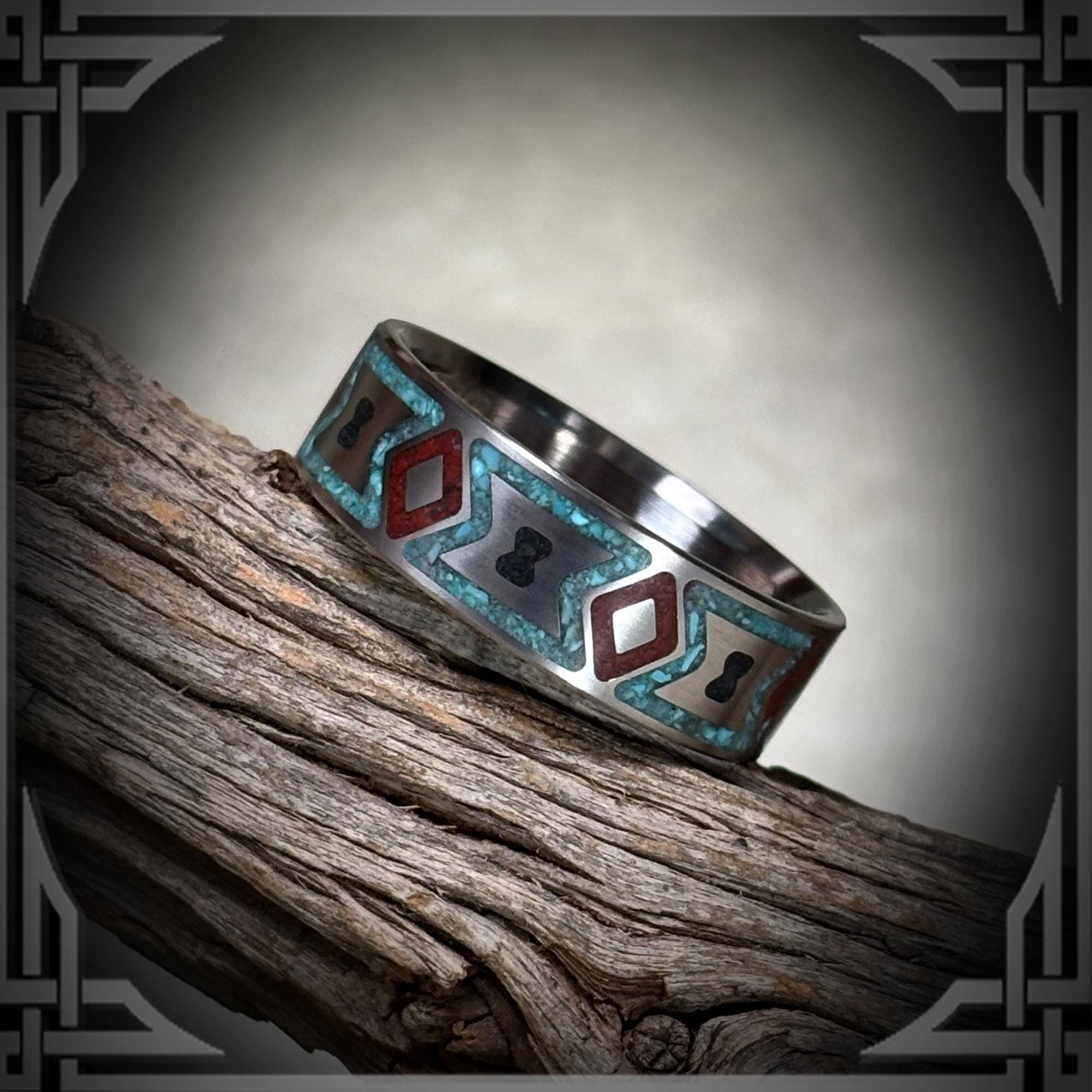 Turquoise, Red Jasper & Black Jade, Native American Pattern in Titanium.