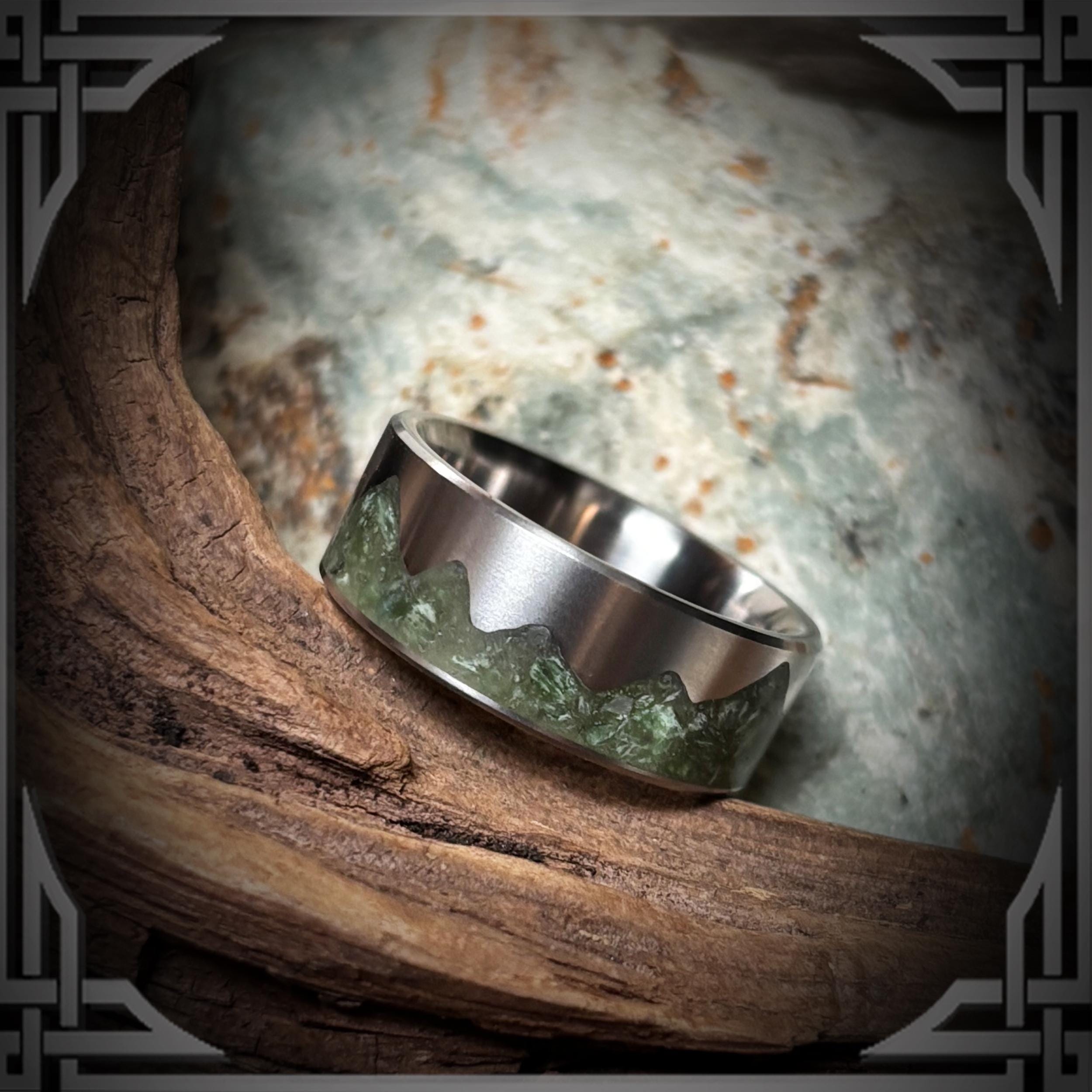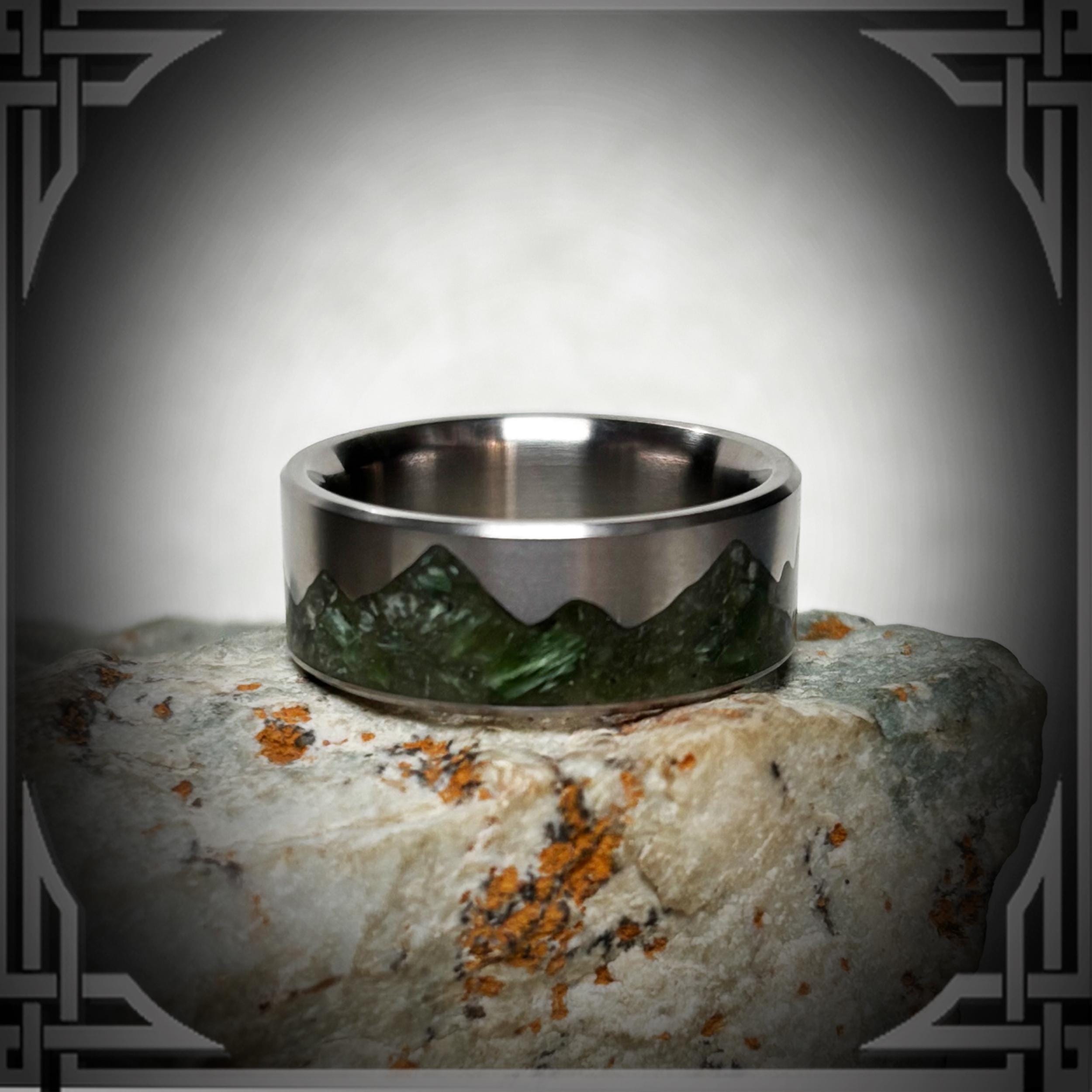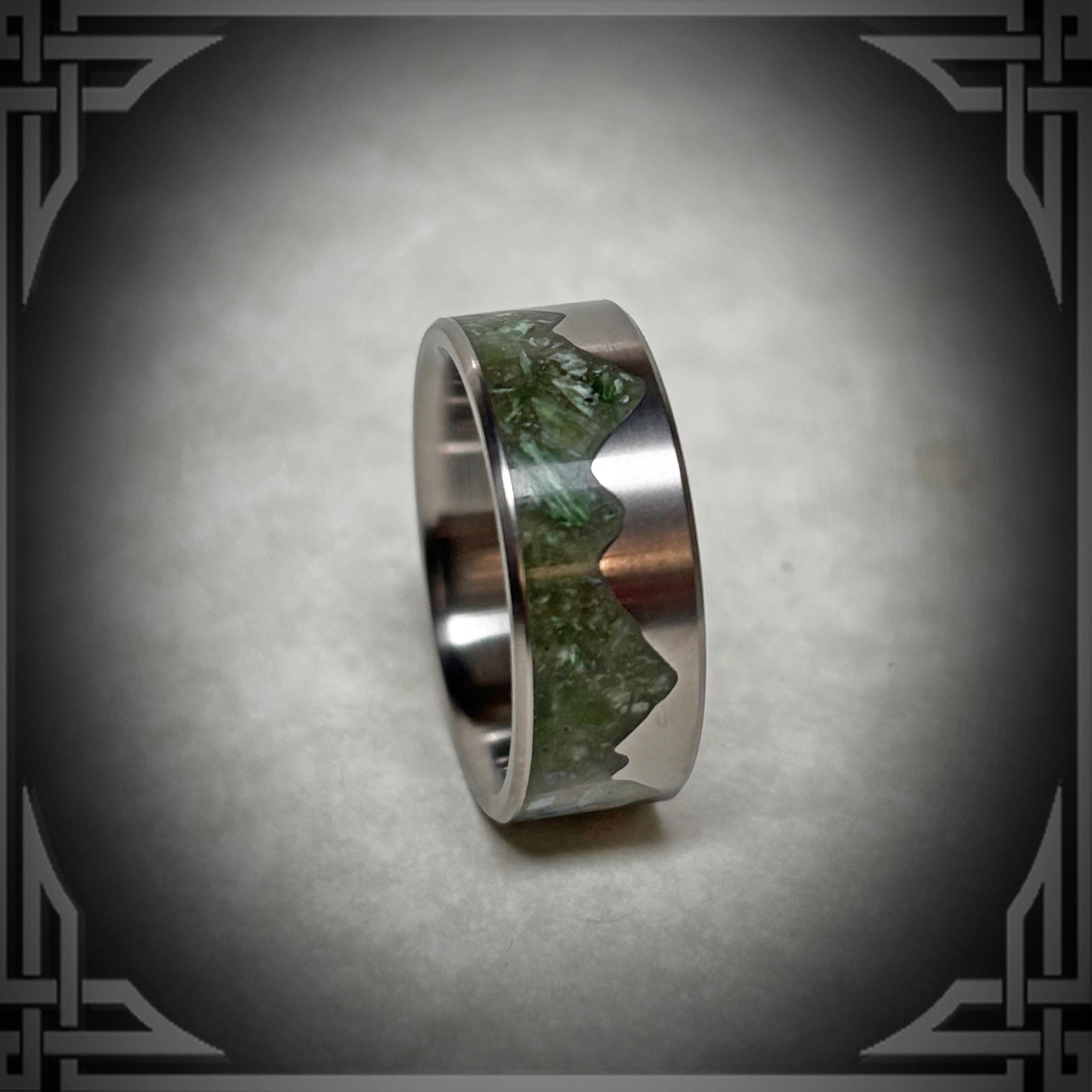 This Beautiful Ring is handmade from Titanium with a Green Jade Stone Mountain Inlay.