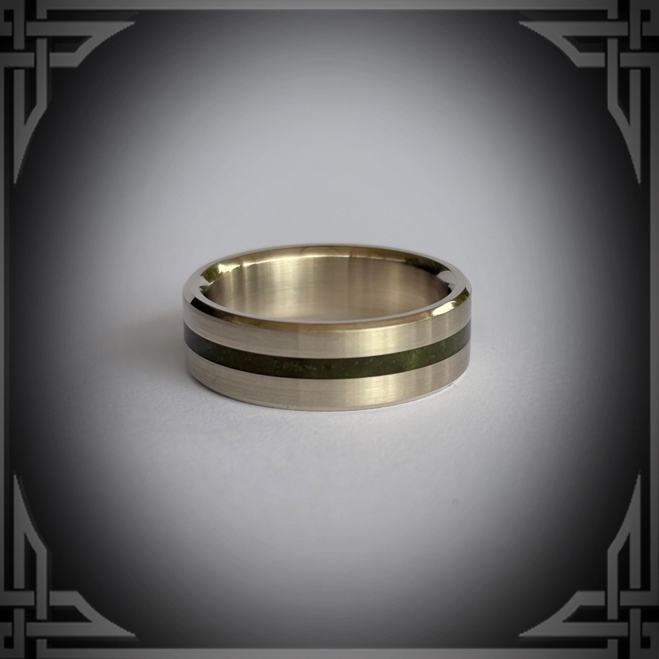 This ring is hand cast by us from 14K White Gold, with a B.C. Green Jade Stone Inlay.
