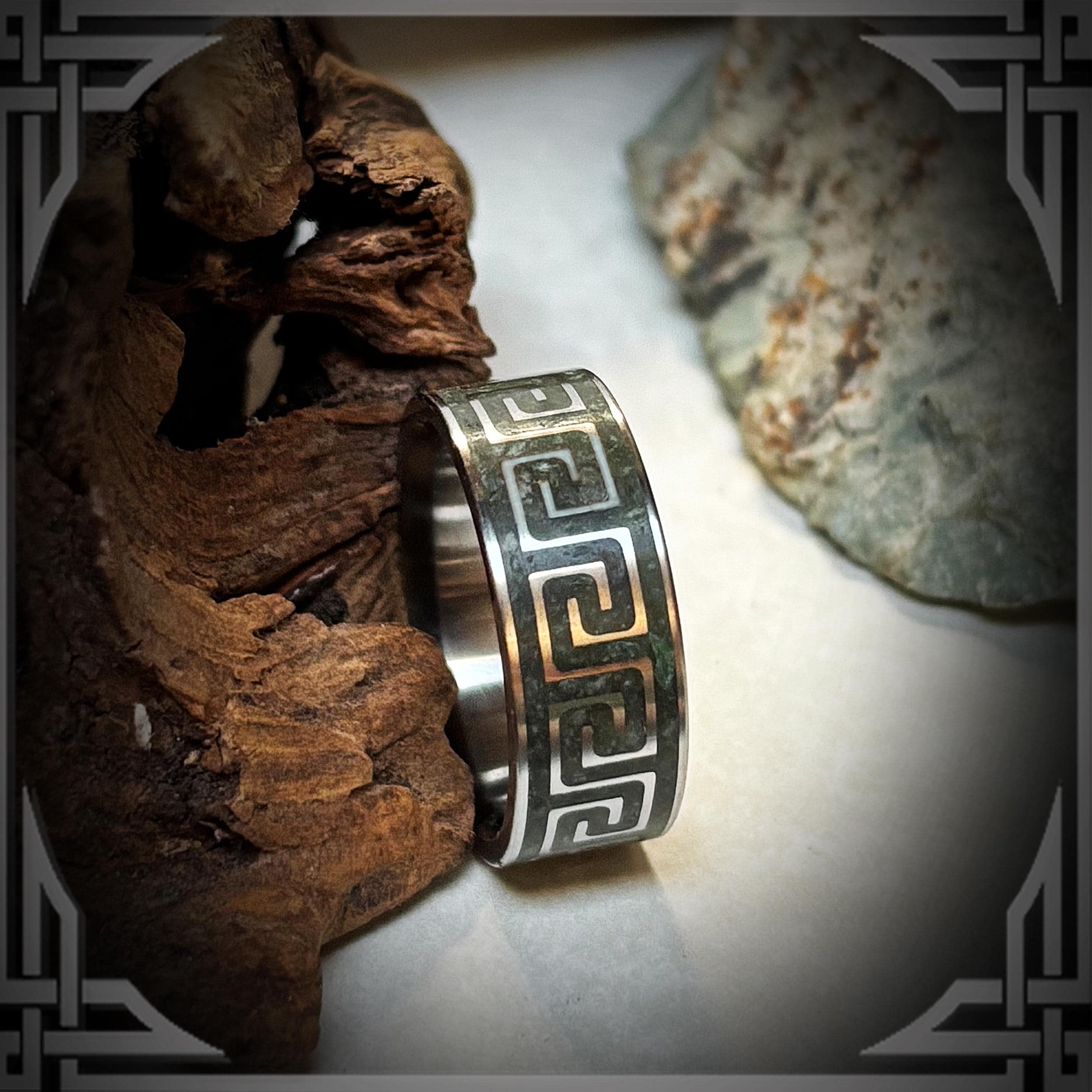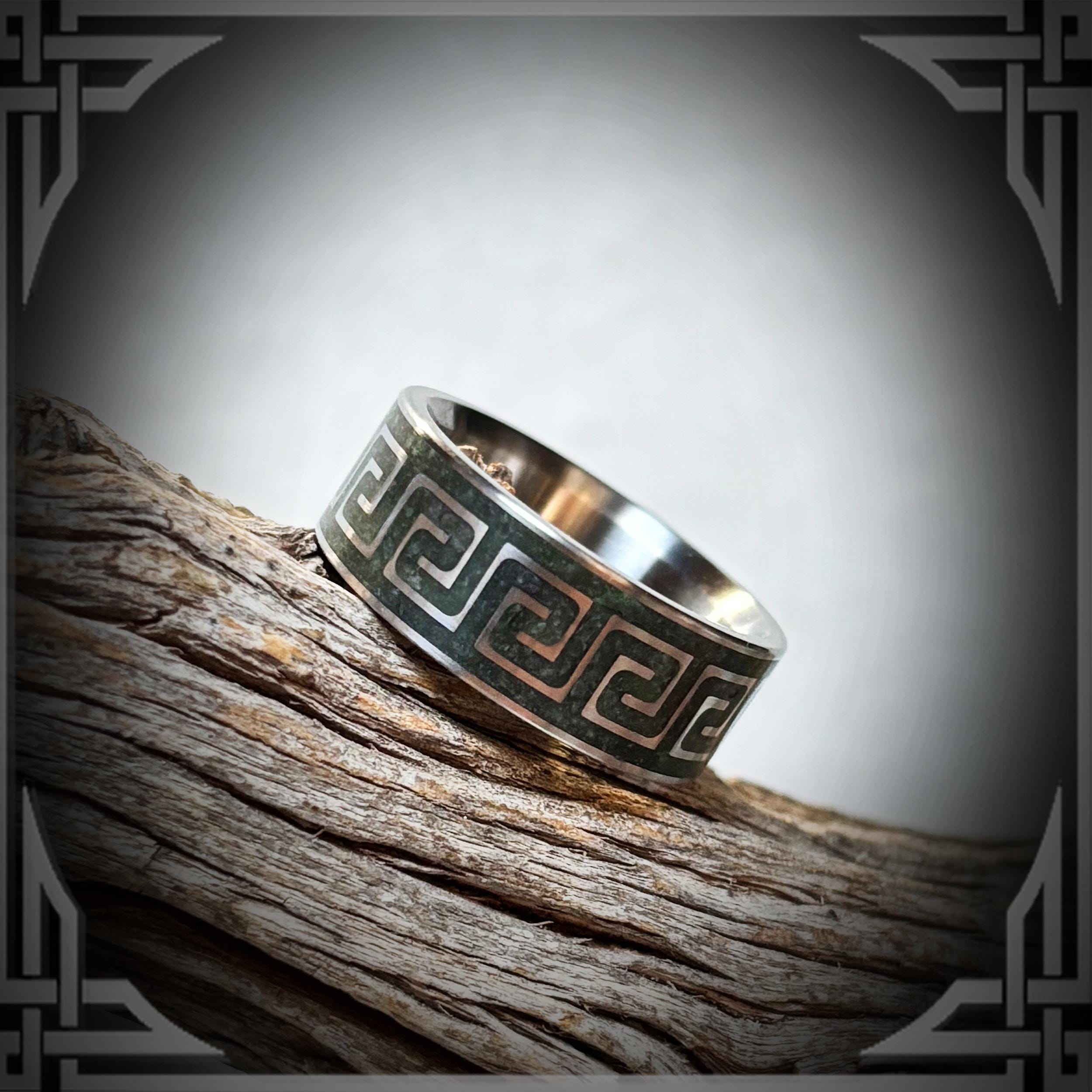 This Titanium Pattern Ring is inlayed with Green Jade.