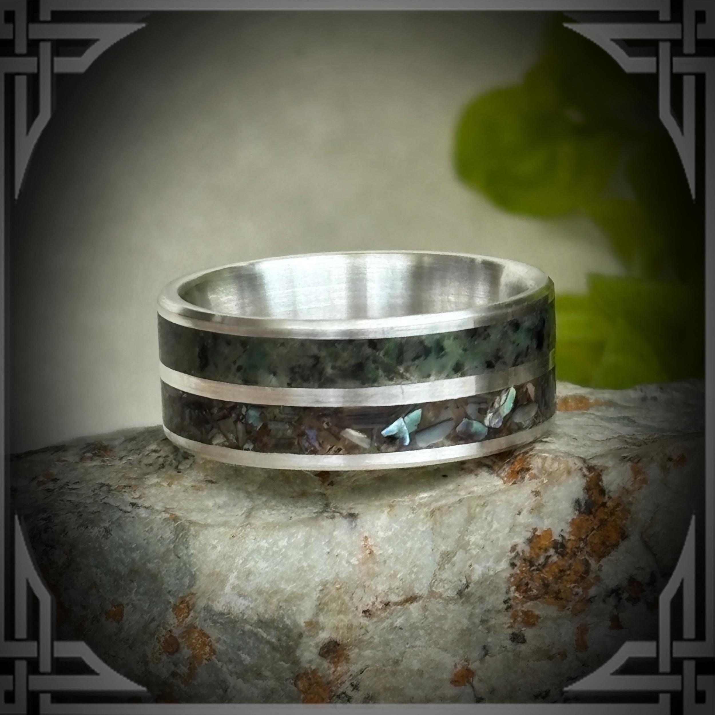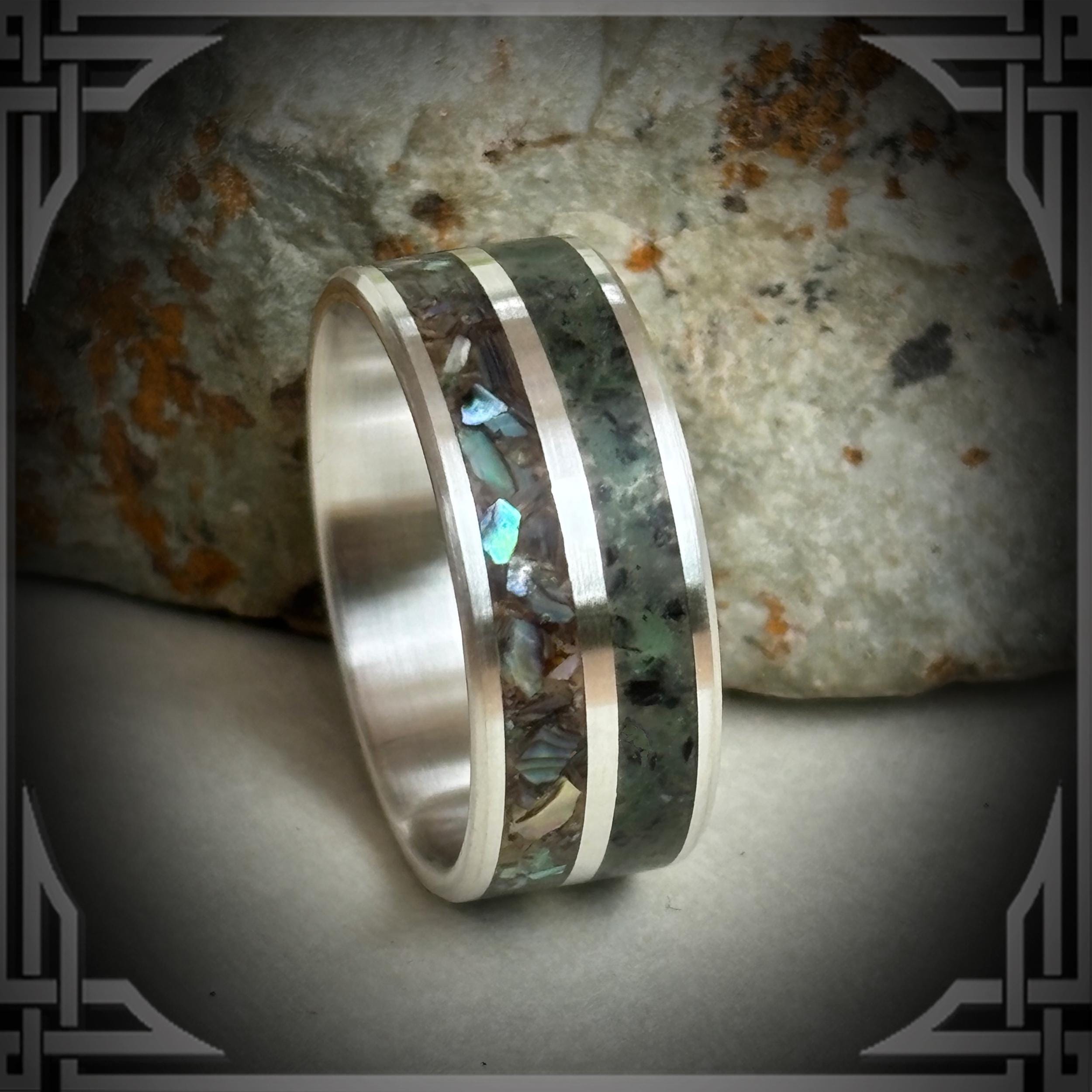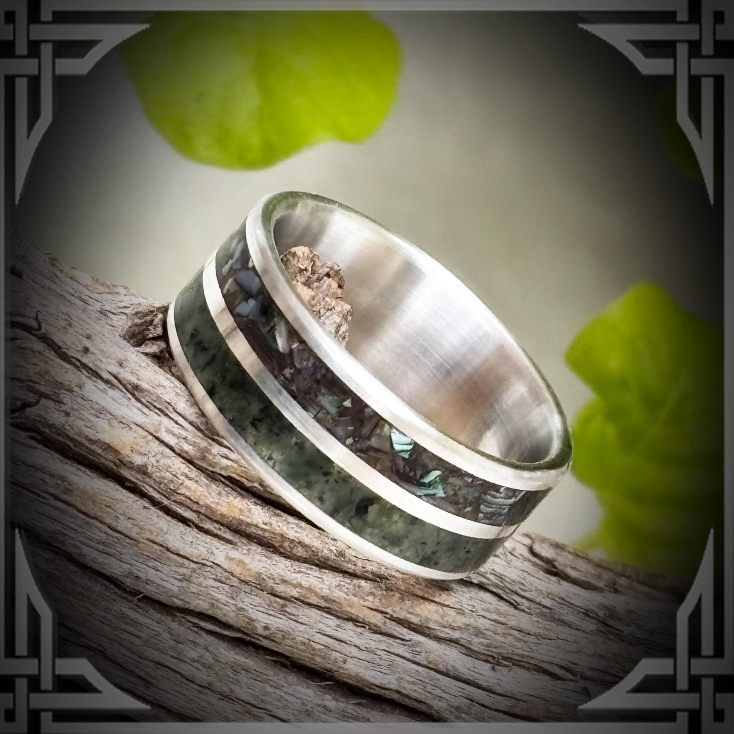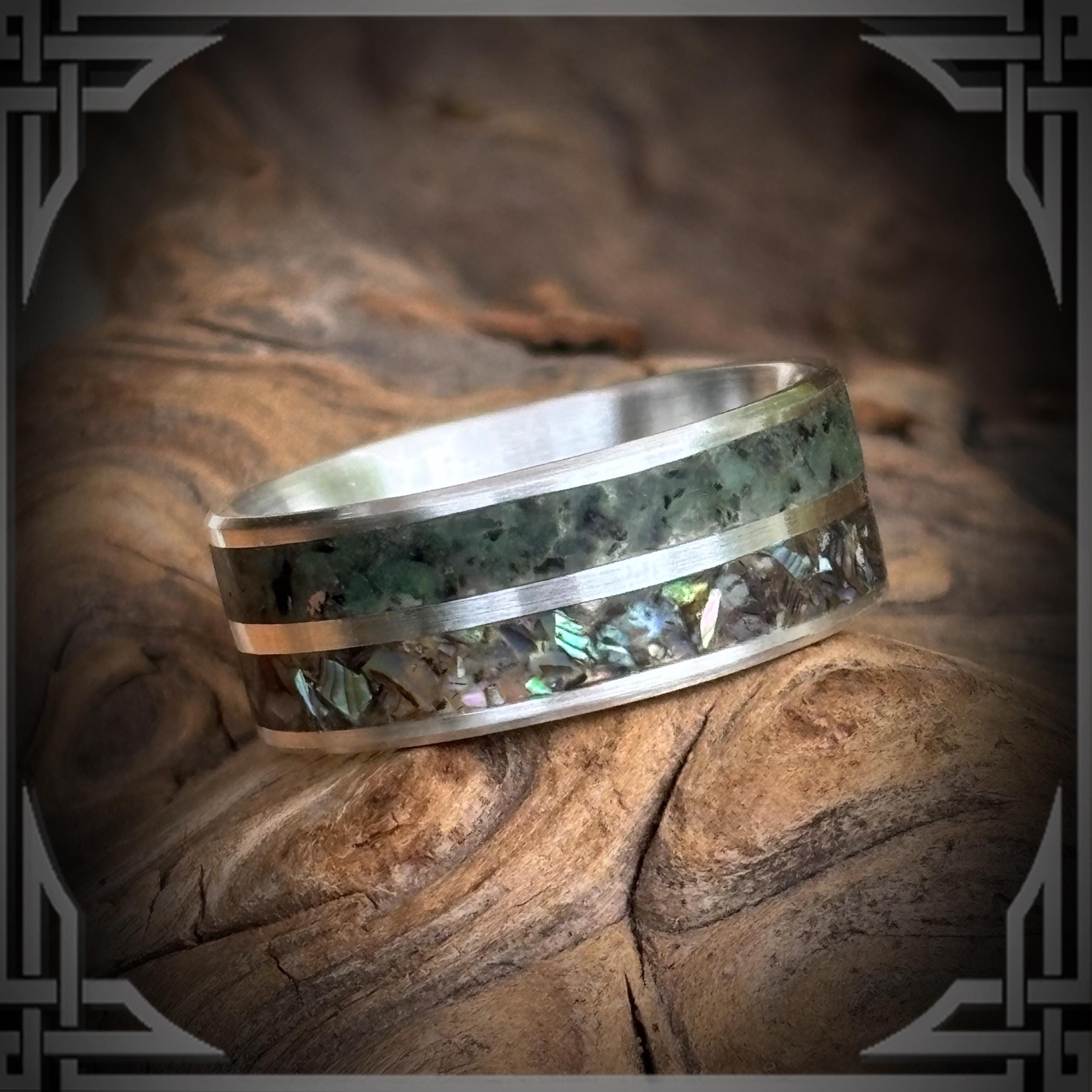 This ring is handmade from 925 Sterling Silver, Hand Casted by us with a Abalone Shell & Emerald Stone Inlay. Available in Titanium or Gold as well upon request.
