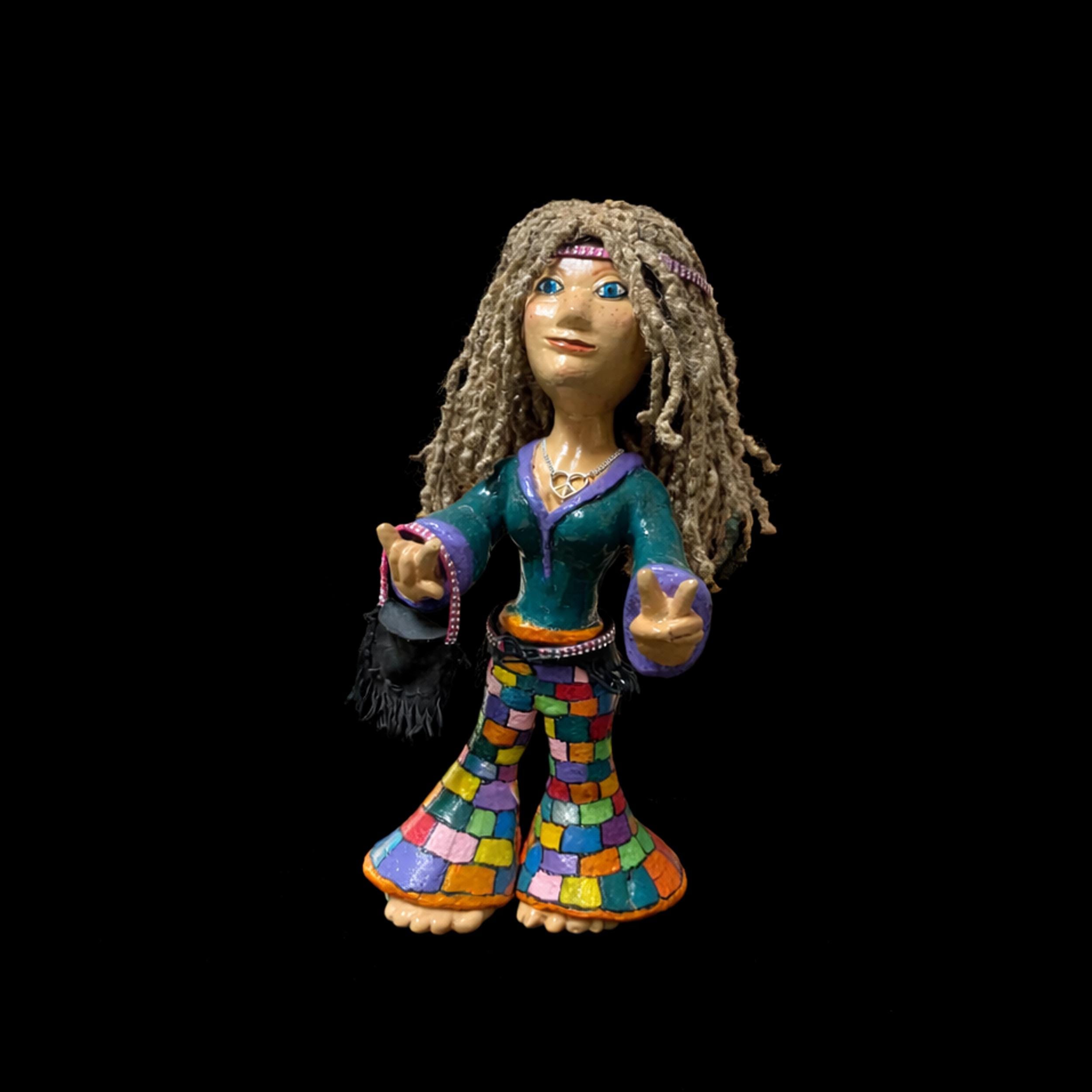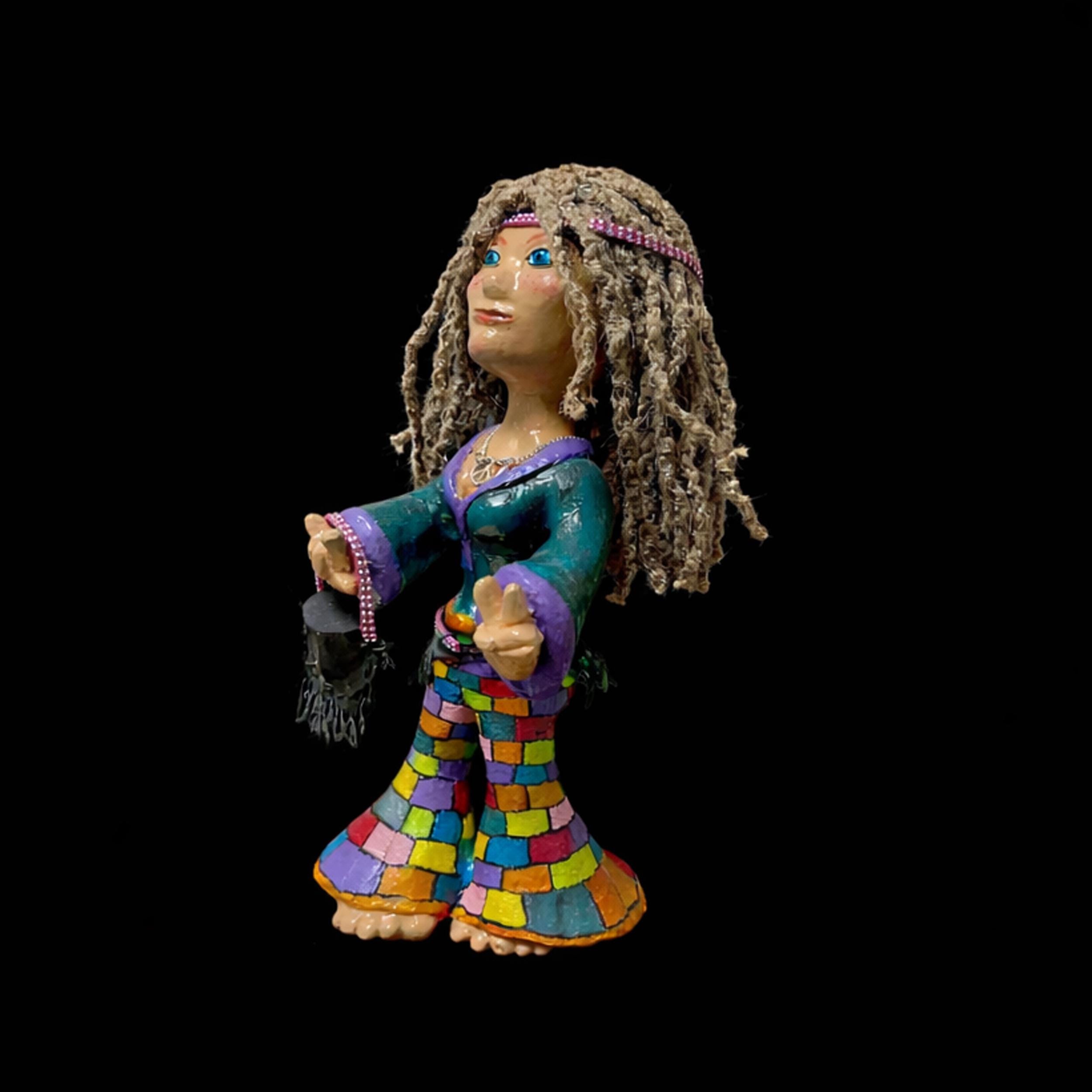 This Hippie Chic figurine is a one-of-a-kind, hand-crafted art piece created by Amanda Fox, owner and artist behind Ancient Works. Every detail is shaped, painted, and finished by hand — no molds, no duplicates, and no shortcuts. Made in Canada