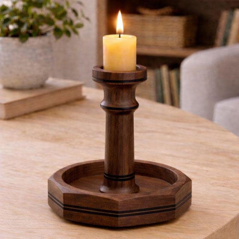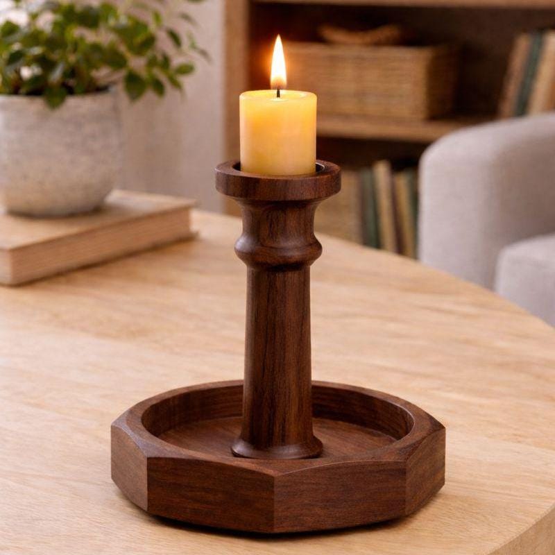 This natural walnut wood candle holder evokes an organic, calm, grounded feel.