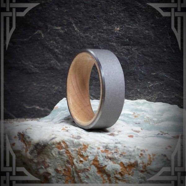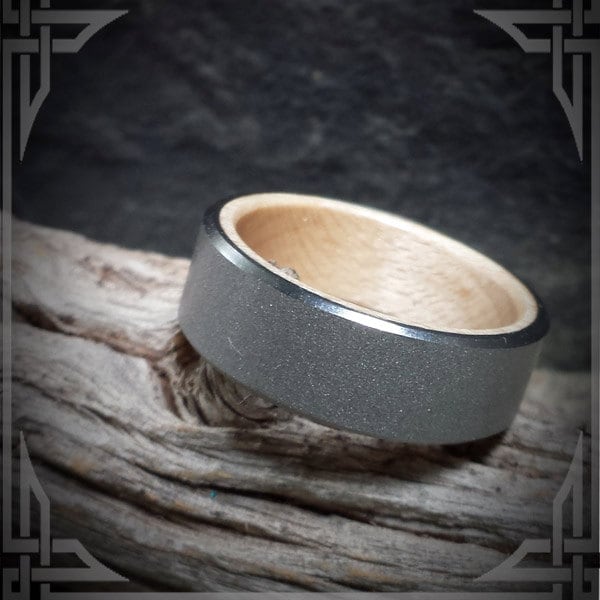 This ring is made from Sand Blasted Titanium with a Maple Wood Core.