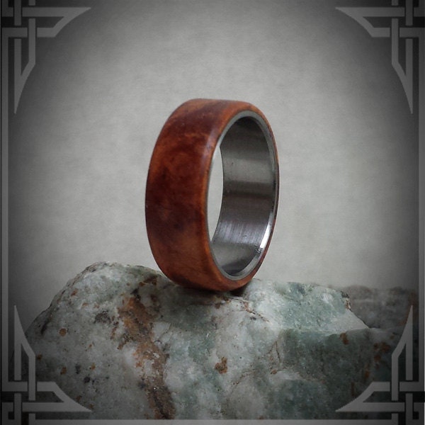 This ring is handmade from Amboyna Burl Wood with a Titanium Core.