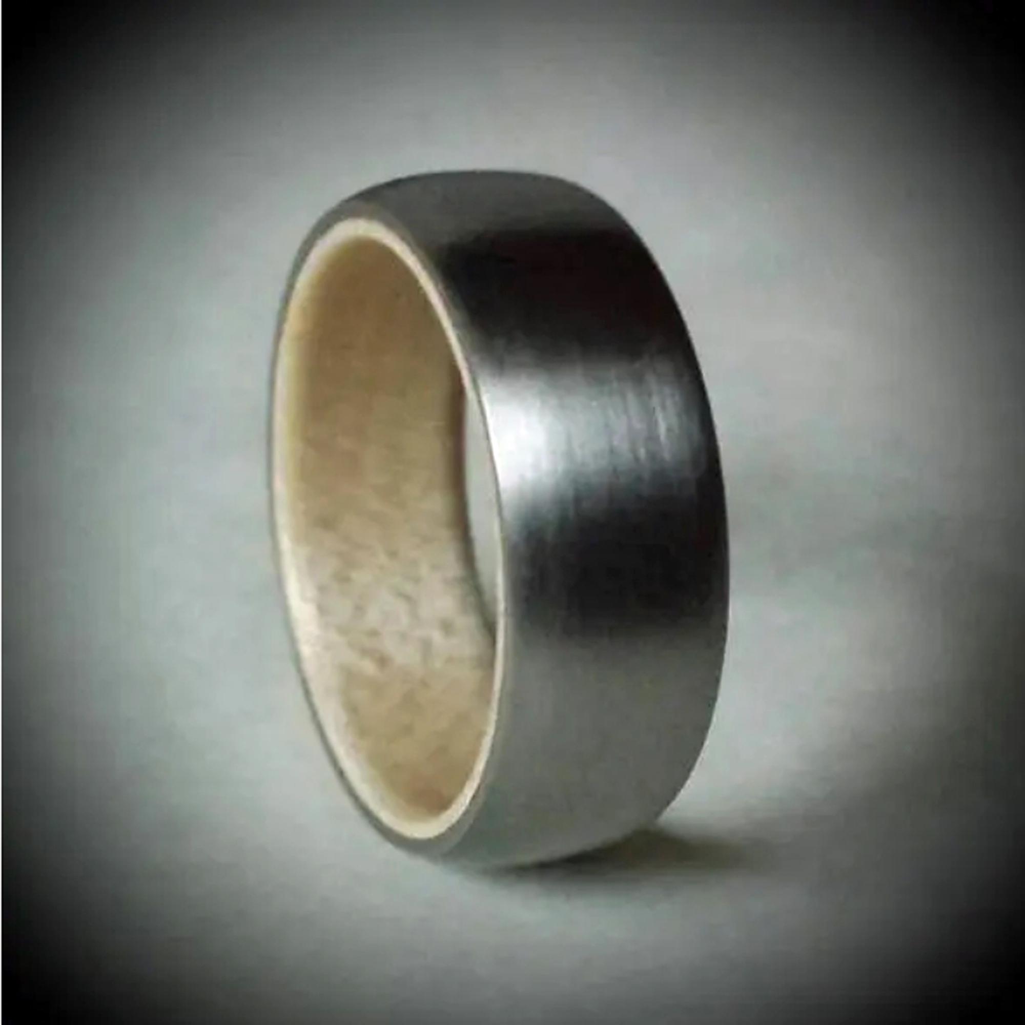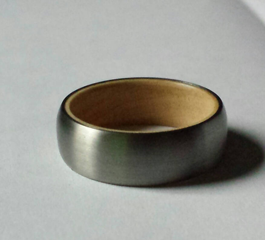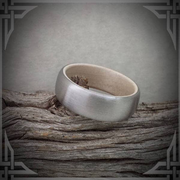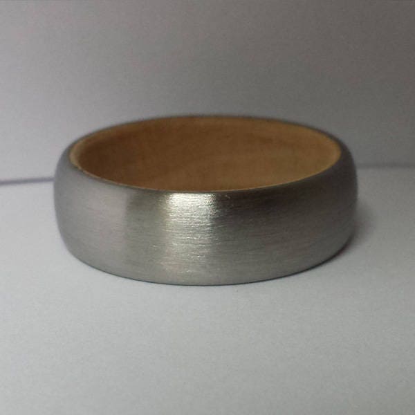 This ring is made from Hand Brushed Titanium with a Maple Wood Core.