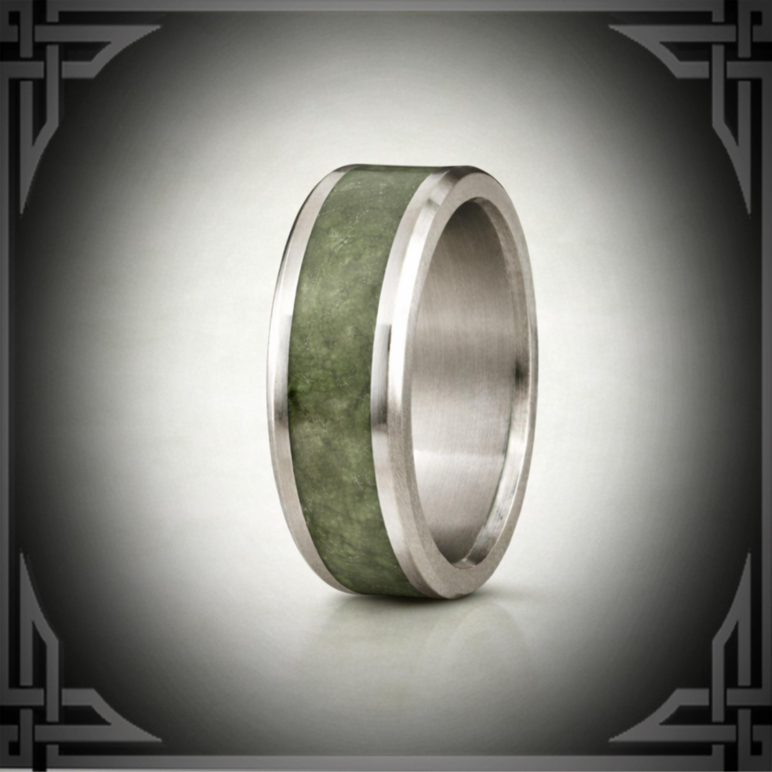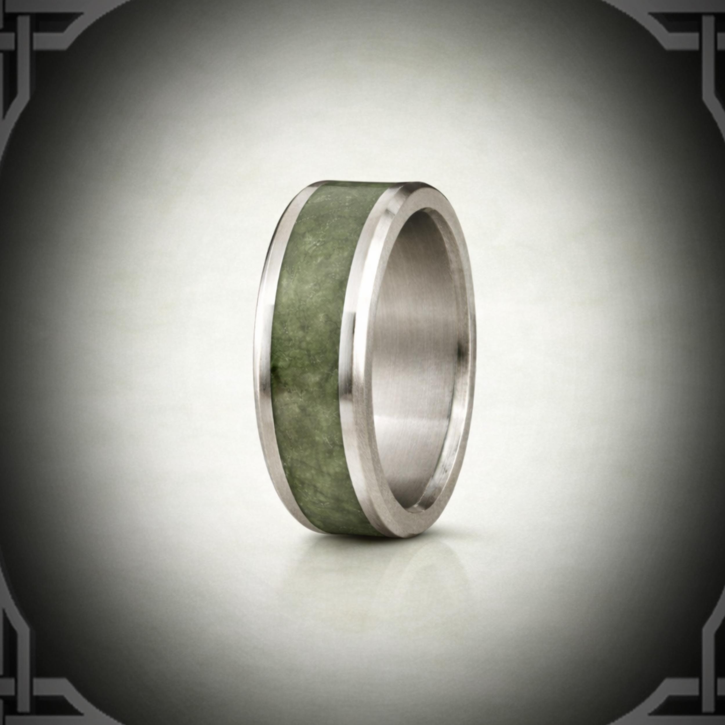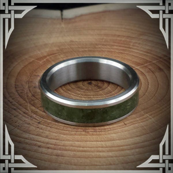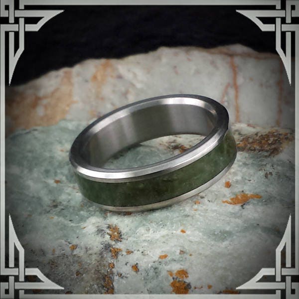 This ring is handmade in Canada from Titanium with a Wide Groove B.C. Green Jade Stone Inlay.