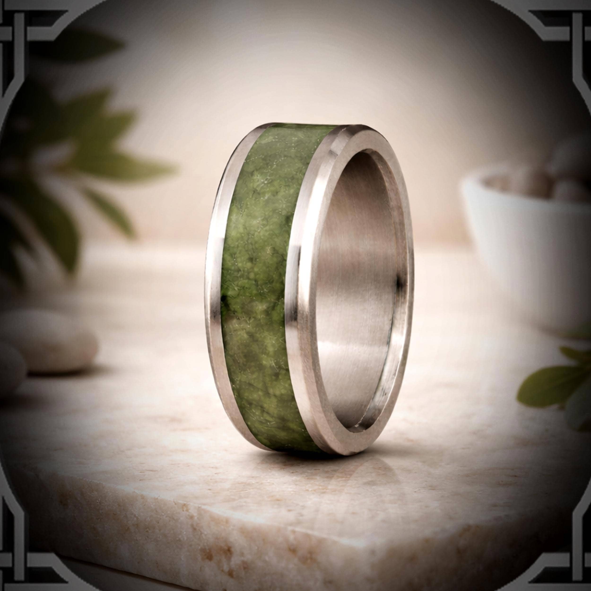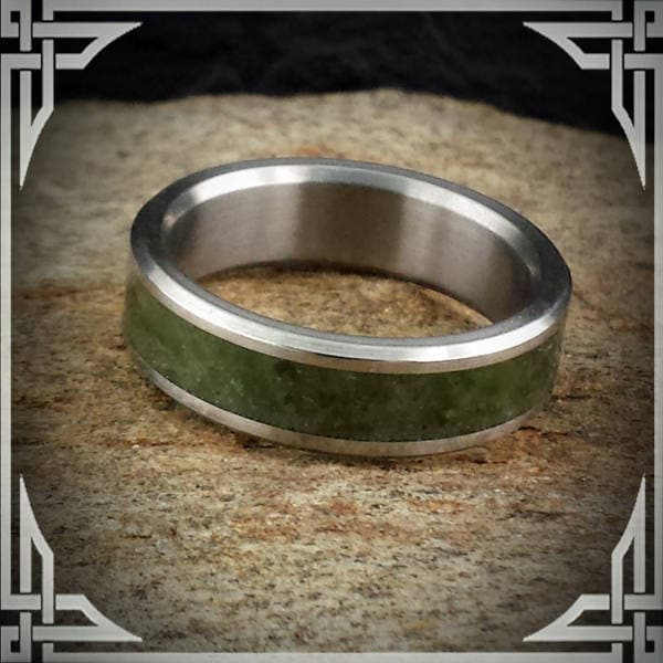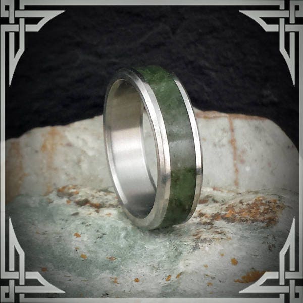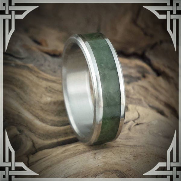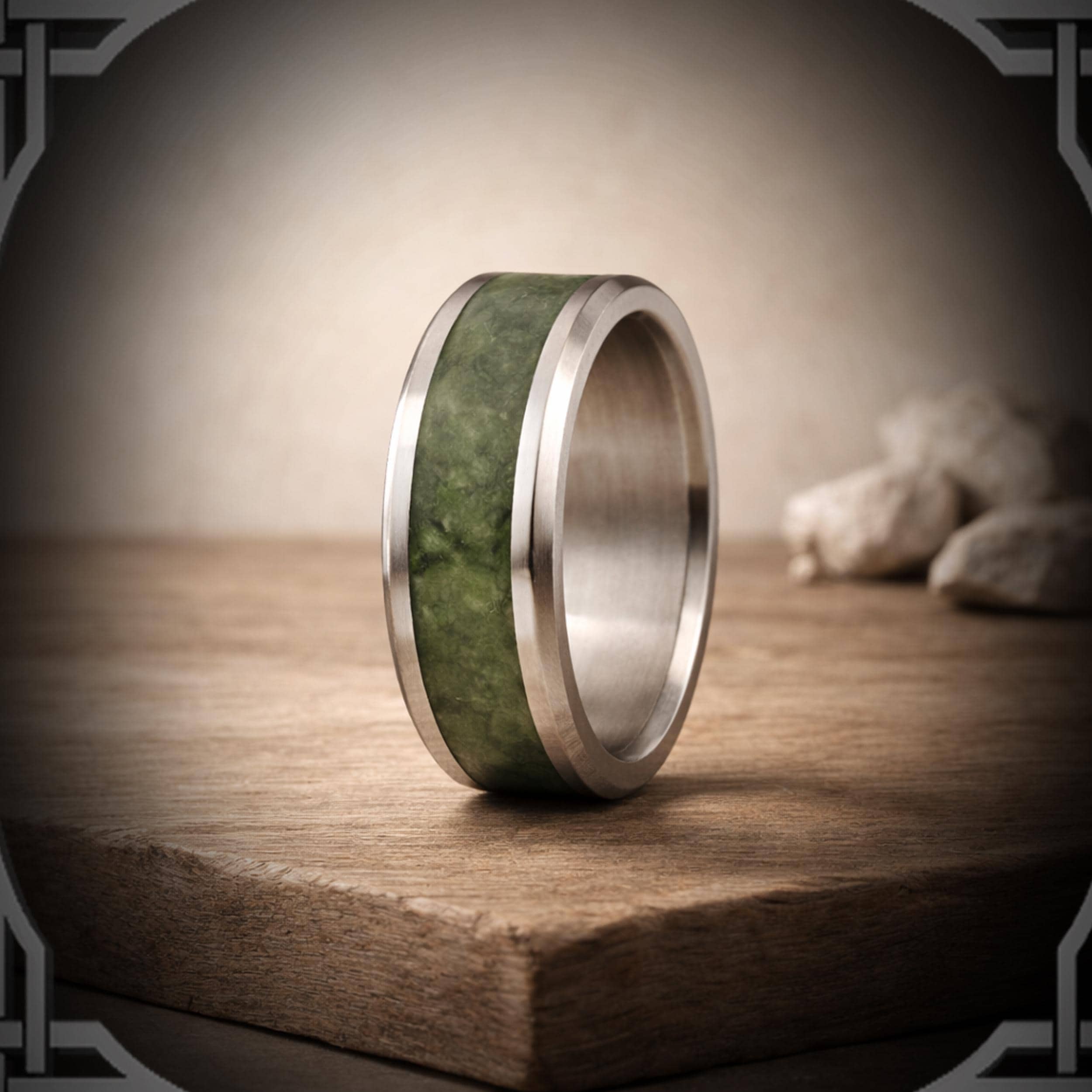 This ring is handmade in Canada from Titanium with a Wide Groove B.C. Green Jade Stone Inlay.