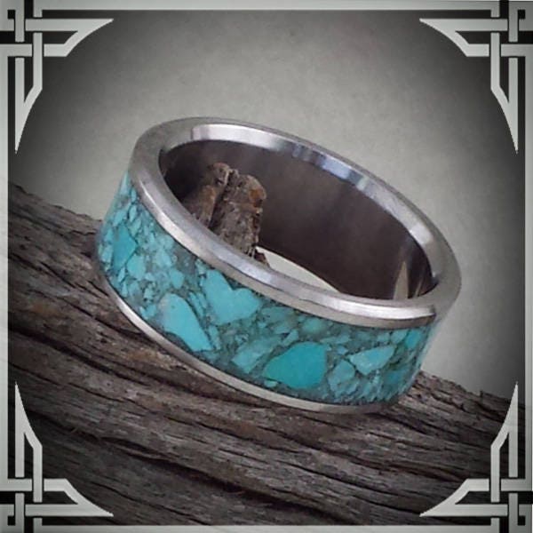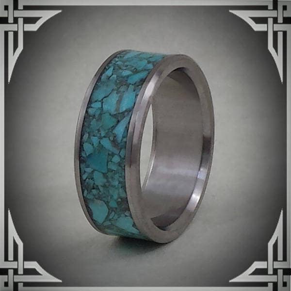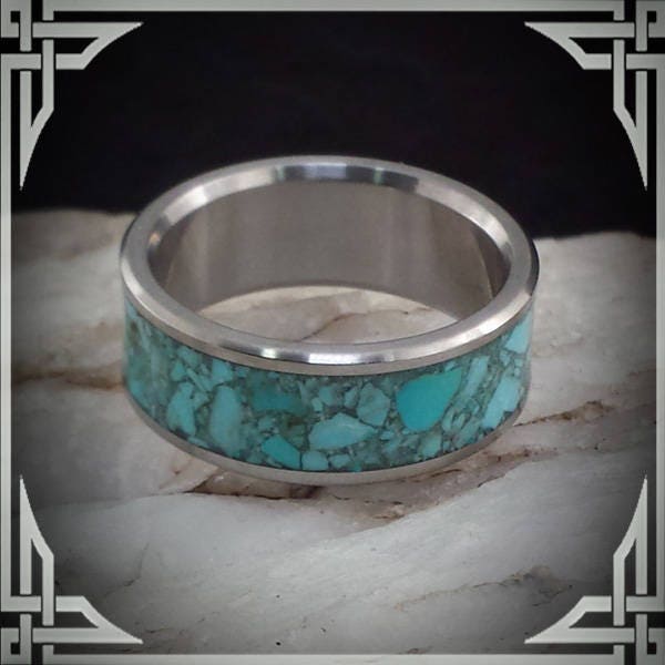 This ring is handmade in Canada from Titanium with a Wide Groove Turquoise Stone Inlay.