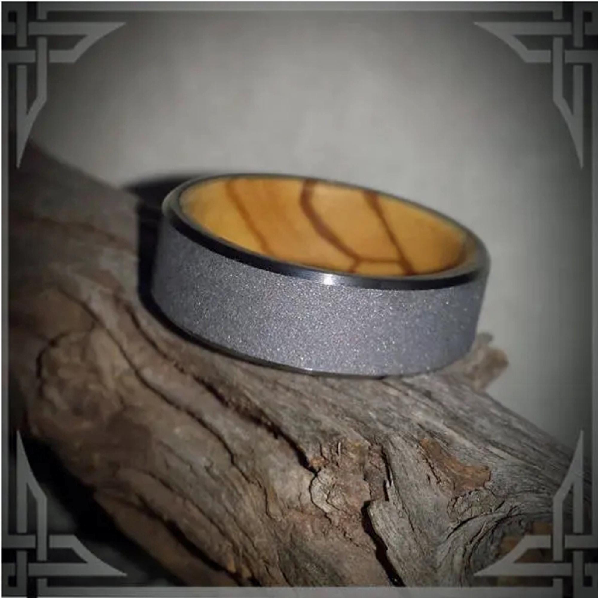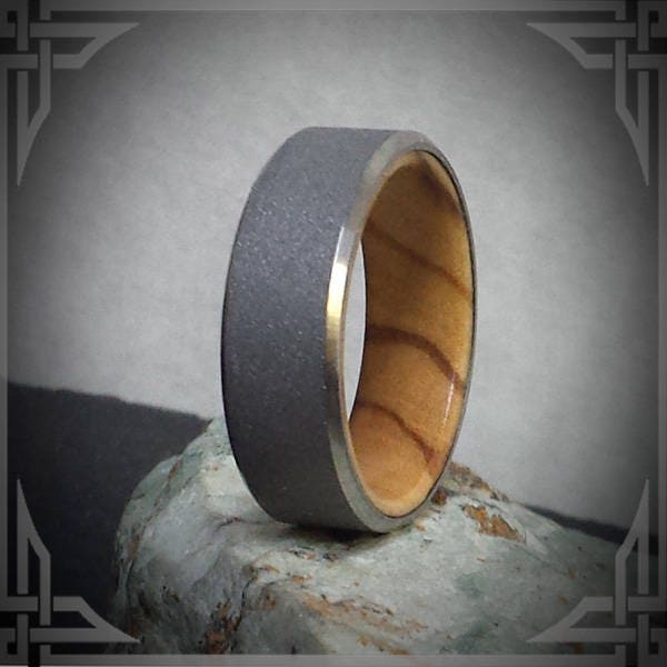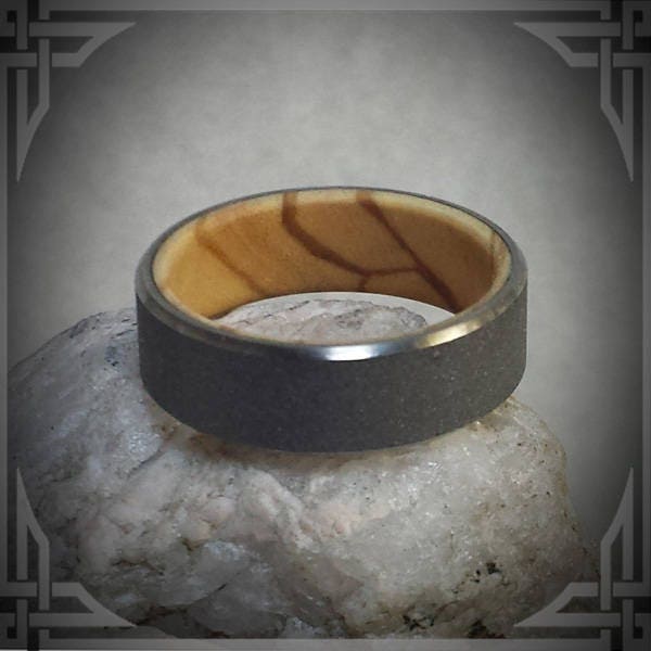 This ring is made from Sand Blasted Titanium with a Bethlehem Olive Wood Core.
