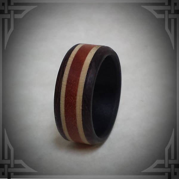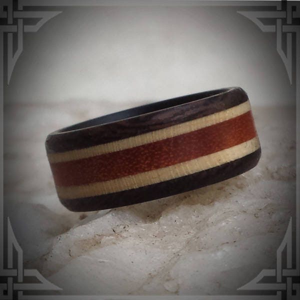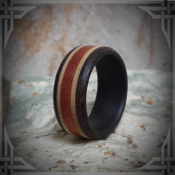This Ring is made from Paella Wood, Maple accents and Rosewood with a Carbon Fiber Core.