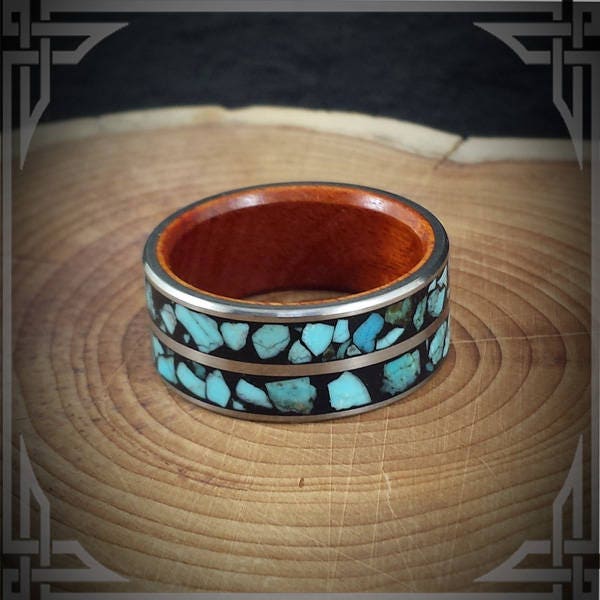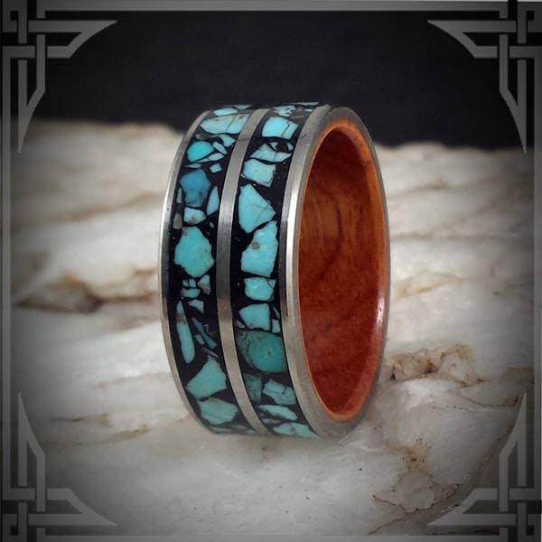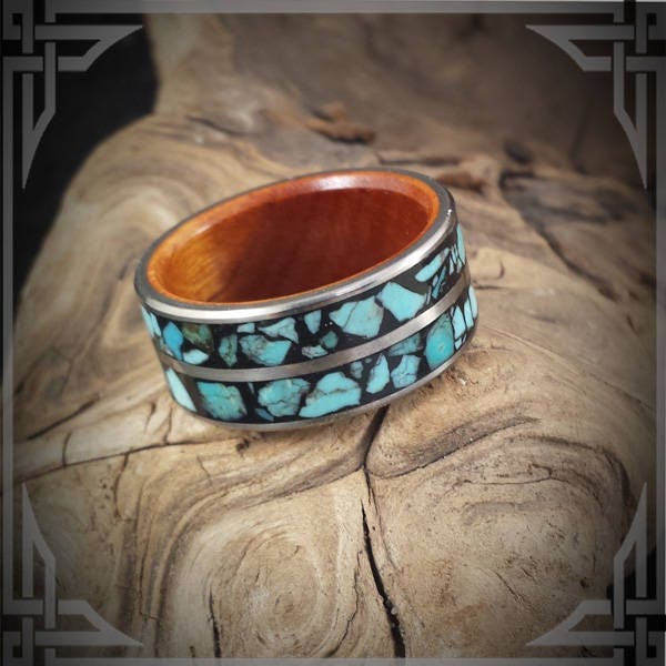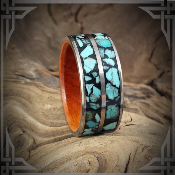 A Titanium Ring with Sleeping Beauty Turquoise Inlaid in black and a Padauk Wood Core.