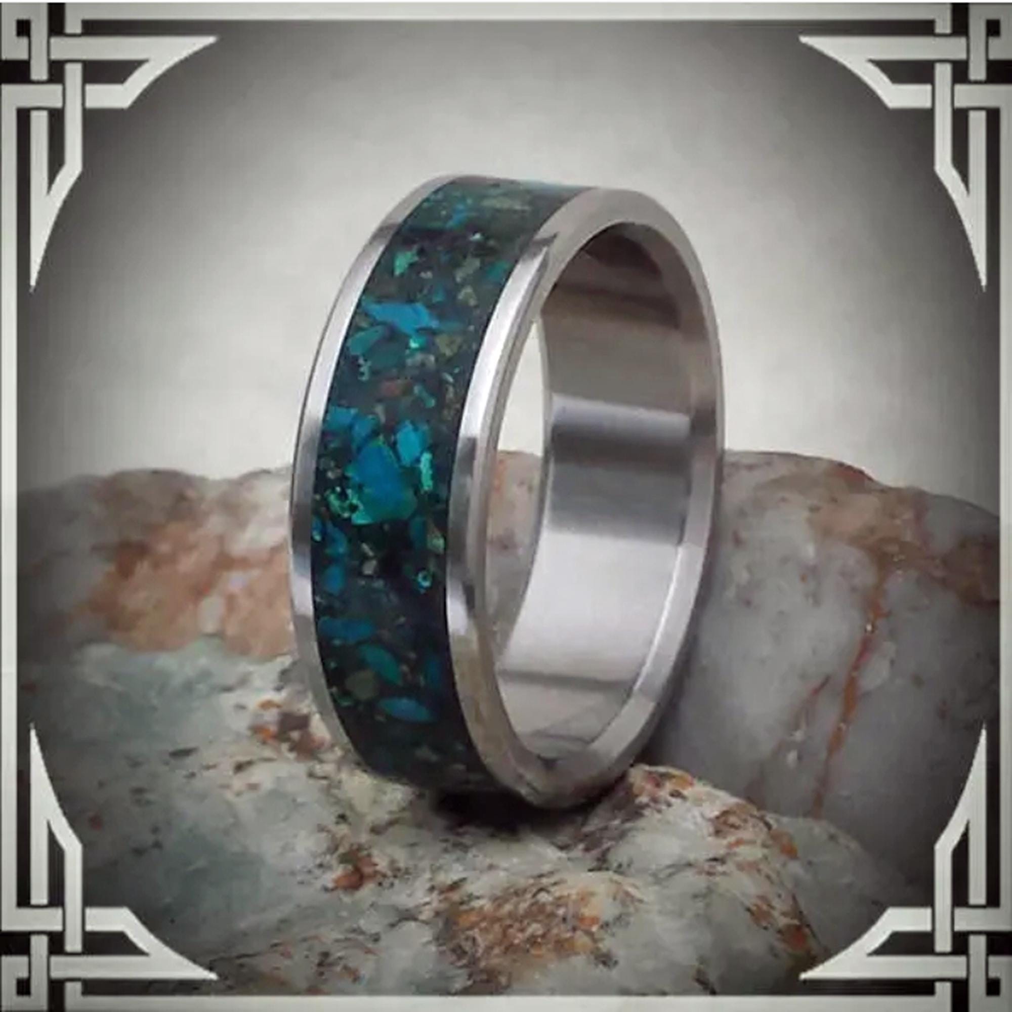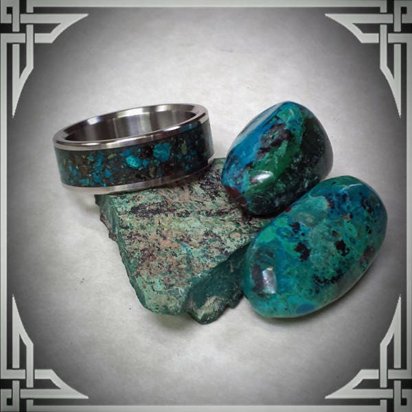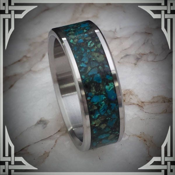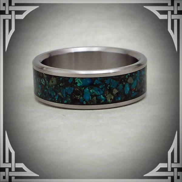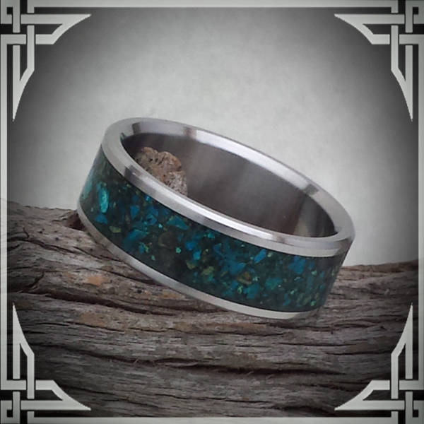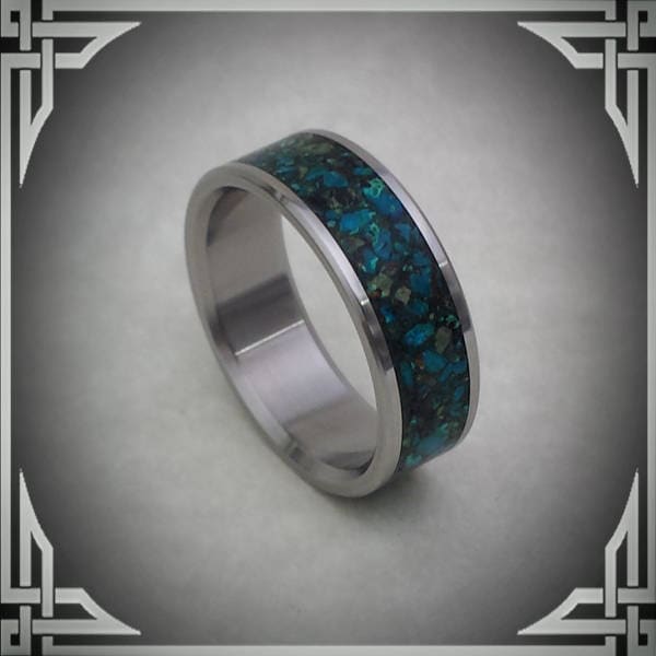 This ring is made from Titanium with a Wide Groove Chrysocolla Stone Inlay.