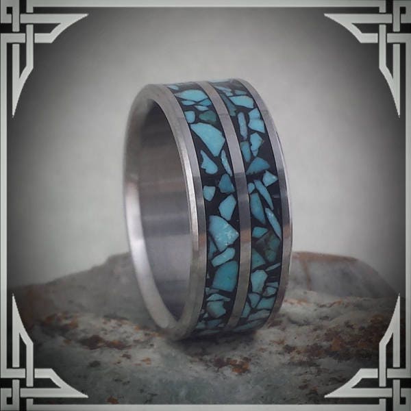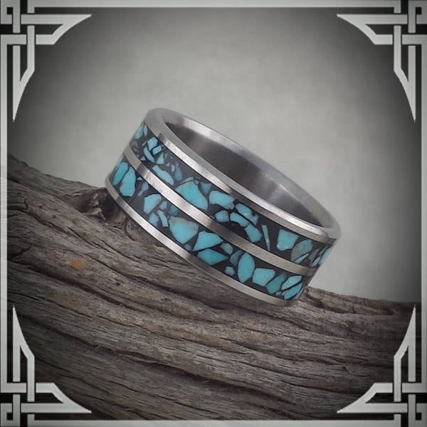 This ring is handmade in Canada from Titanium with a Double Groove Sleeping Beauty Turquoise Stone, Inlaid in Black.
