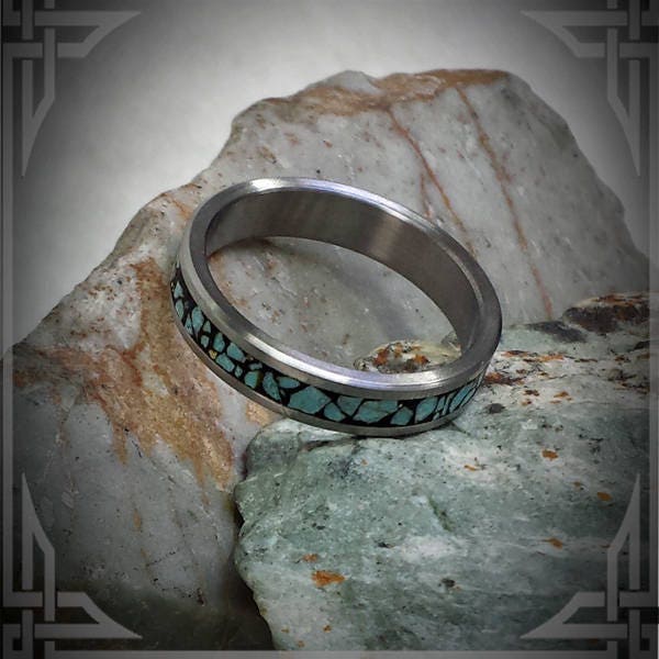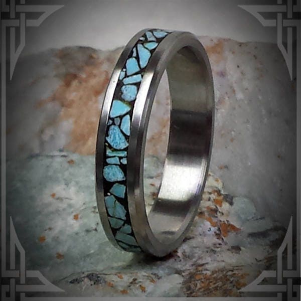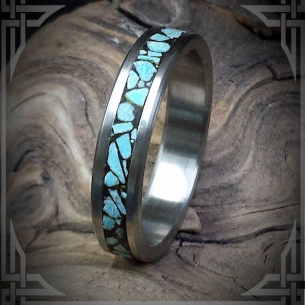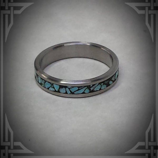 This ring is handmade in Canada from Titanium with a Wide Groove Sleeping Beauty Turquoise Stone, Inlaid in Black.