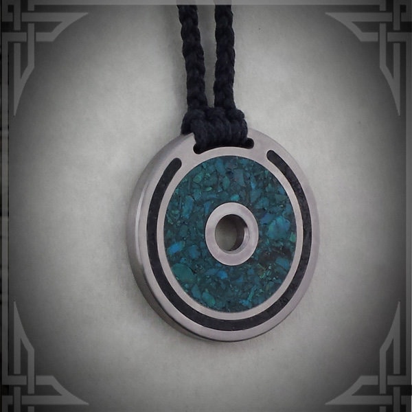 This Necklace is made from Titanium with Chrysocolla and Black Jade Stone Inlay.