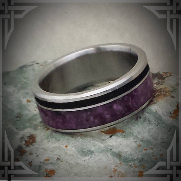 This ring is handmade in Canada from Titanium with a Violet Jade & Rare B.C. Black Jade Stone Inlay.