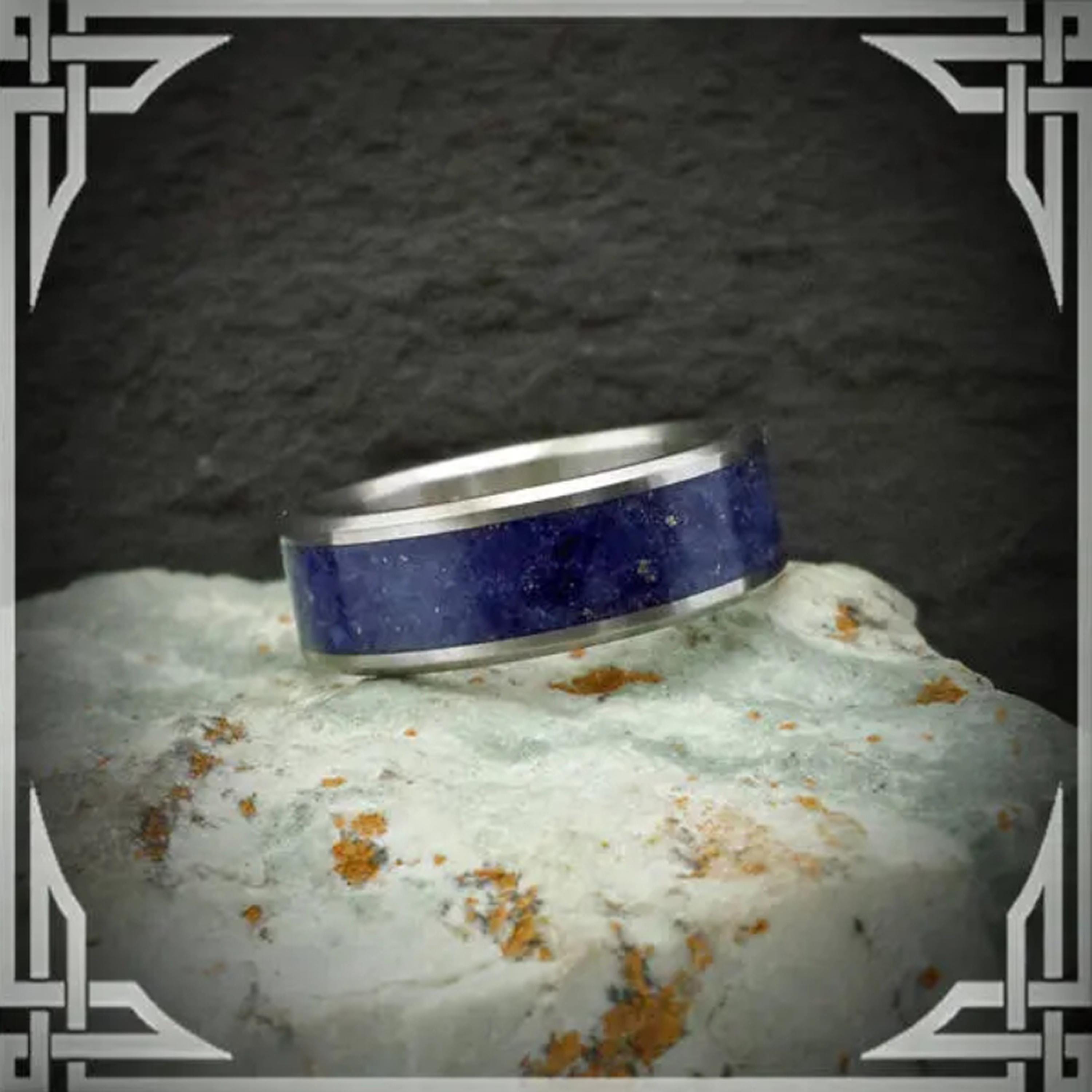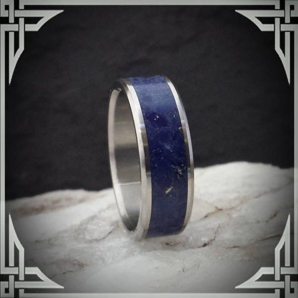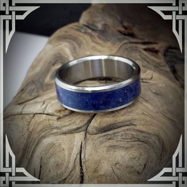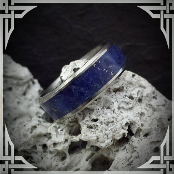 This ring is handmade in Canada from Titanium with a Wide Groove Lapis Lazuli Stone Inlay.