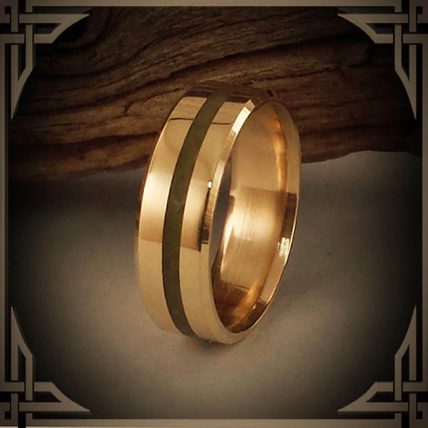 This ring is hand cast by us from 14 Karat Yellow Gold with a Narrow B.C. Green Jade Inlay.