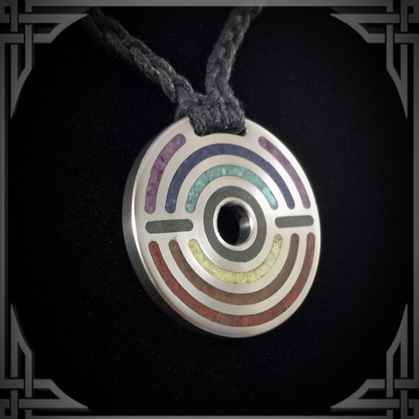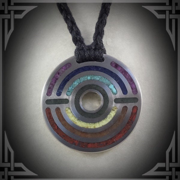 This Necklace is made from Titanium with an 7 Stone Inlay.