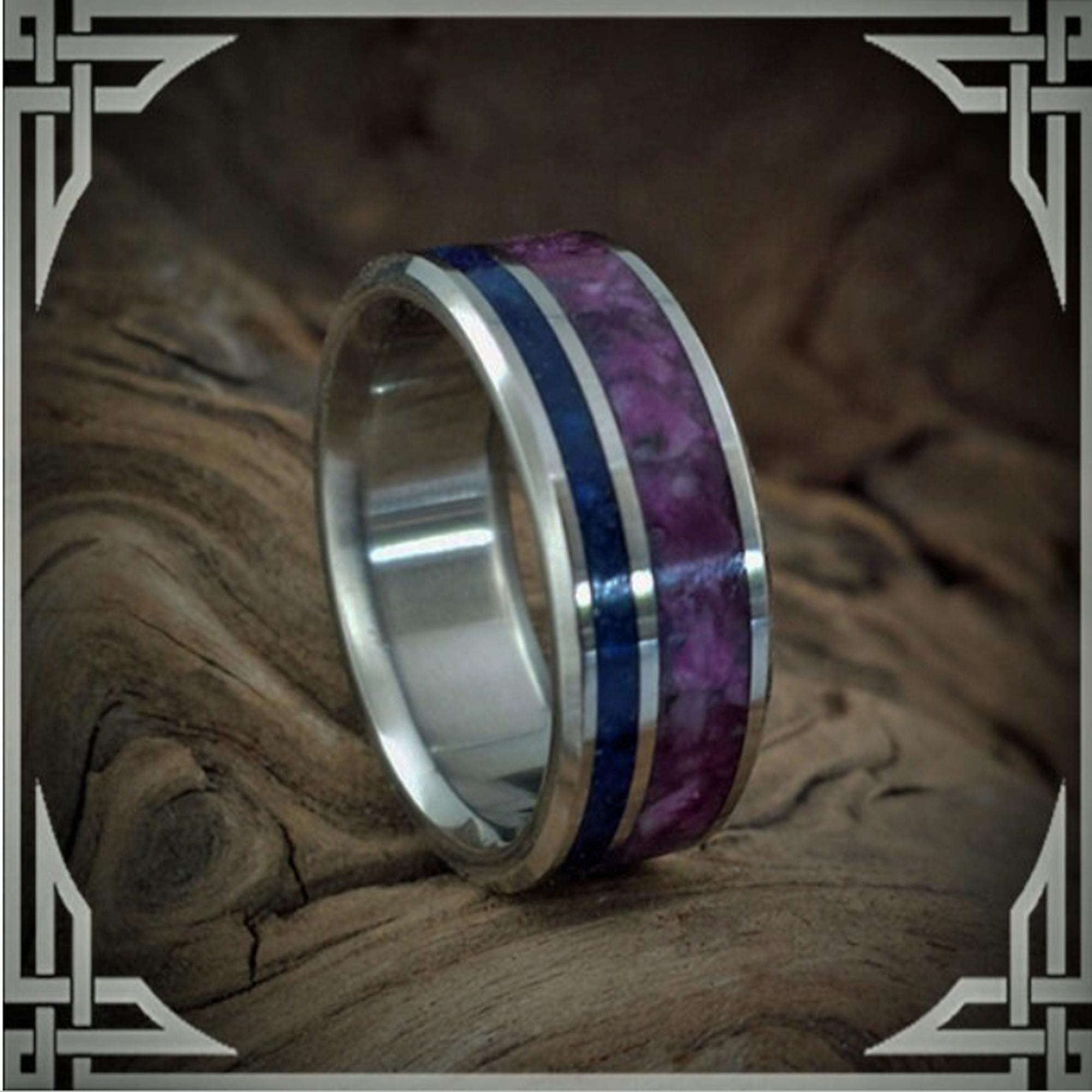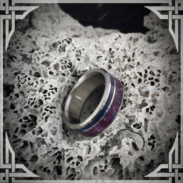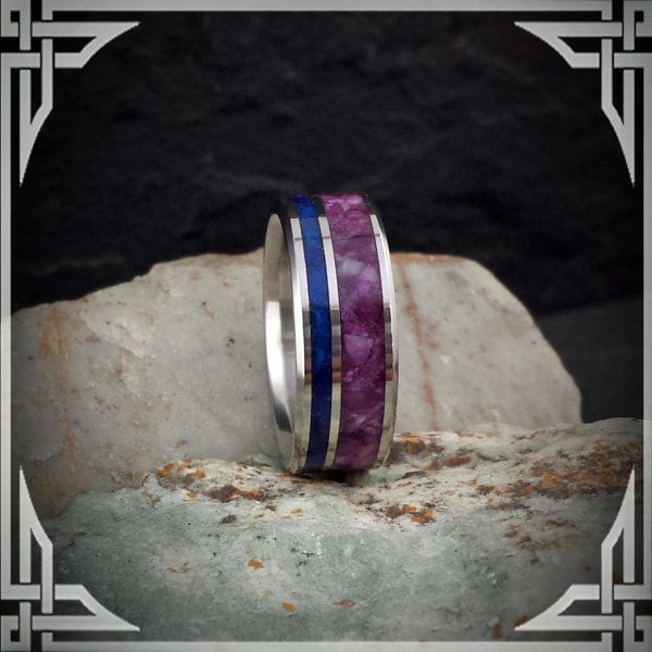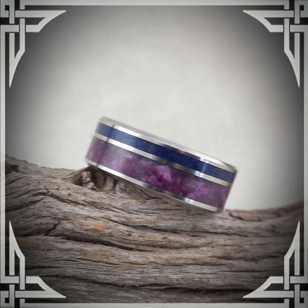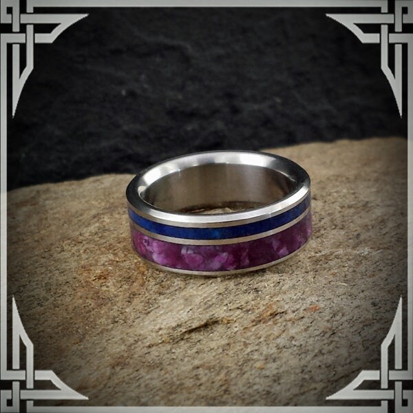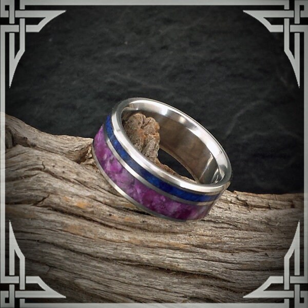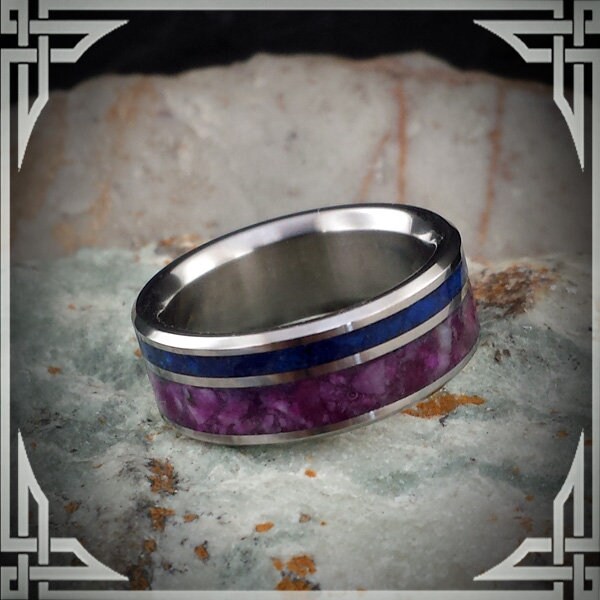 This ring is handmade in Canada from Titanium with a Double Groove Violet Jade & Lapis Lazuli Stone Inlay.