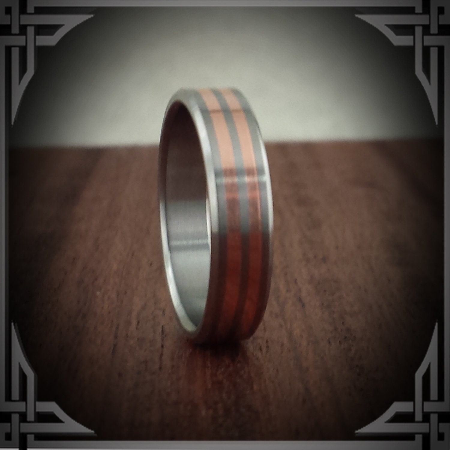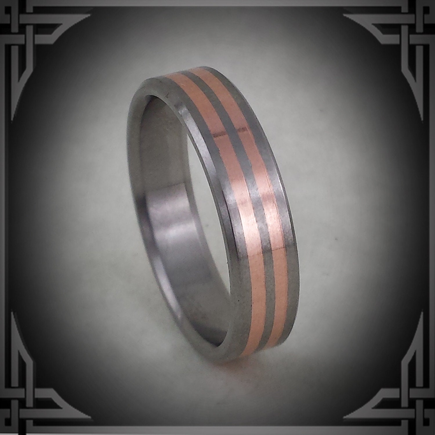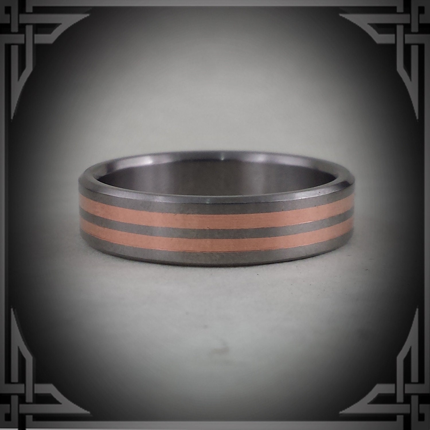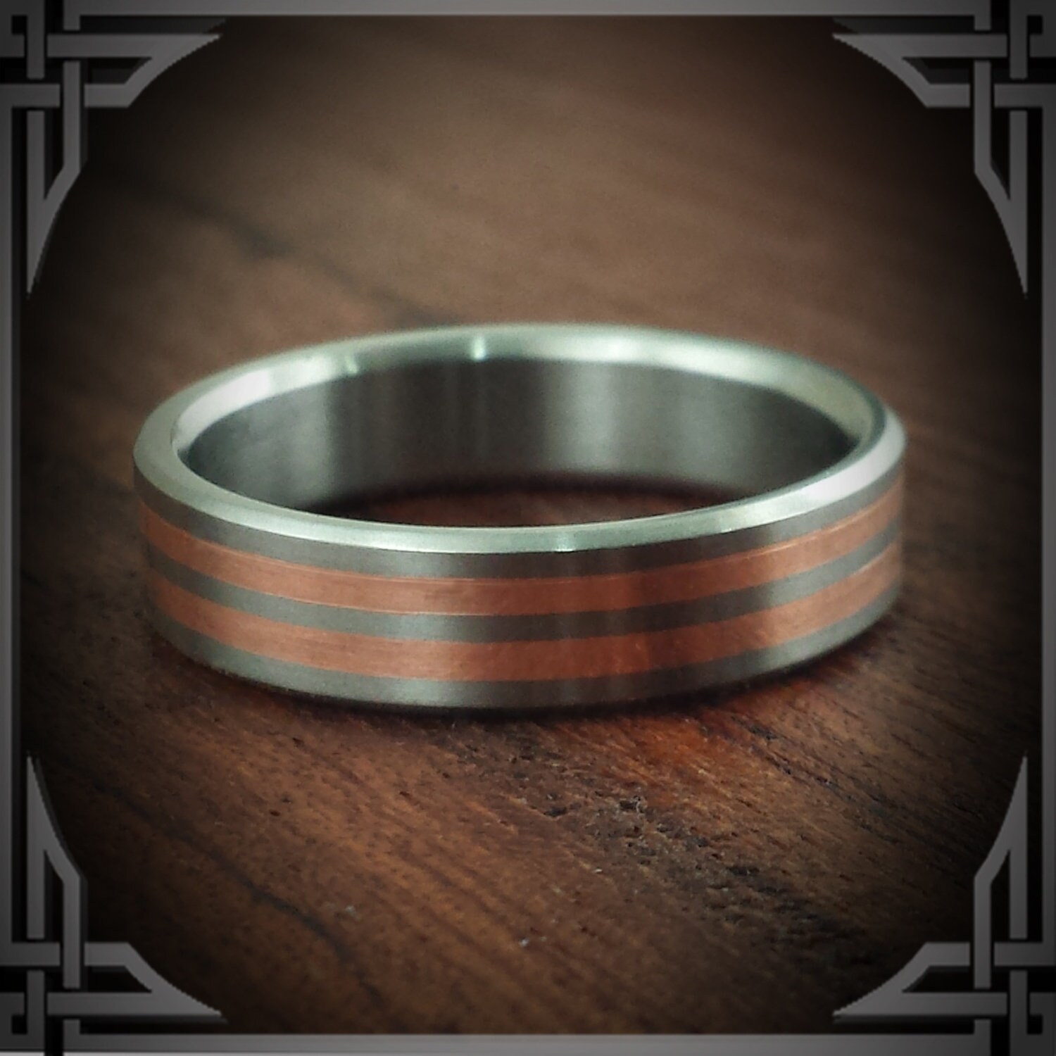 This ring is made from Titanium with a Double Groove Copper Inlay.