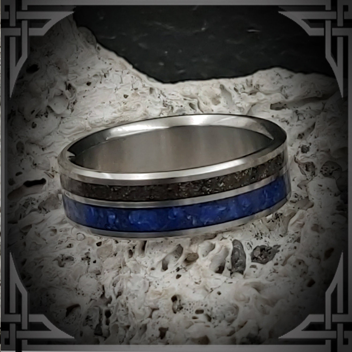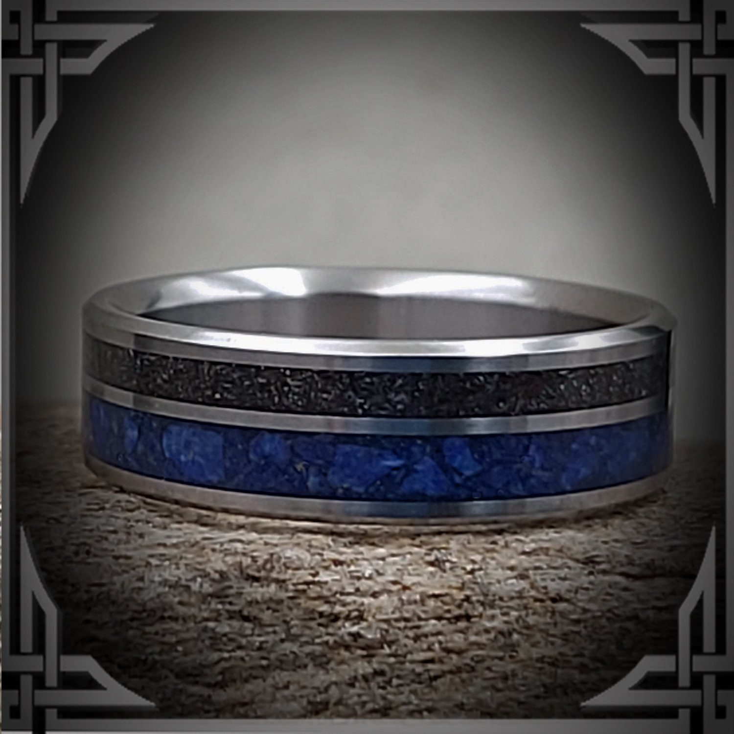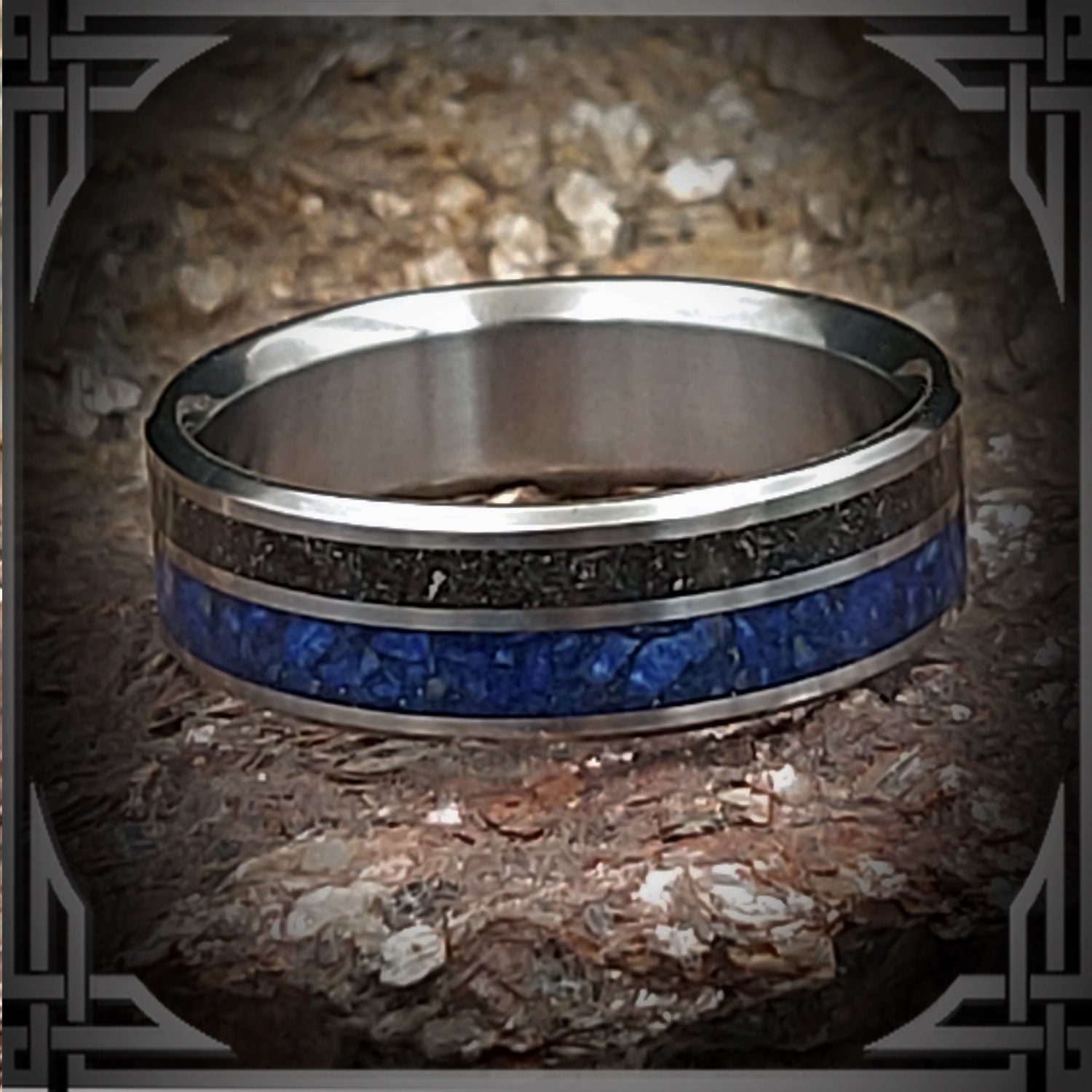 This ring is made from Titanium with Meteorite & Lapis Lazuli Double groove Inlay.