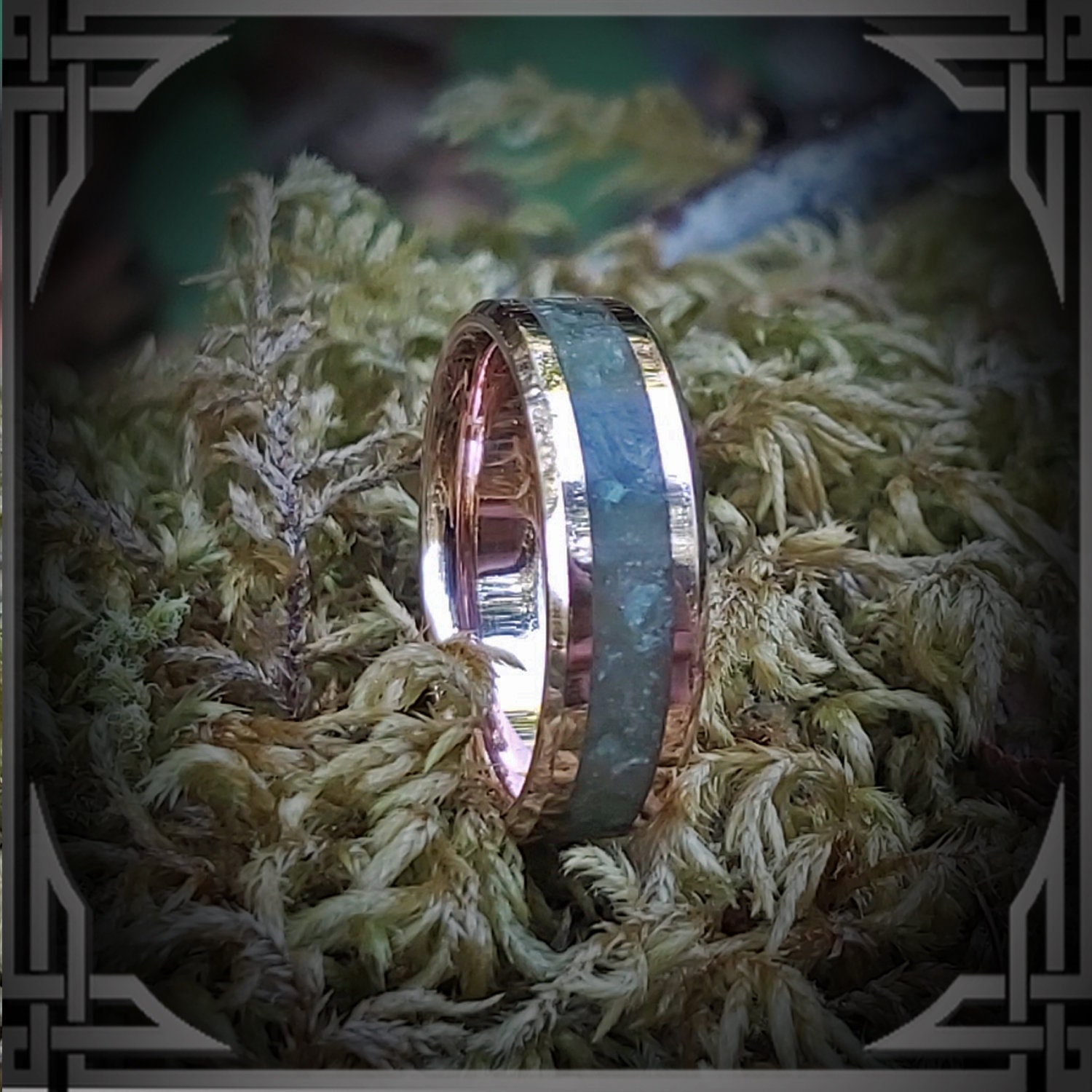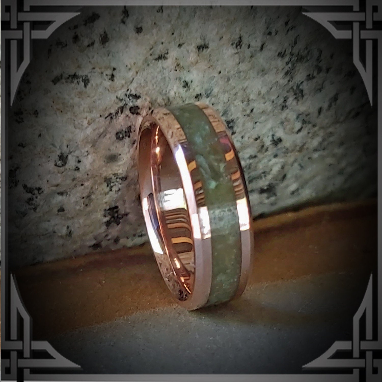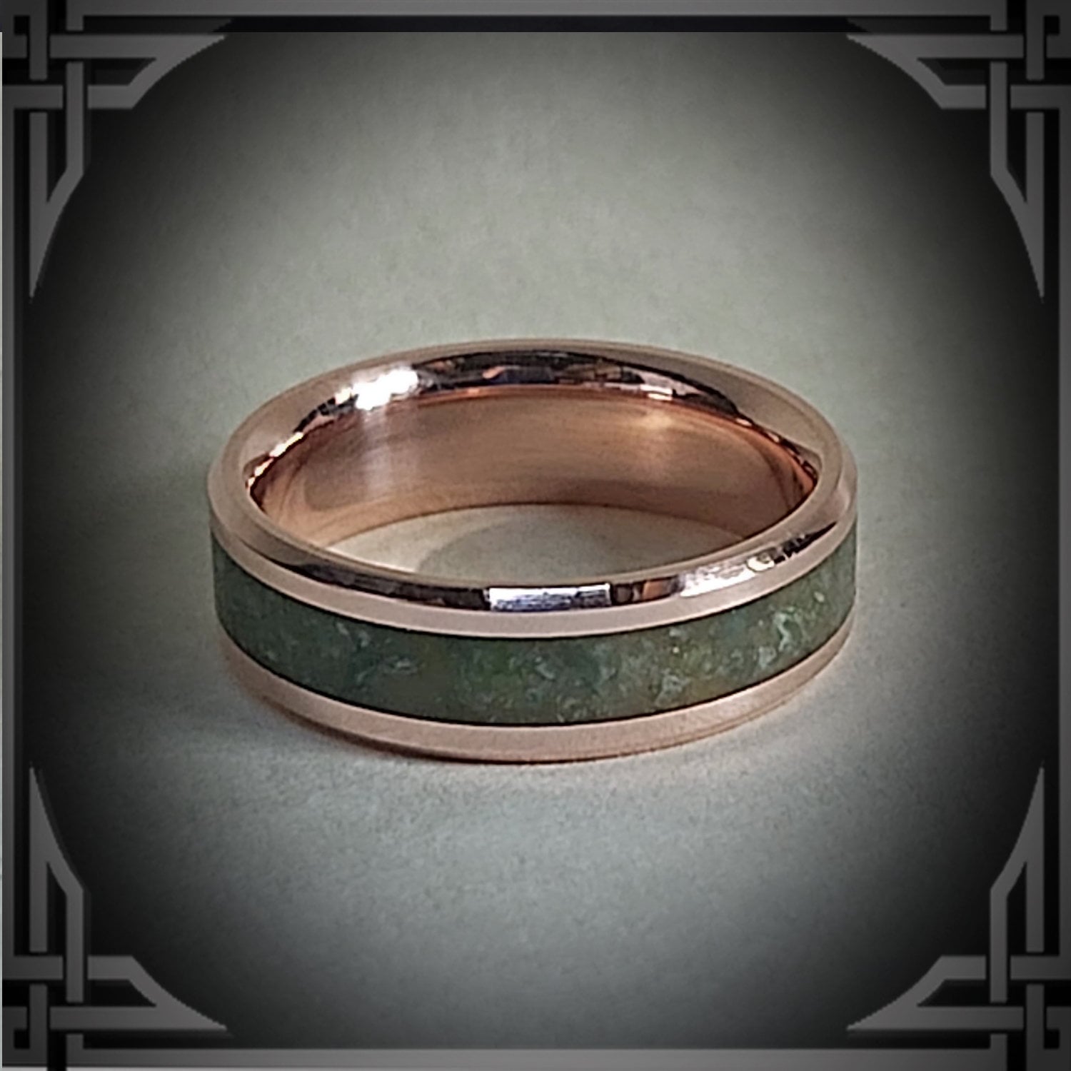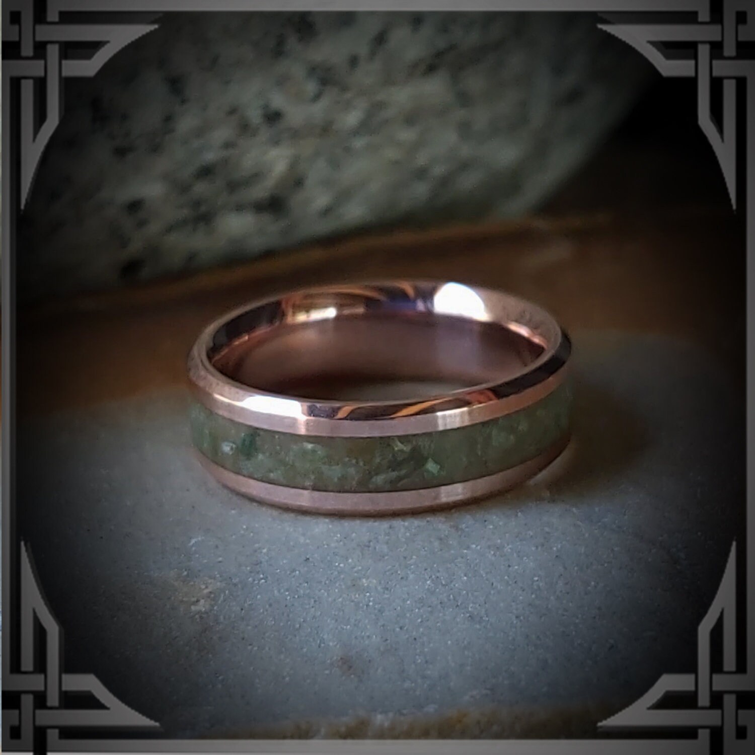 This ring is hand cast by us from 14K Rose Gold, with a Wide Groove B.C. Green Jade Stone Inlay.