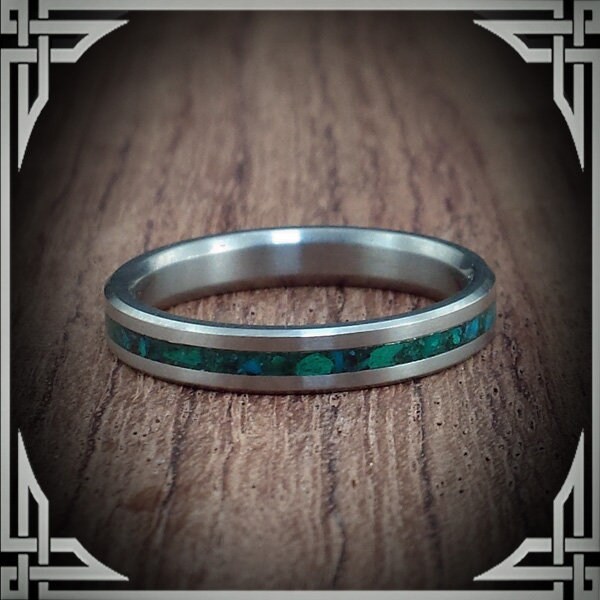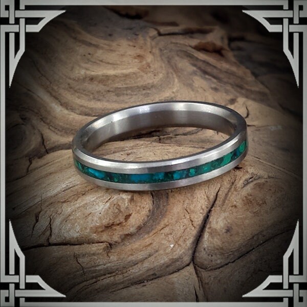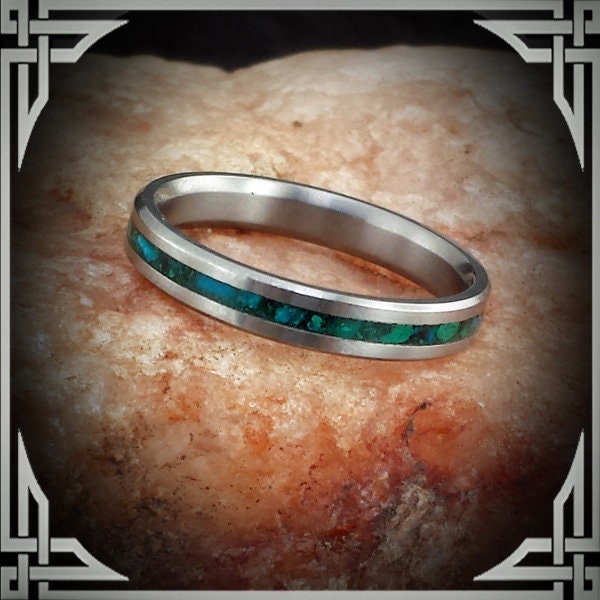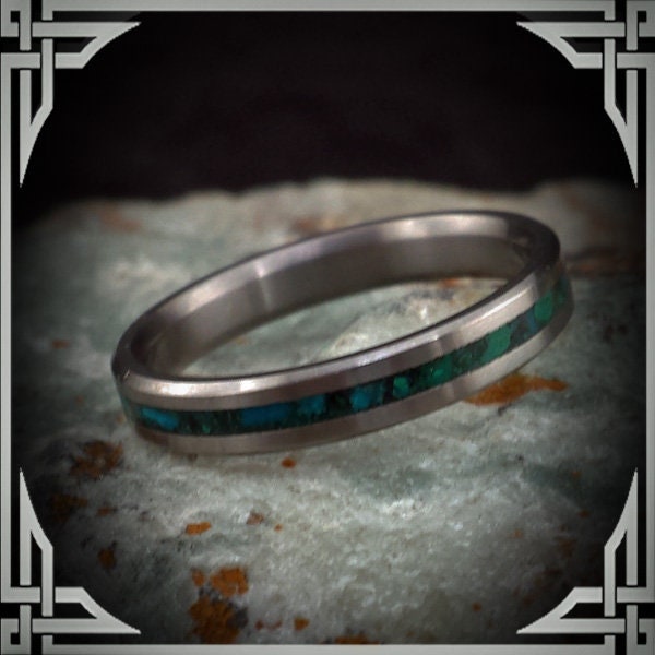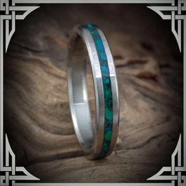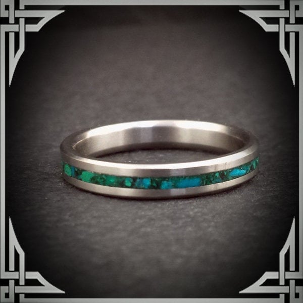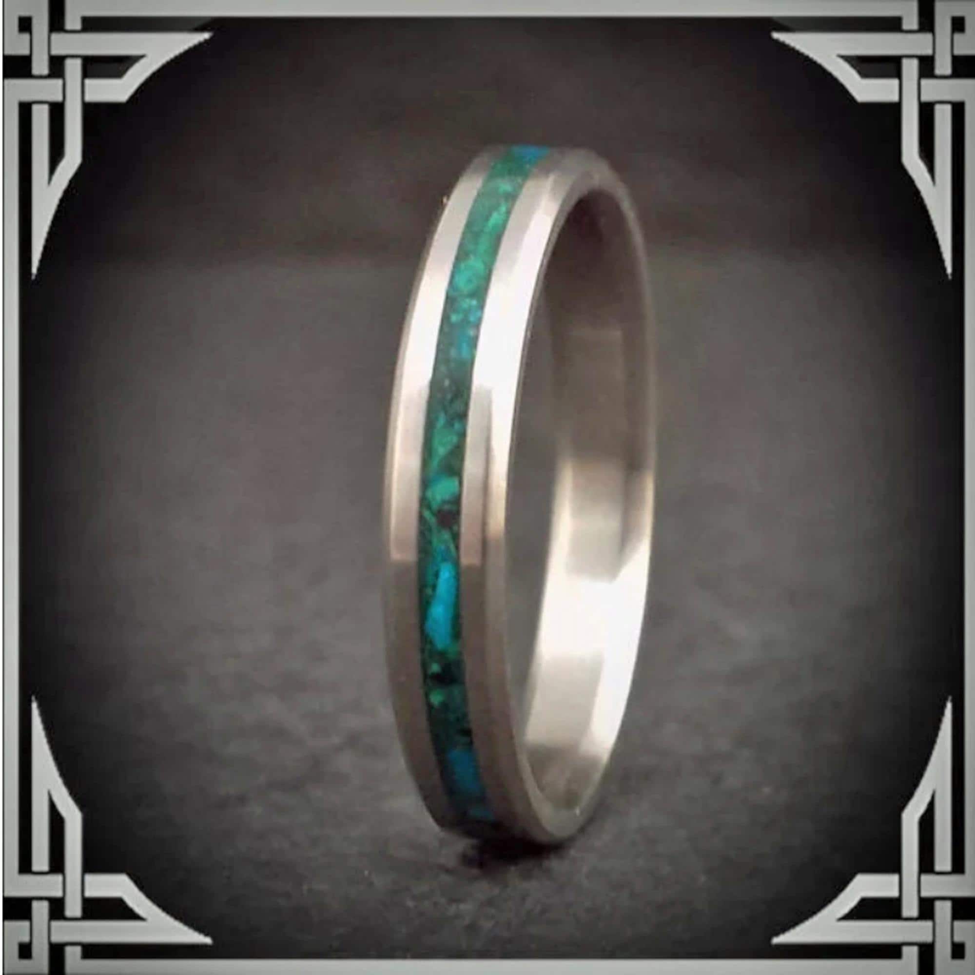 This Beautiful Thin ring is handmade in Canada from Titanium with a Chrysocolla Stone Inlay.