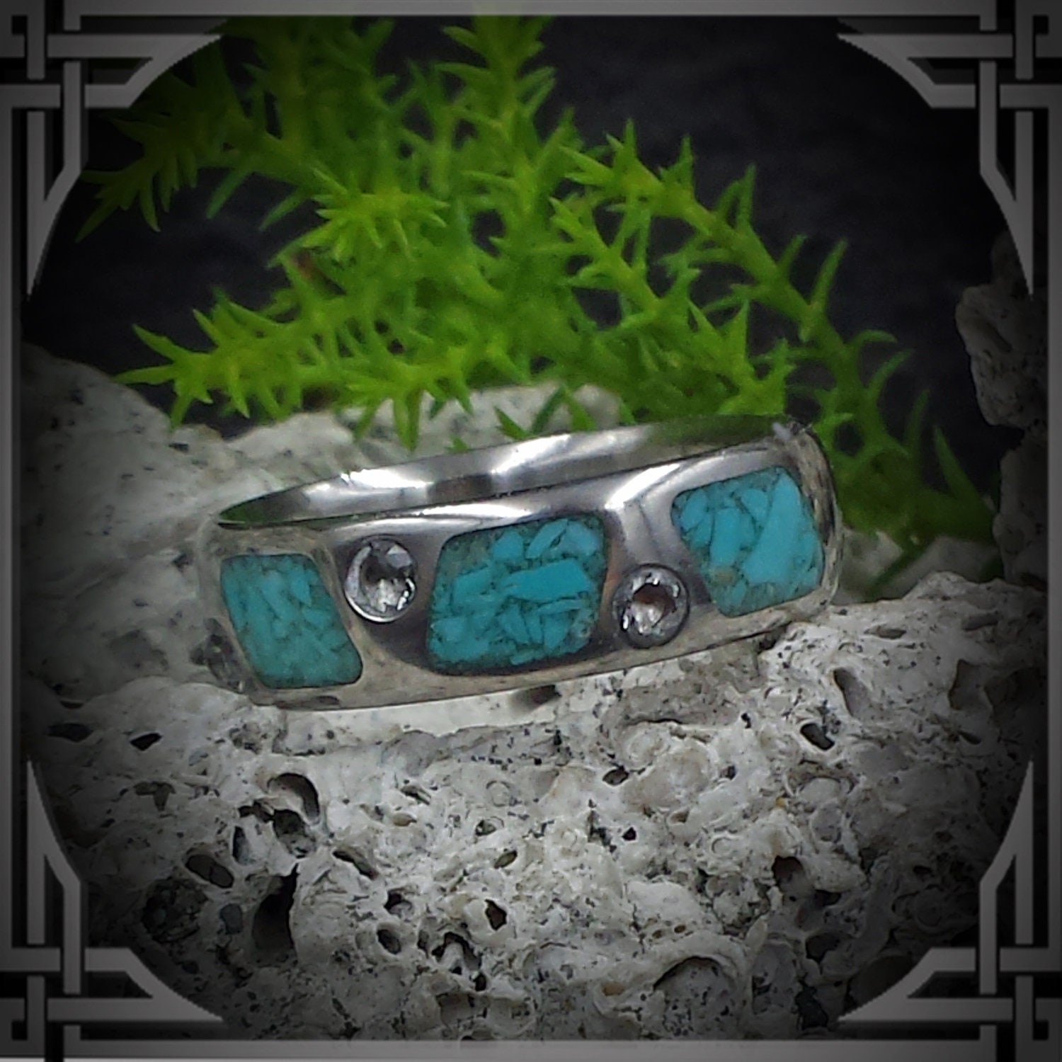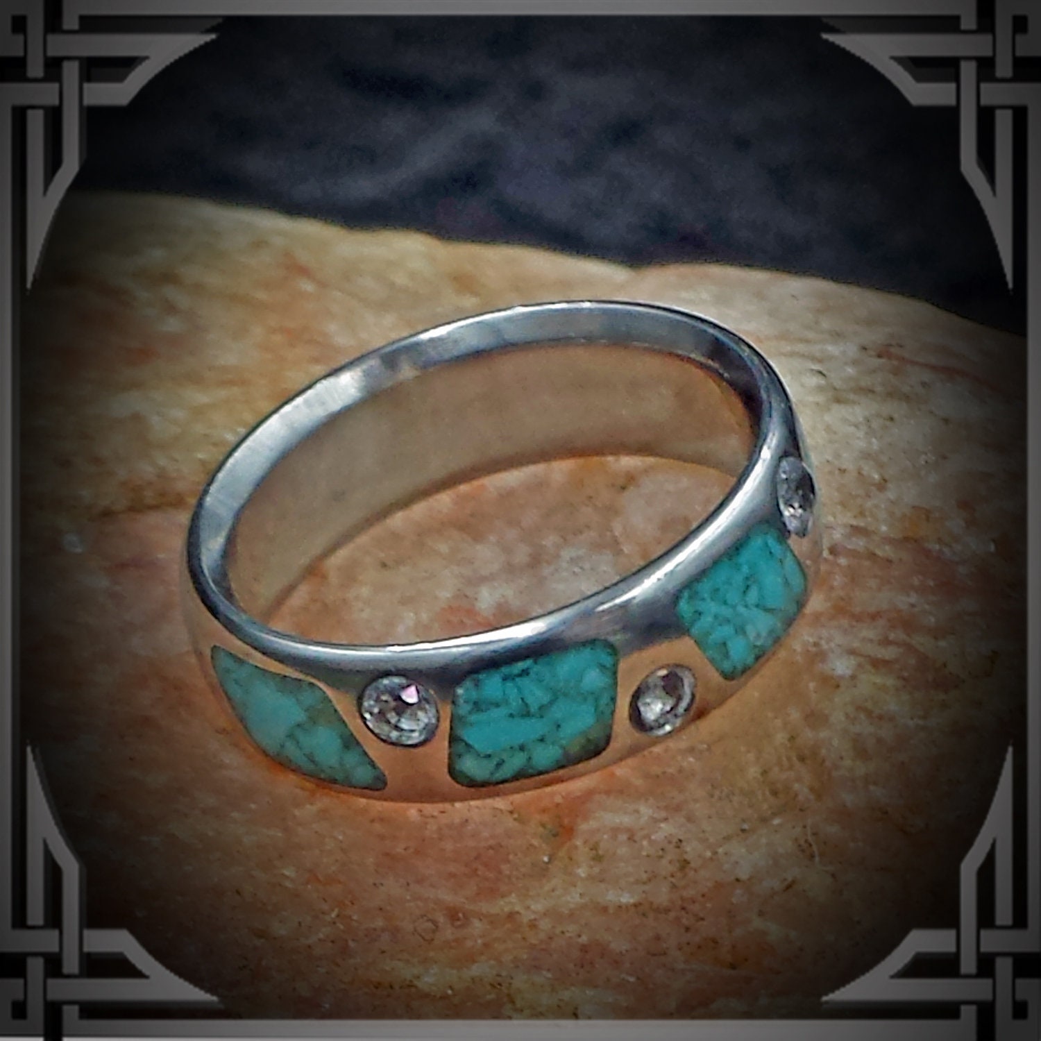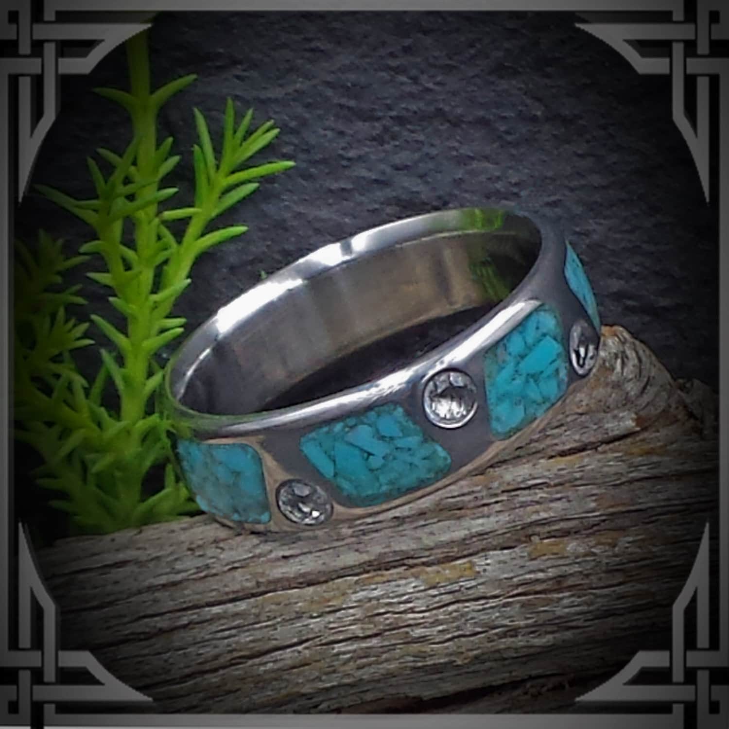 This ring is made from Titanium with a Turquoise Stone Inlay Pattern and 6 White Sapphires.