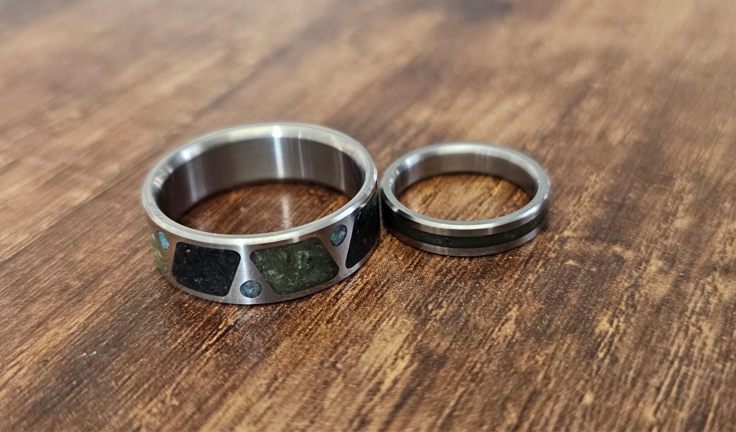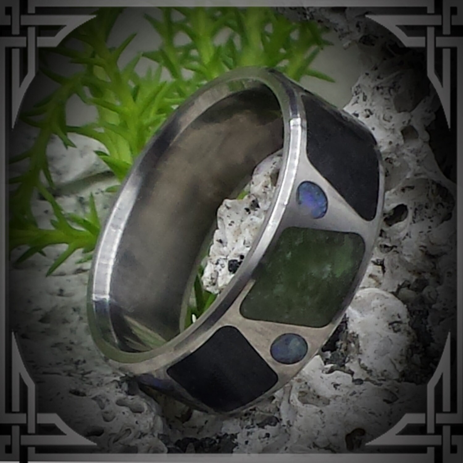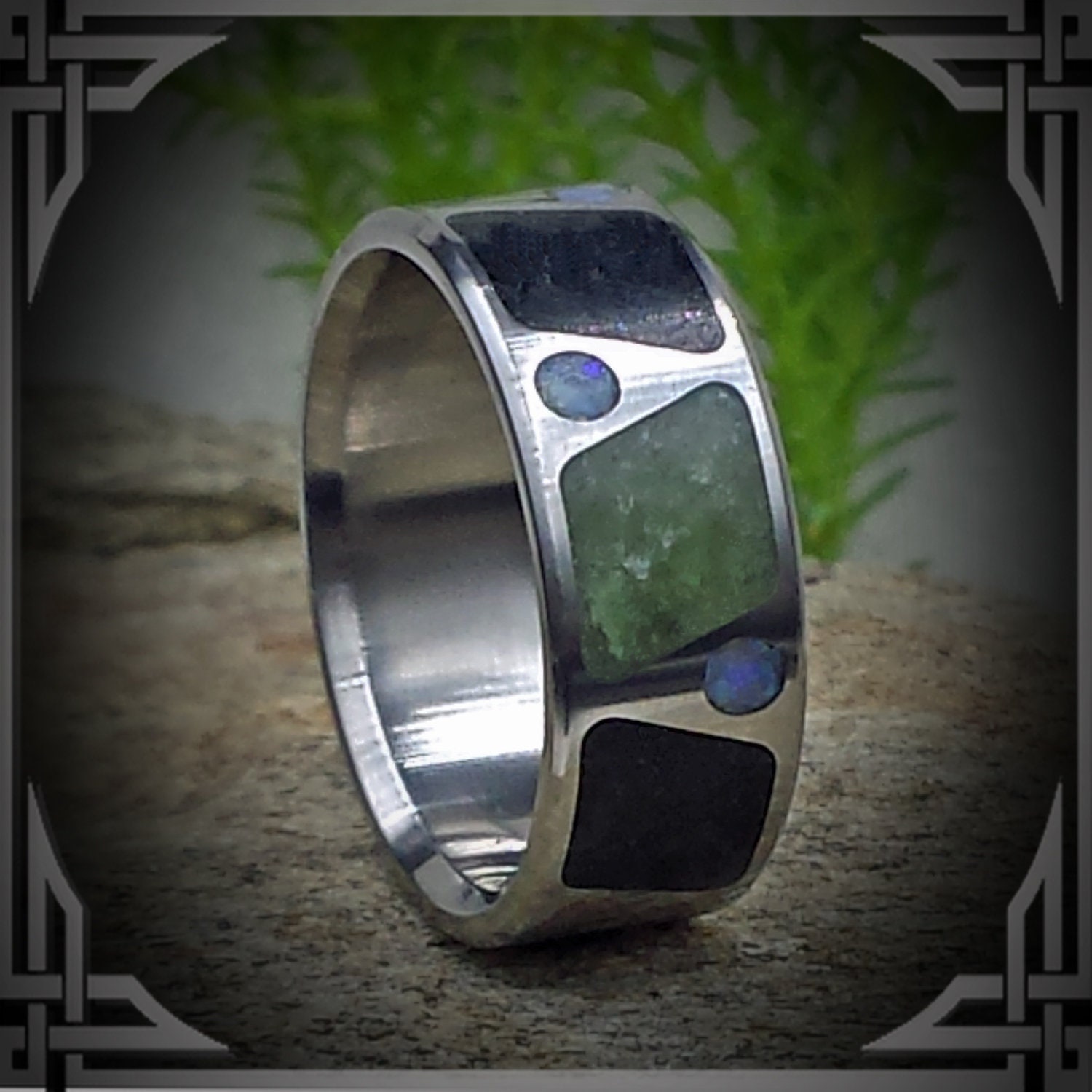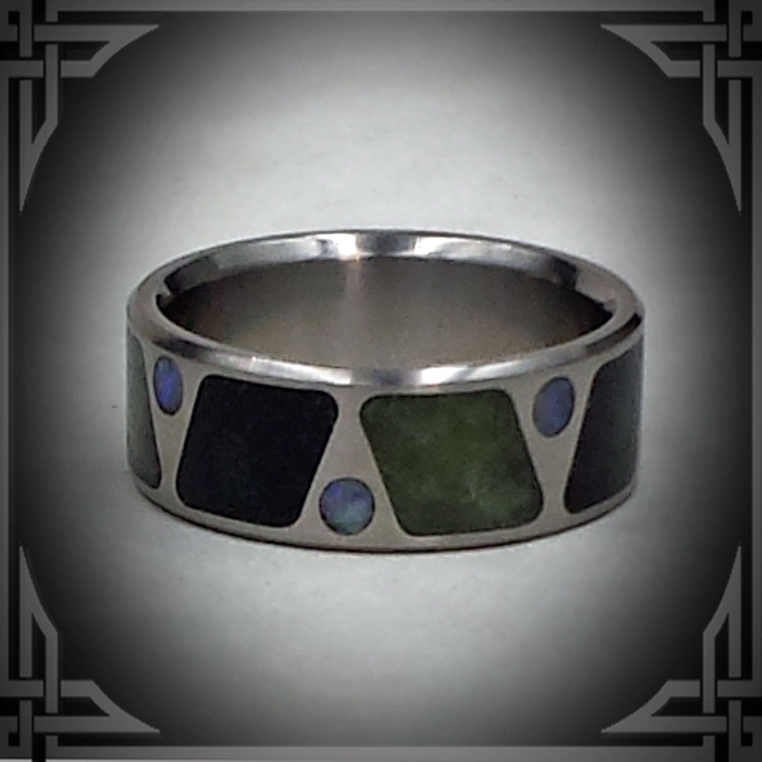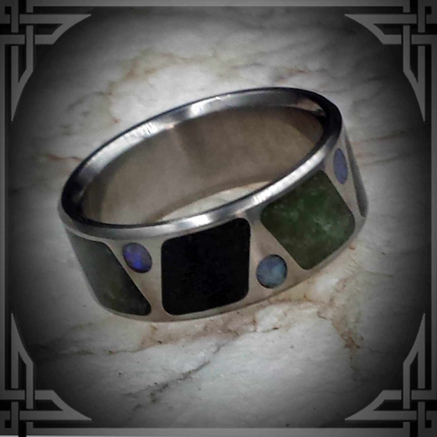 This ring is made from Titanium Ring with BC Black Jade & Green Jade Inlay With Australian Opal.