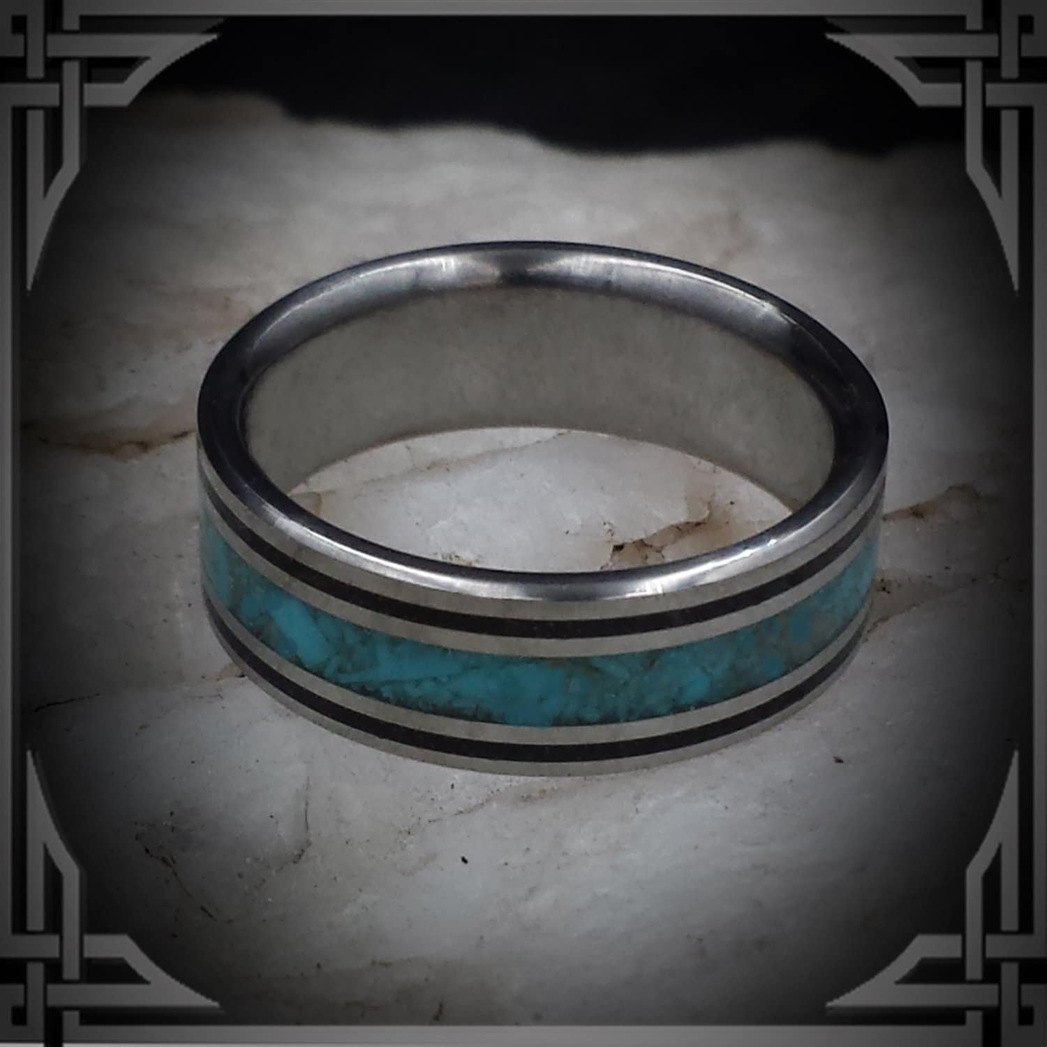 This ring is made from Titanium with Sleeping Beauty Turquoise and Black Jade Inlays.