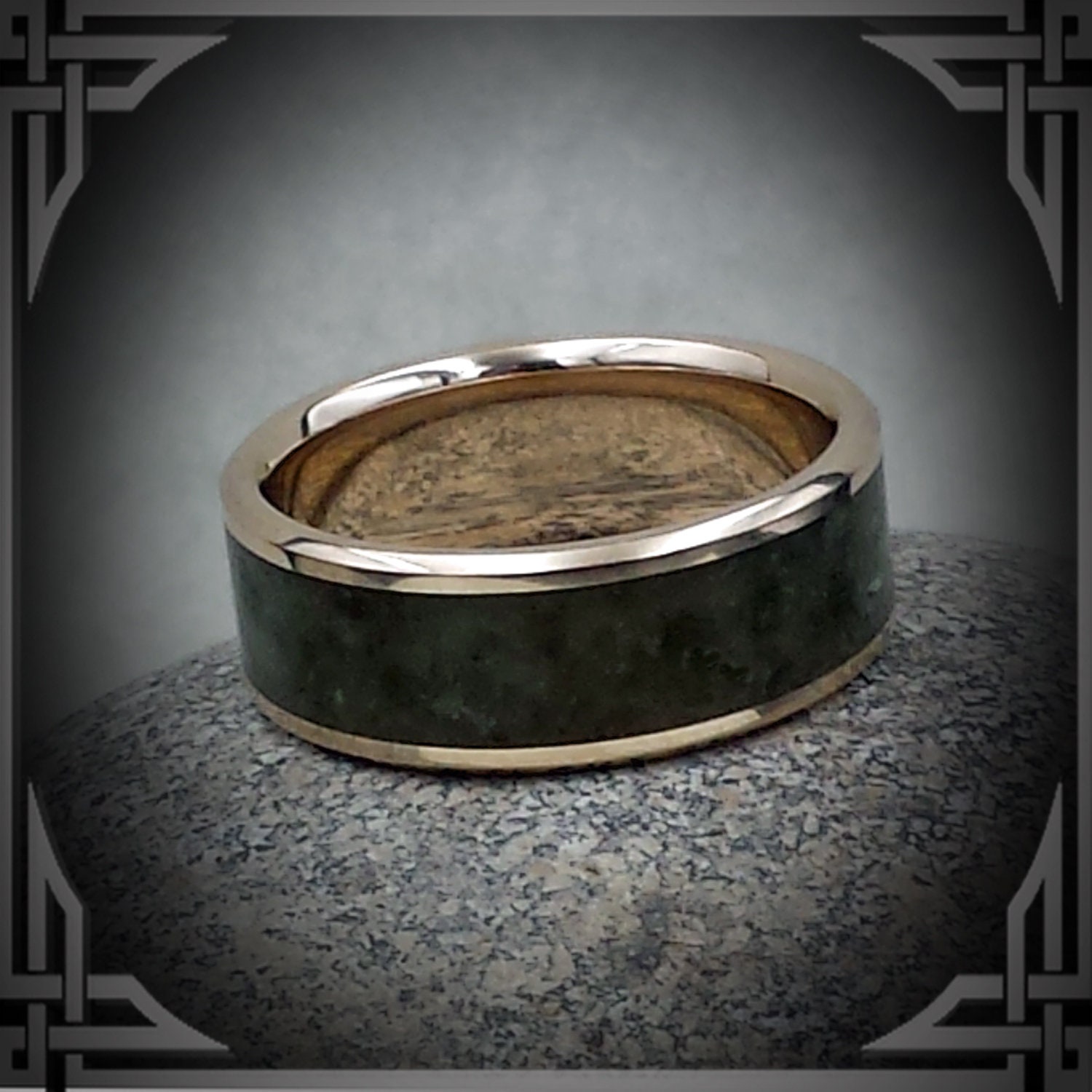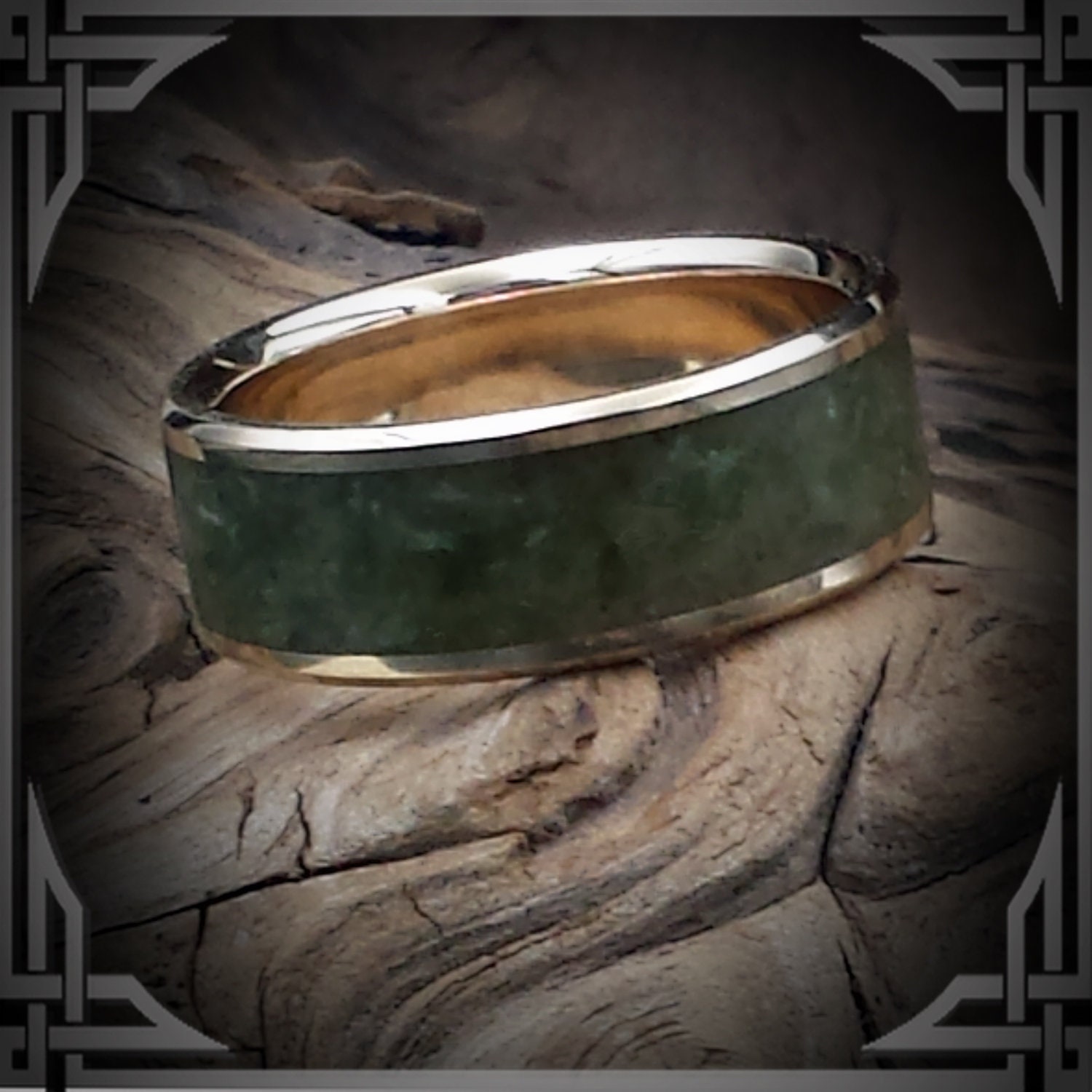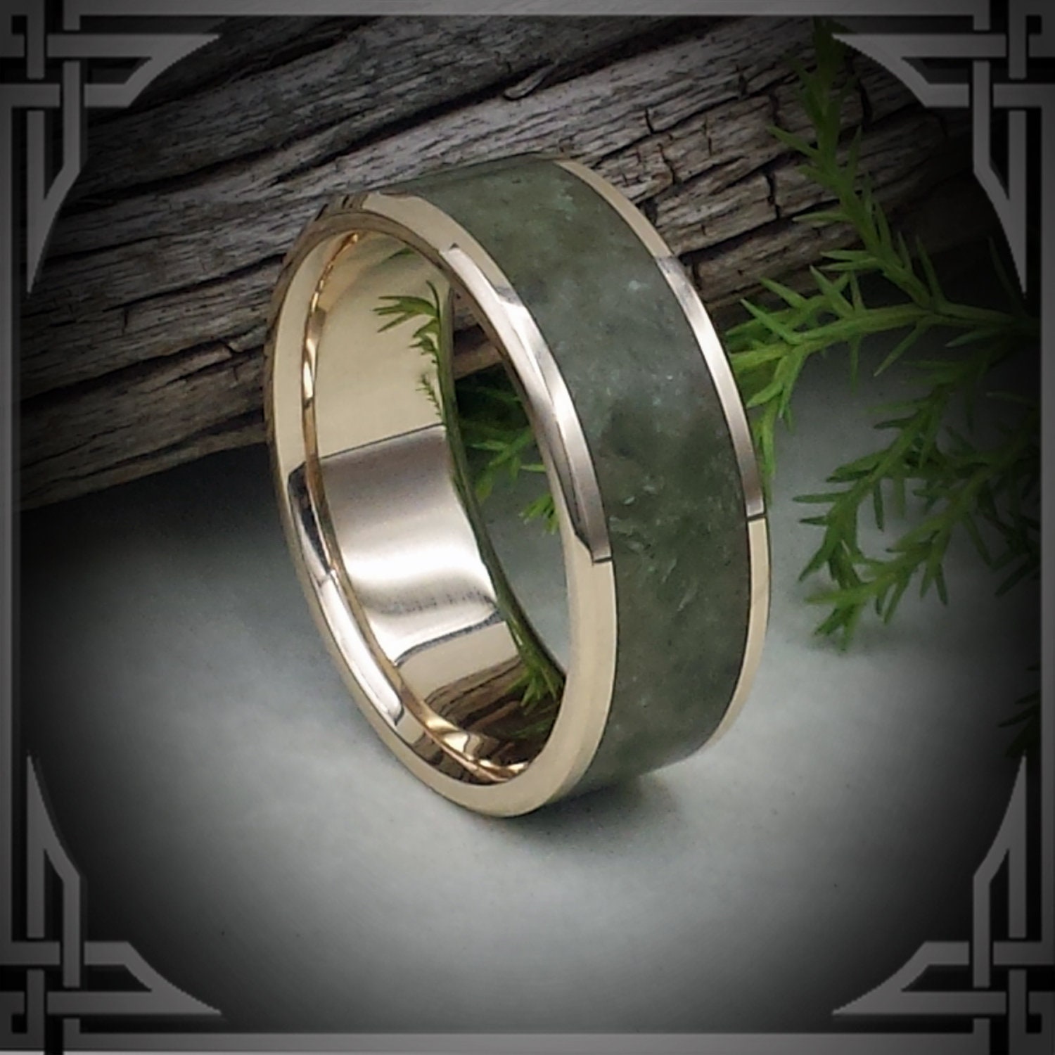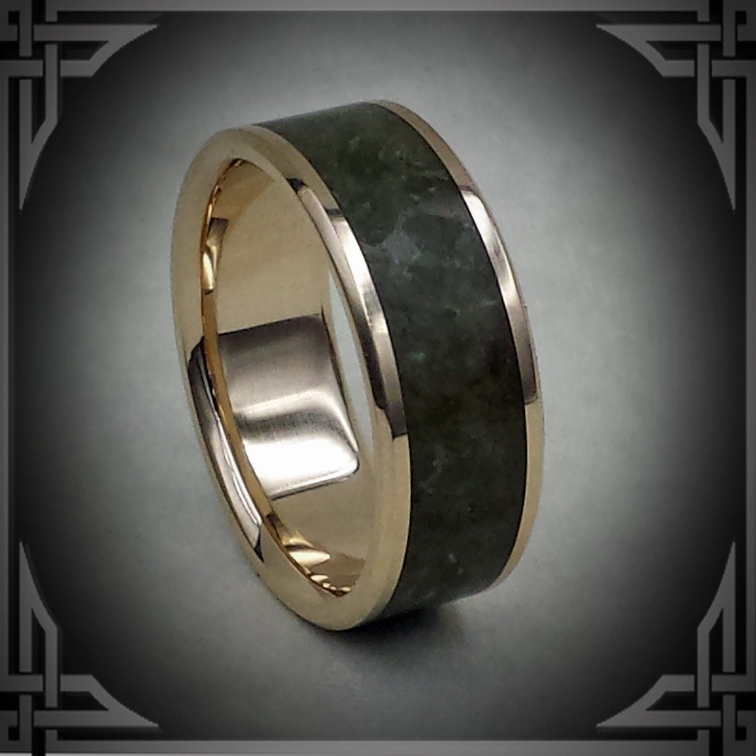 This ring is hand cast by us from 14 Karat Yellow Gold with a Wide Green Jade Stone Inlay.